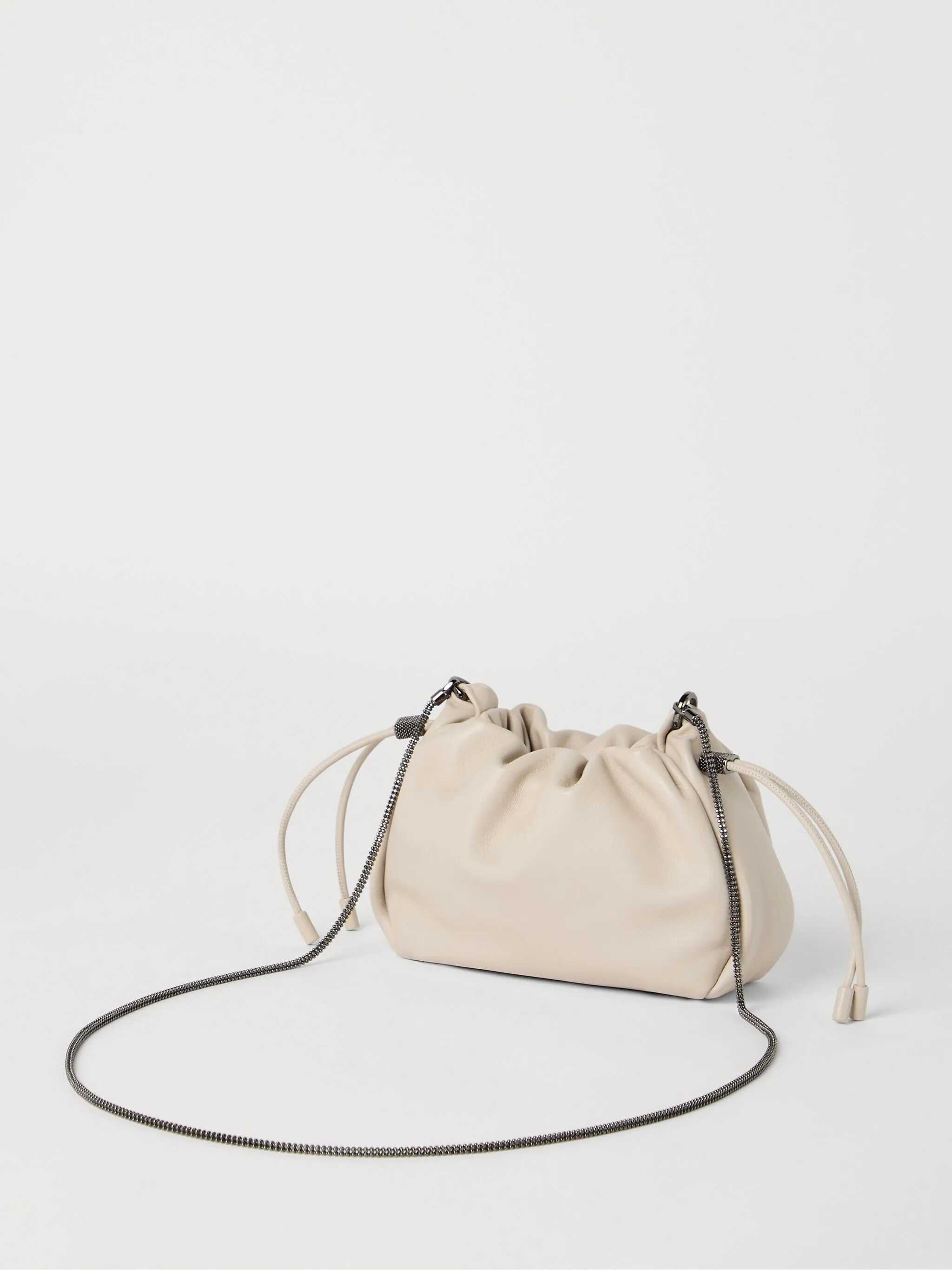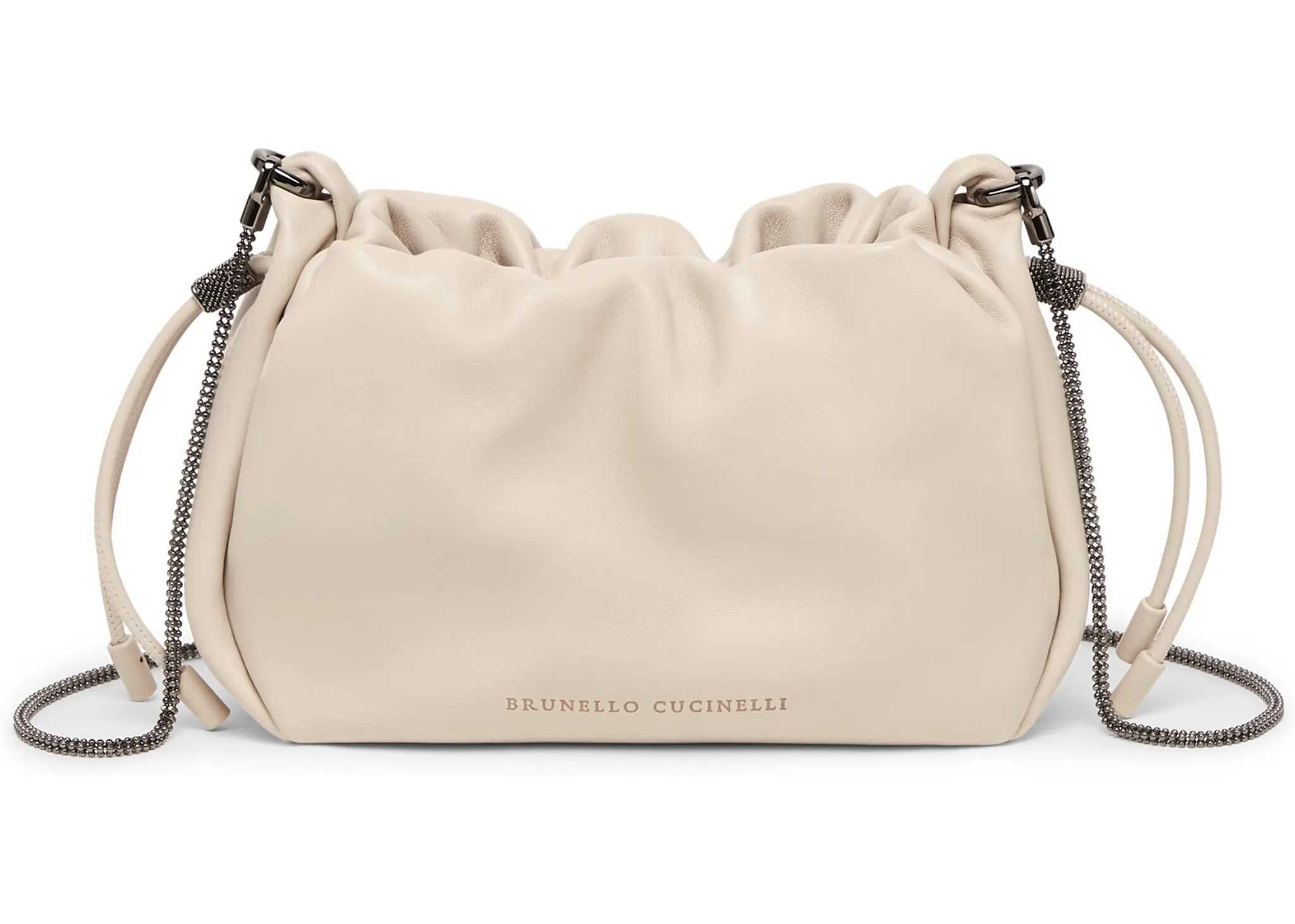 Brunello Cucinelli's Bucket Mellow Mini leather Shoulder Bag is a sophisticated and distinctive accessory. The shoulder strap, composed of four strands of iconic shiny jewelry, adds a touch of luxury and uniqueness to the design. The top drawstring closure offers practicality and security, while the iconic monogram printed on the front gives an exclusive detail. Inside, the bag features a single compartment, ideal for storing essentials.