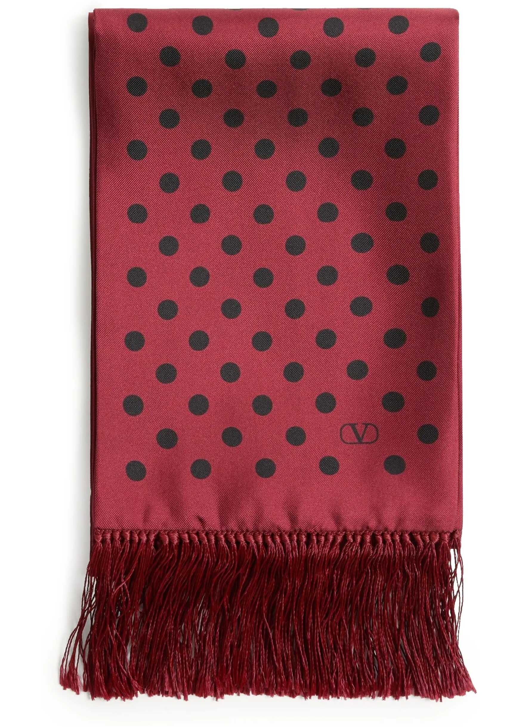 Valentino Garavani's Silk Scarf features a refined polka-dot pattern that adds a touch of understated elegance. The frayed bottom completes the design, giving it a unique style detail. Made from high-quality silk, it is perfect for adding a sophisticated and versatile touch to any outfit.
