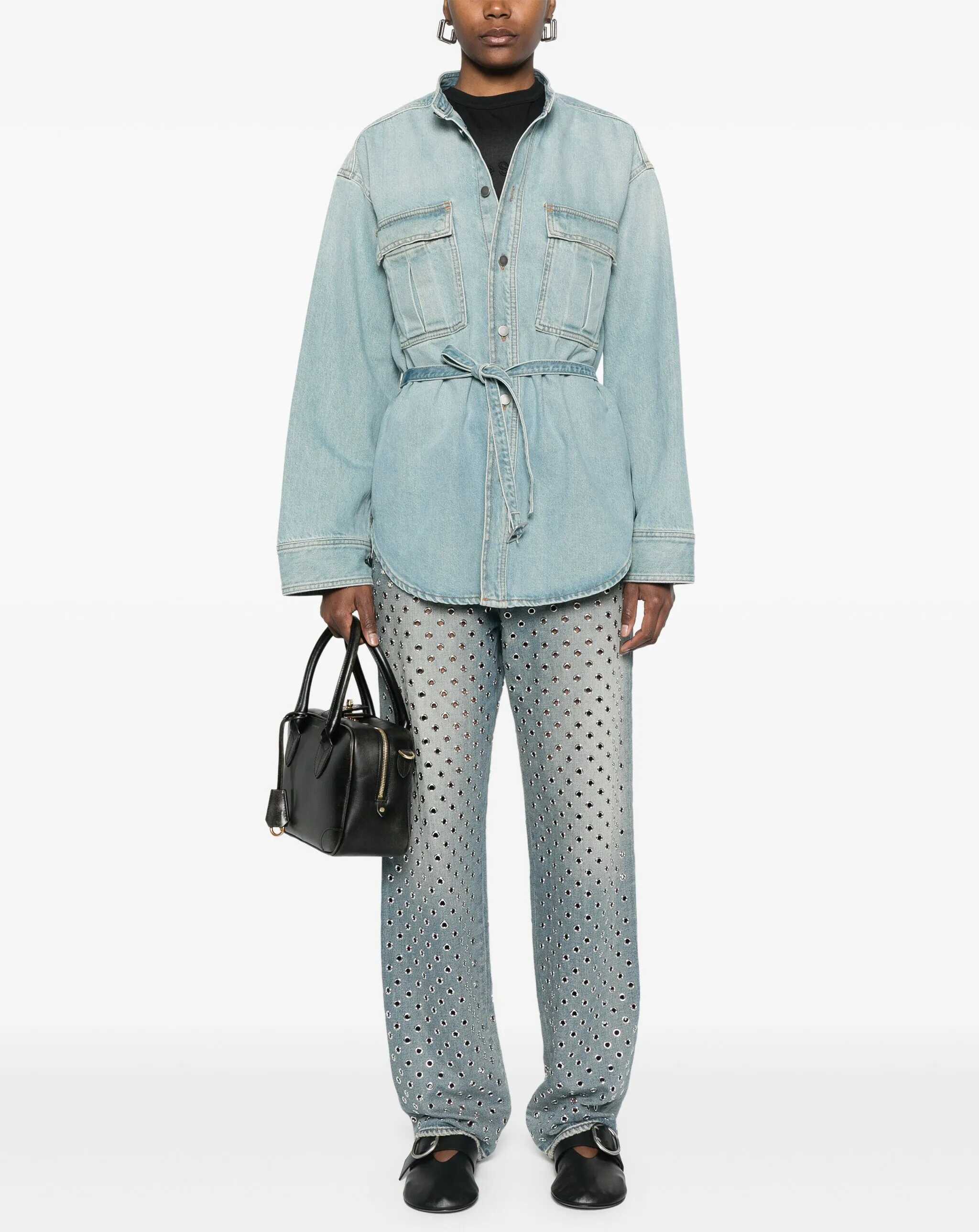 Golden Goose's Kim Jeans are a bold and sophisticated piece, featuring a hidden front button placket that gives a clean, minimalist look. Loops at the waistband allow you to add a belt, while the five-pocket design ensures practicality. Studded with round studs, these jeans add a touch of rock and originality, perfect for those seeking a gritty and distinctive look.