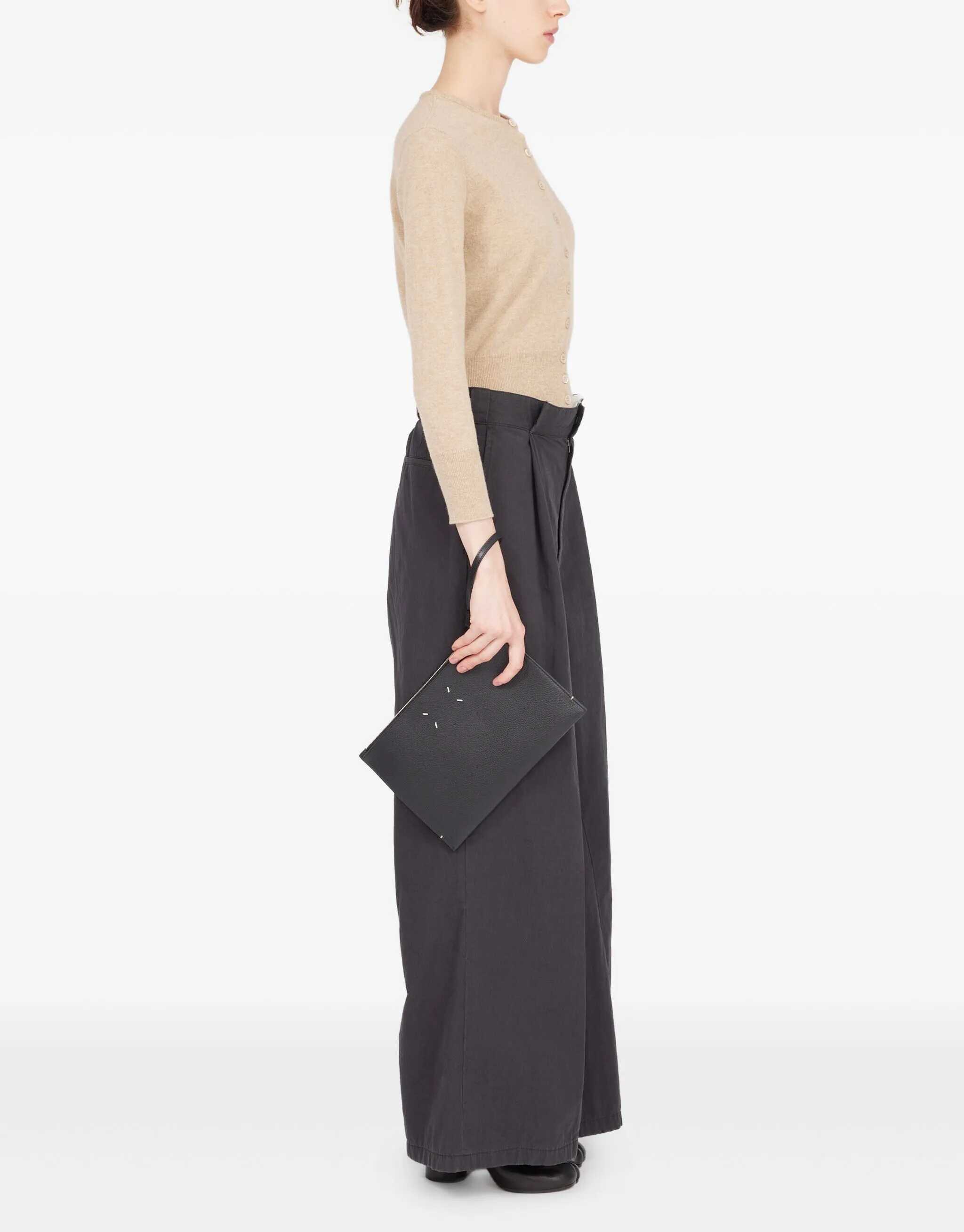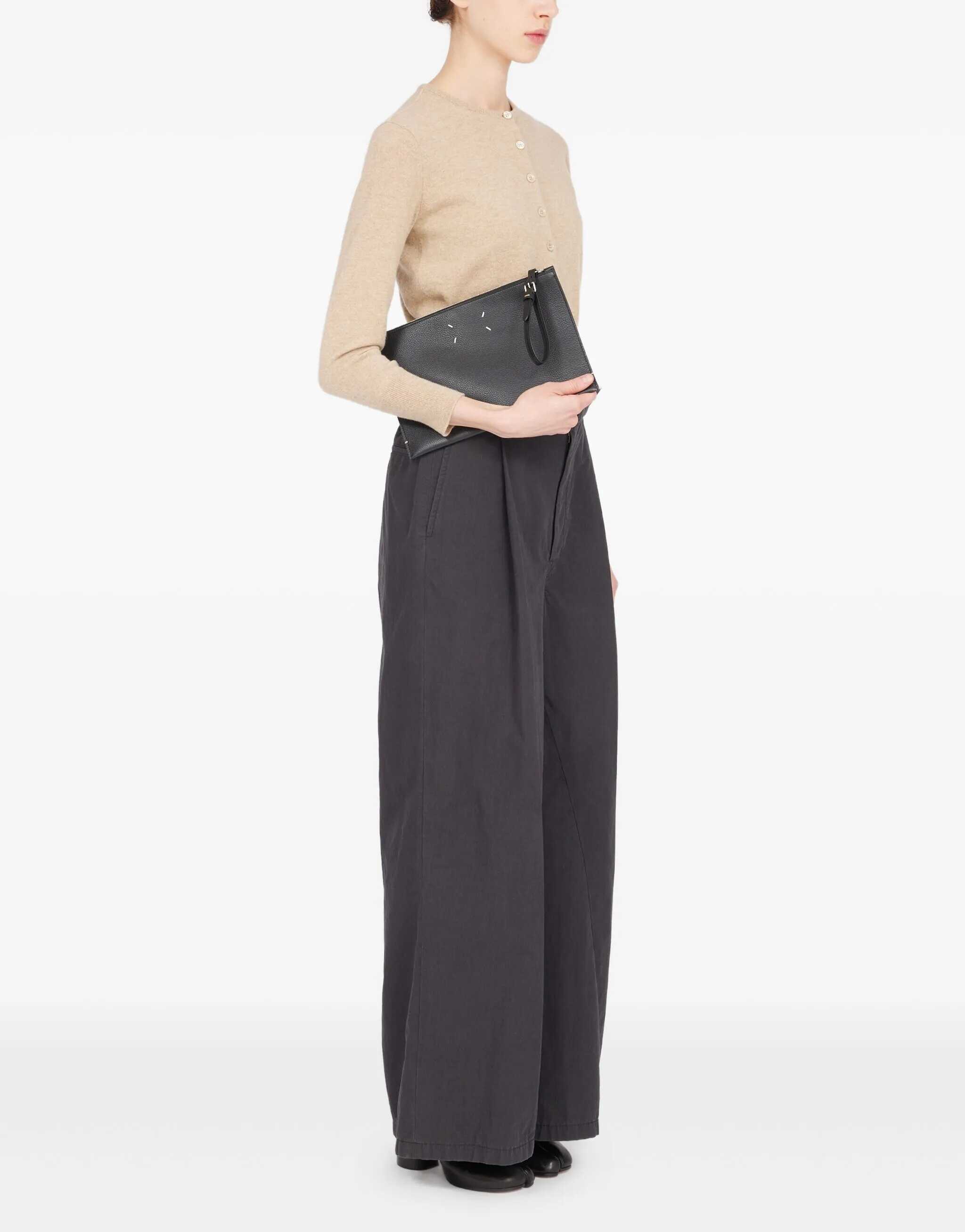 Maison Margiela's Leather Pouch is an essential accessory with a strong character. Featuring a practical zipper closure, it is distinguished by the silver-colored script logo on the front, which adds a bright, contemporary touch. On the back, iconic contrasting white topstitching recalls the Maison's unmistakable aesthetic. A loop handle completes the design, combining functionality and minimalist style.
