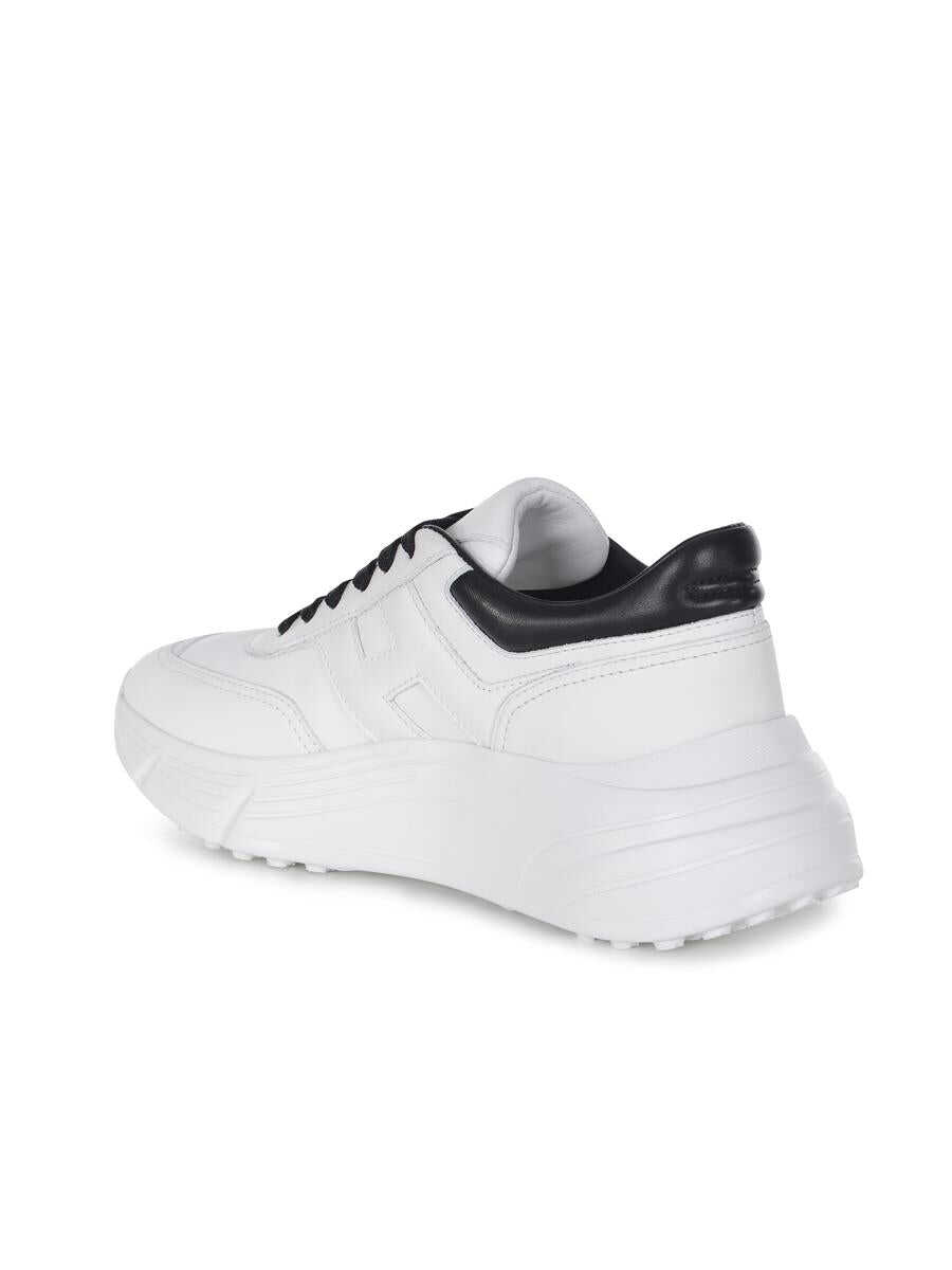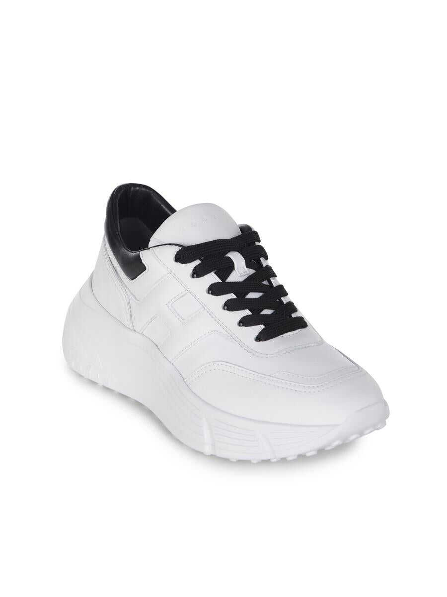 Hogan "Hi-Fi" sneakers made of white leather. Round toe. Lace-up. Contrasting black lace. Lettering logo on the tongue. "H" logo on the side. Black leather mesh. Fussbett in memory foam. Raised platform. Hyperlight sole with studs. Fussbett in 8mm memory foam Total height 6.5cm Sole