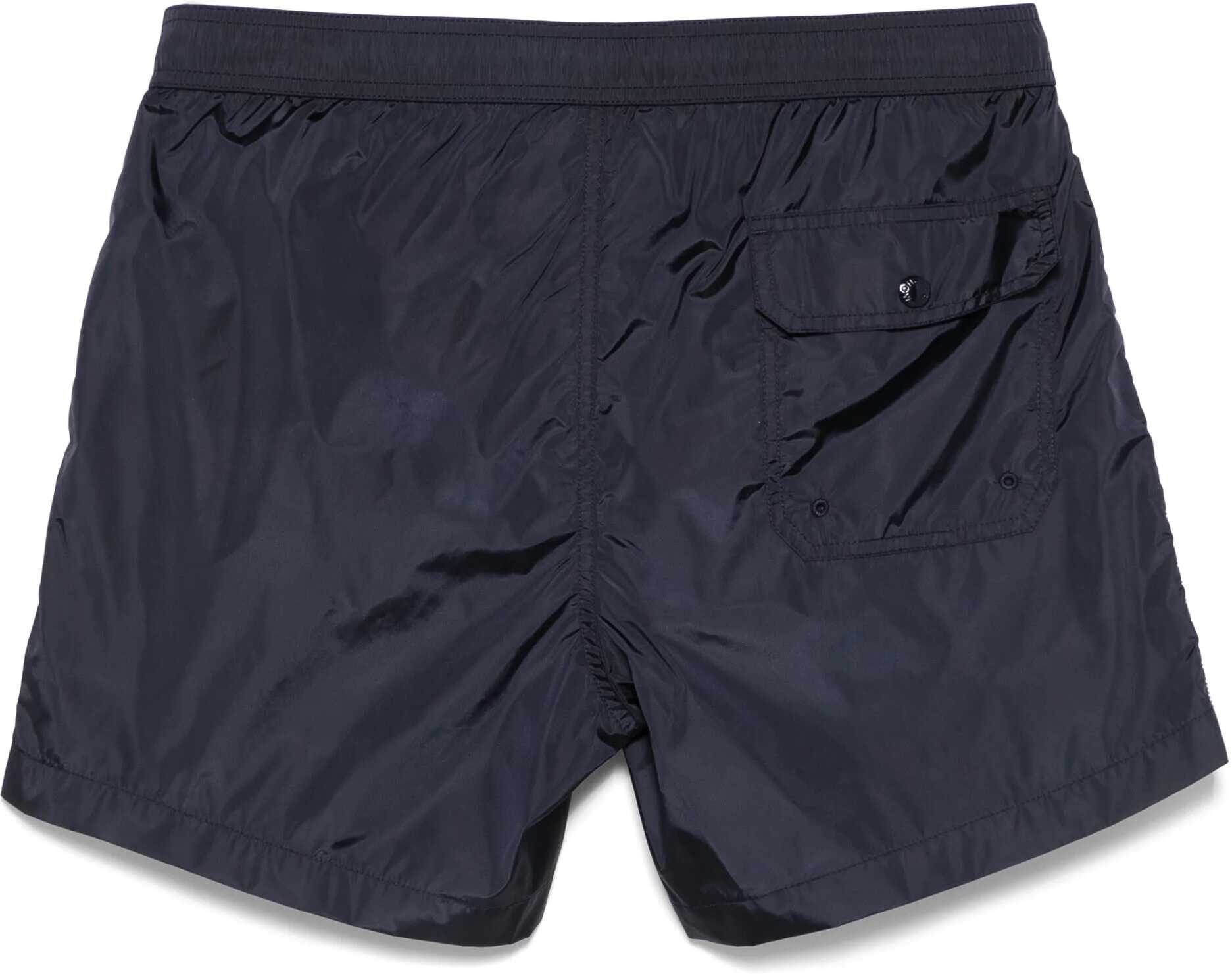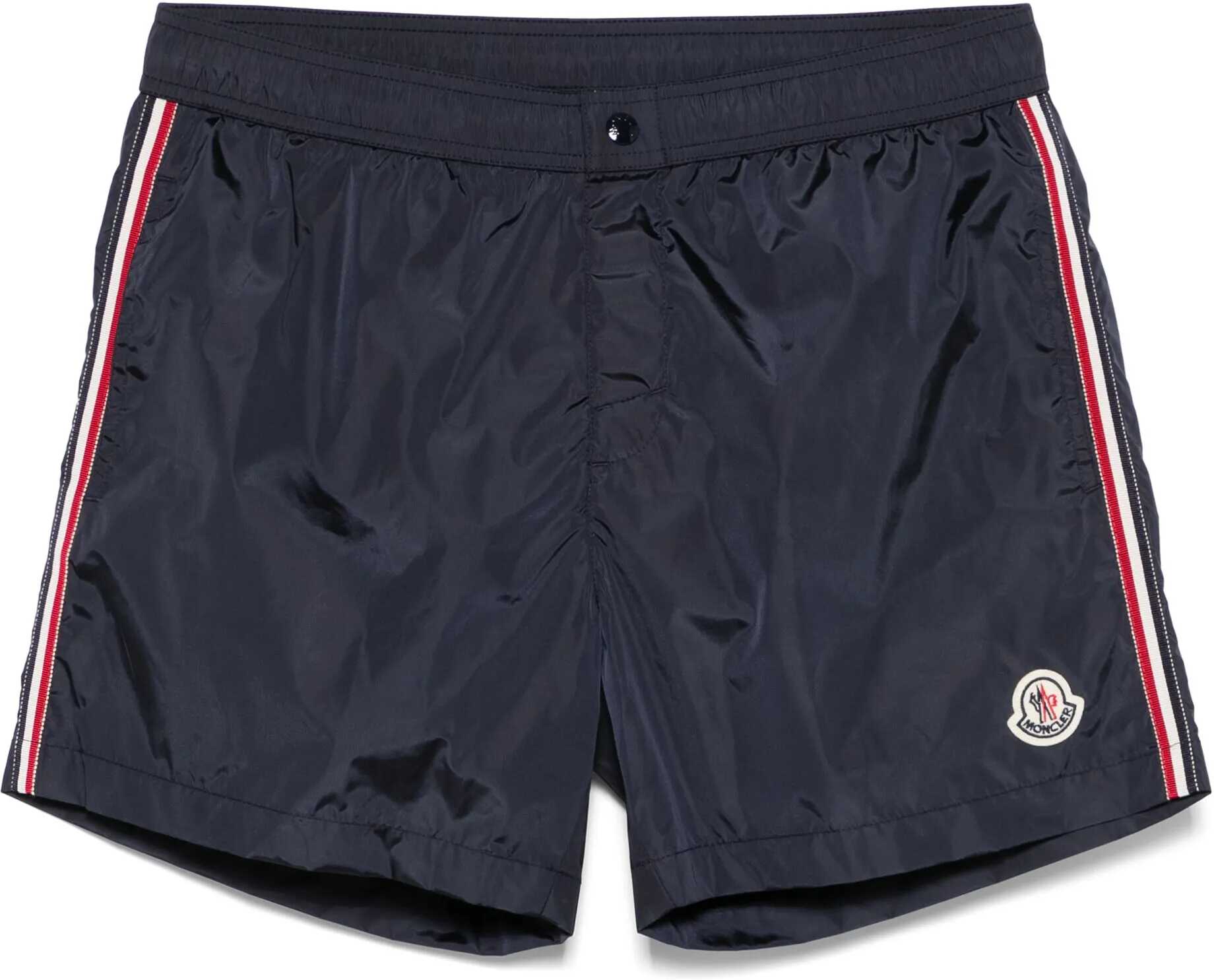 Navy blue nylon swim trunks. They feature an elasticated waistband with a drawstring, a snap button opening, and a Velcro fly, with red, white, and blue stripe details on the sides, two side pockets, a Moncler patch on the left leg, and a back pocket with a flap and snap button. Regular fit.