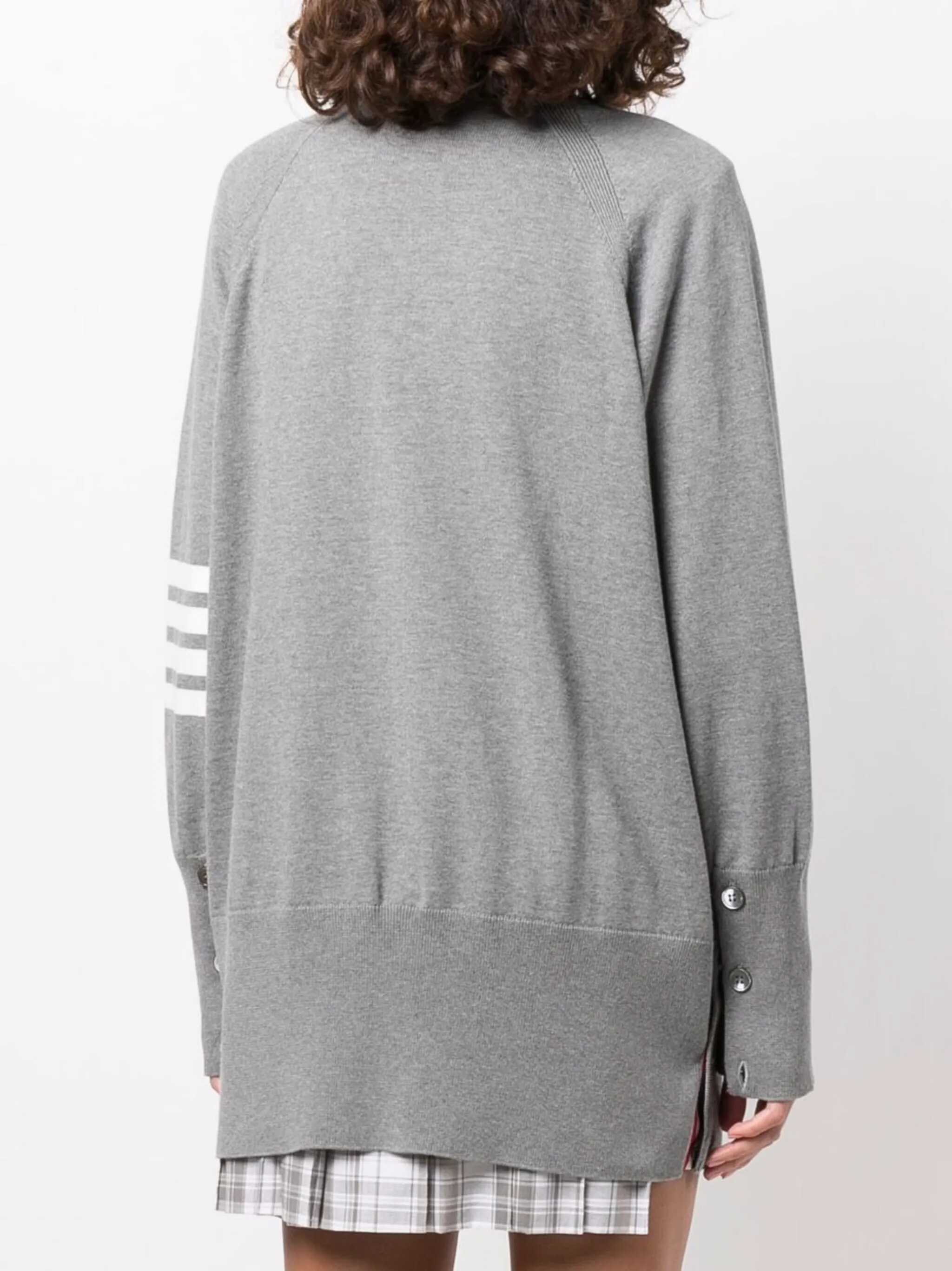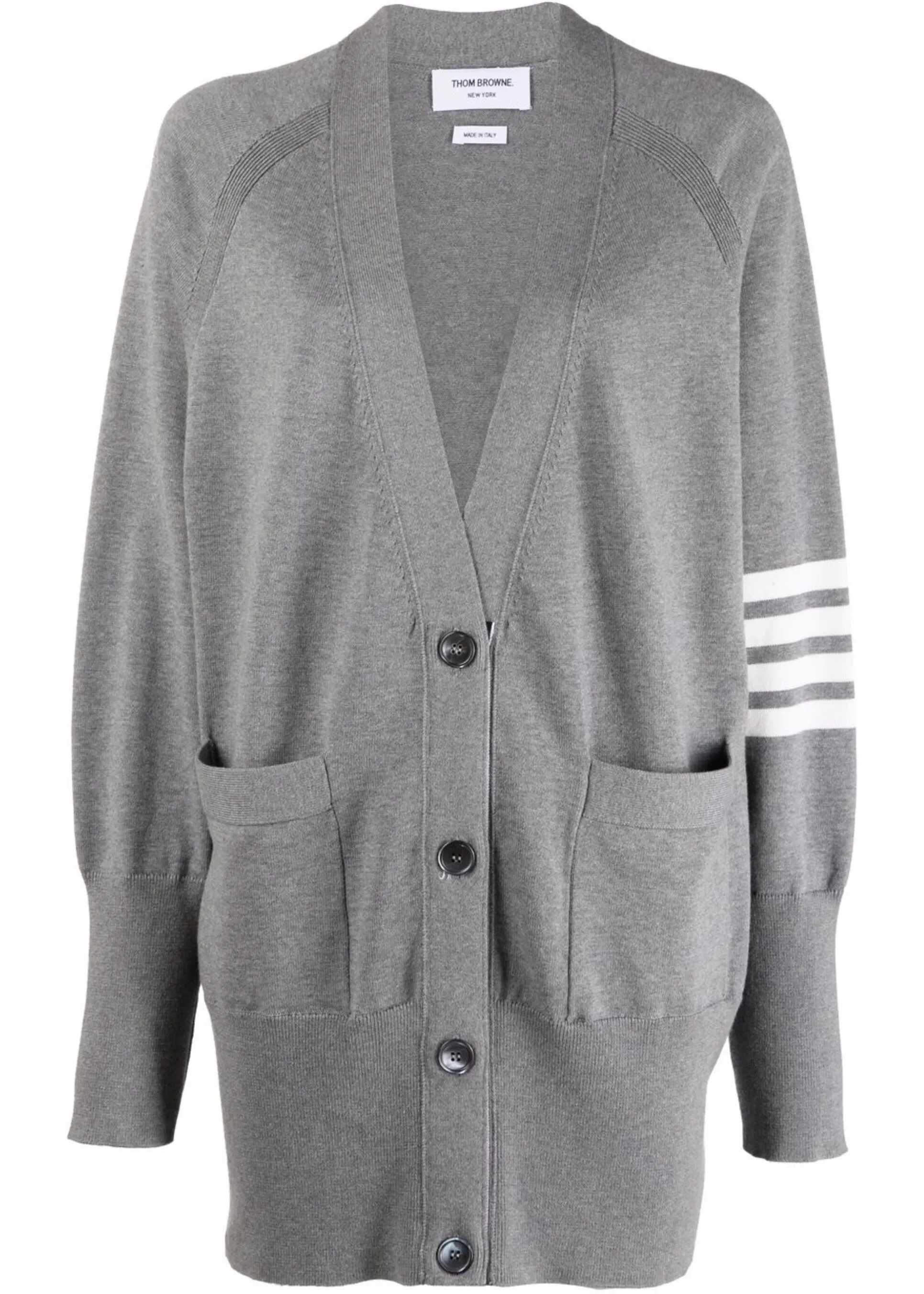 Thom Browne's oversized Cardigan features an elegant V-neck and front button closure. The garment is embellished with a striped grosgrain detail under the placket and raglan shoulders, enhancing its contemporary design. The distinctive white 4-Bar detail on the left sleeve and striped grosgrain tab behind the collar add a distinctive touch. With two patch pockets on the front and ribbed trim, this cardigan combines style and comfort in a refined way.