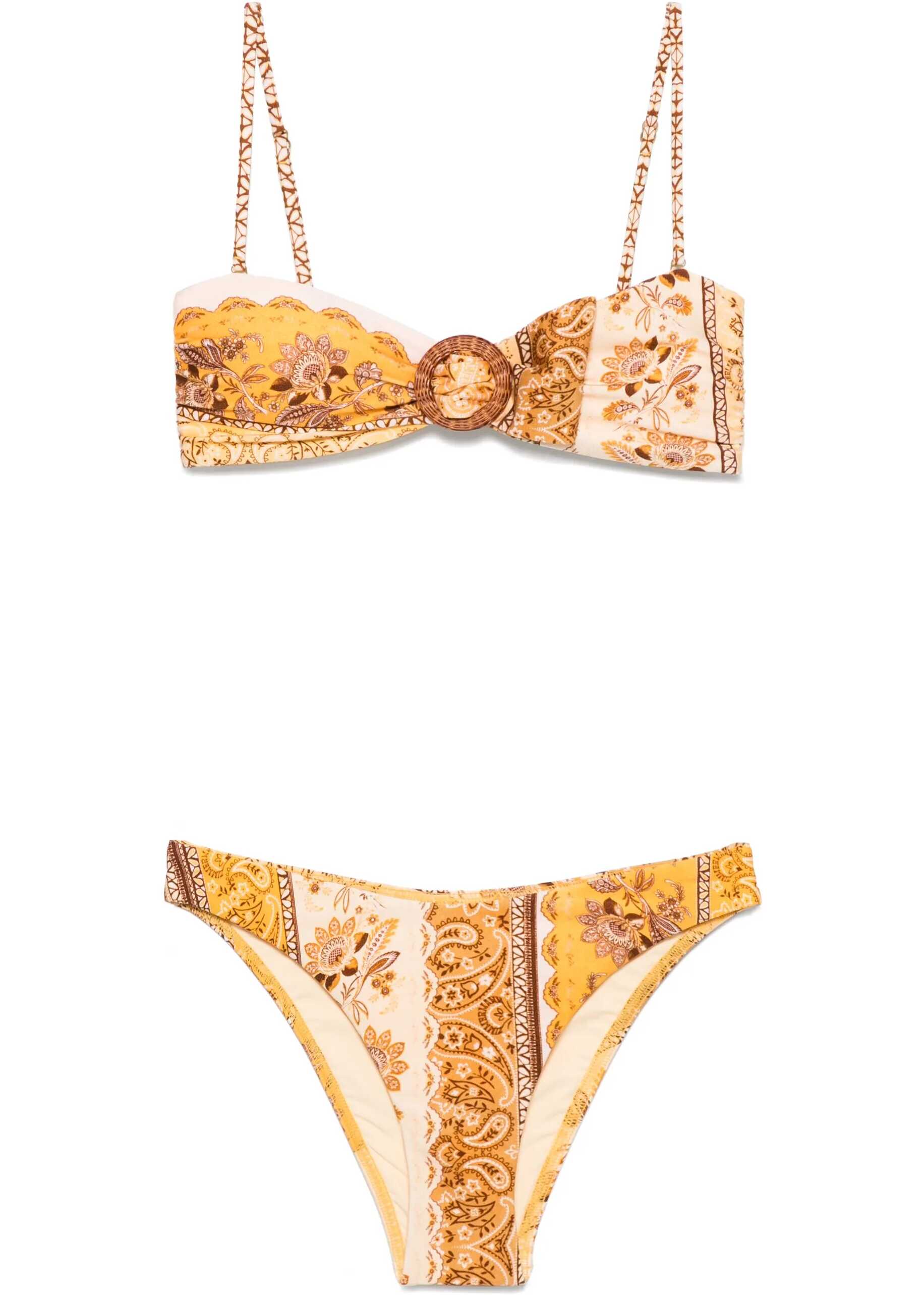 Zimmermann's Lucky Bamboo Swimsuit features an elegant front loop and adjustable straps for a customized fit. The clip-on closure provides optimal security, while the low-rise brief with medium coverage offers comfort and style. It is embellished with a vibrant bandana pattern, adding a fresh and original touch to the summer look.