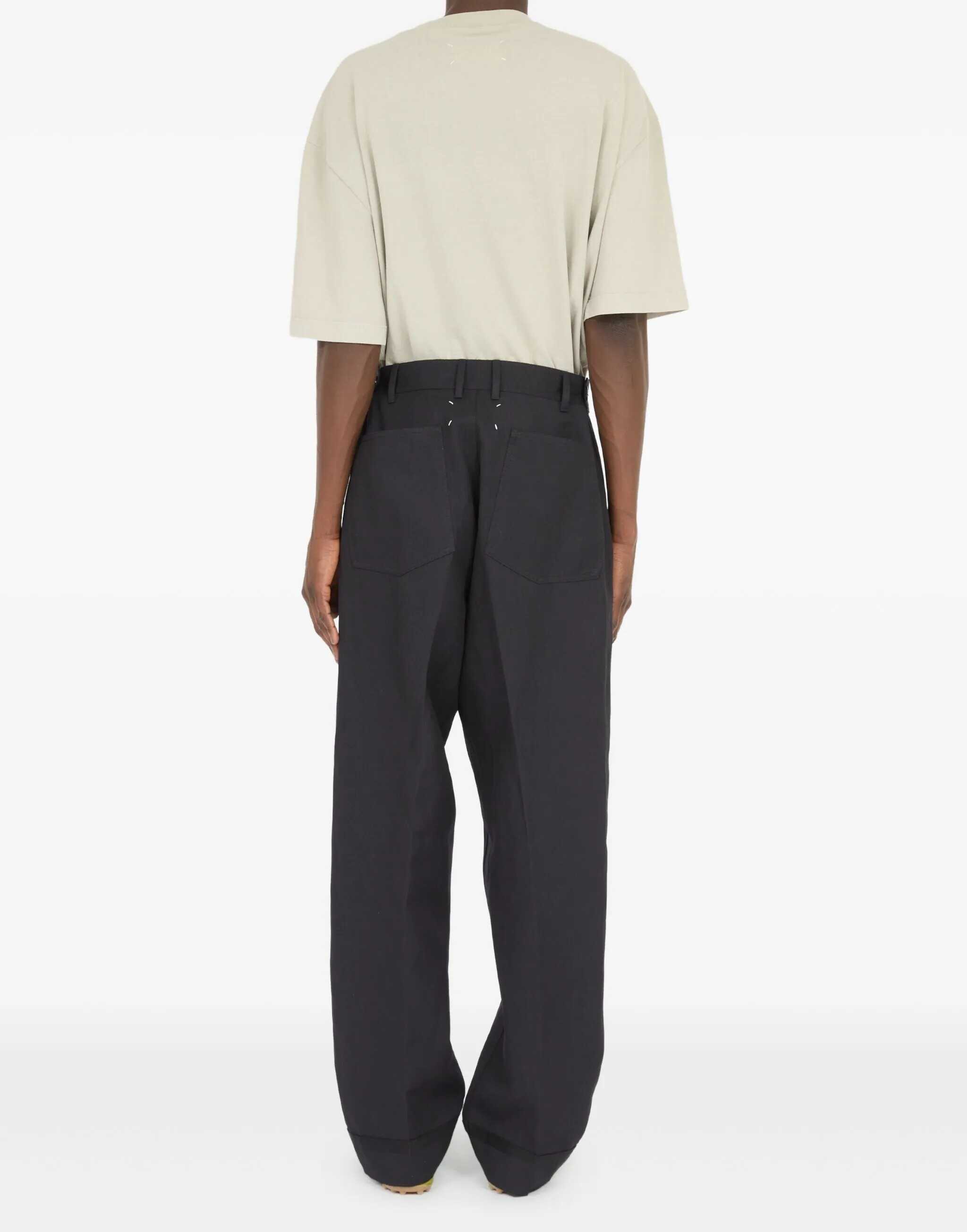 Margiela's Wool Pants blend classic tailoring and the brand's iconic details. Featuring a straight fit and a front zipper and button closure, they feature two side welt pockets, two patch pockets on the back and belt loops at the waist. Completing the design are the unmistakable contrast stitching embroidered on the back, the Maison's discreet yet recognizable signature.