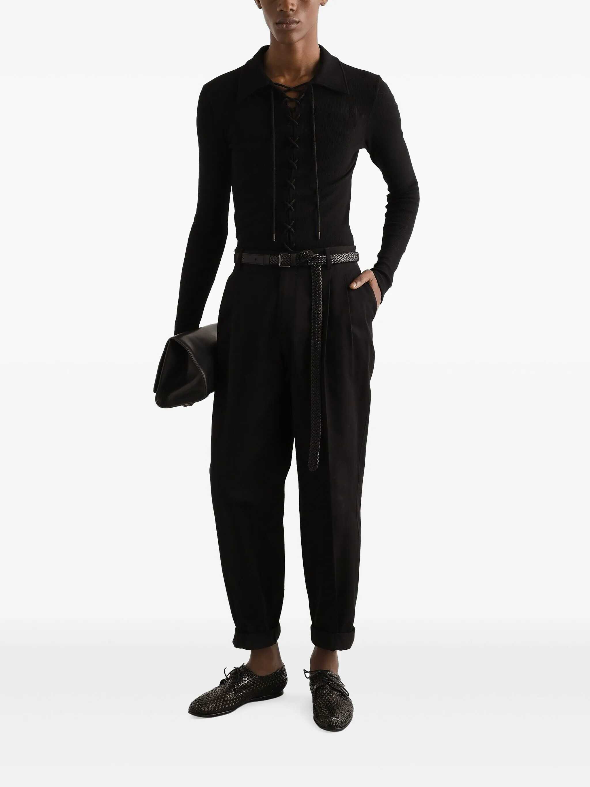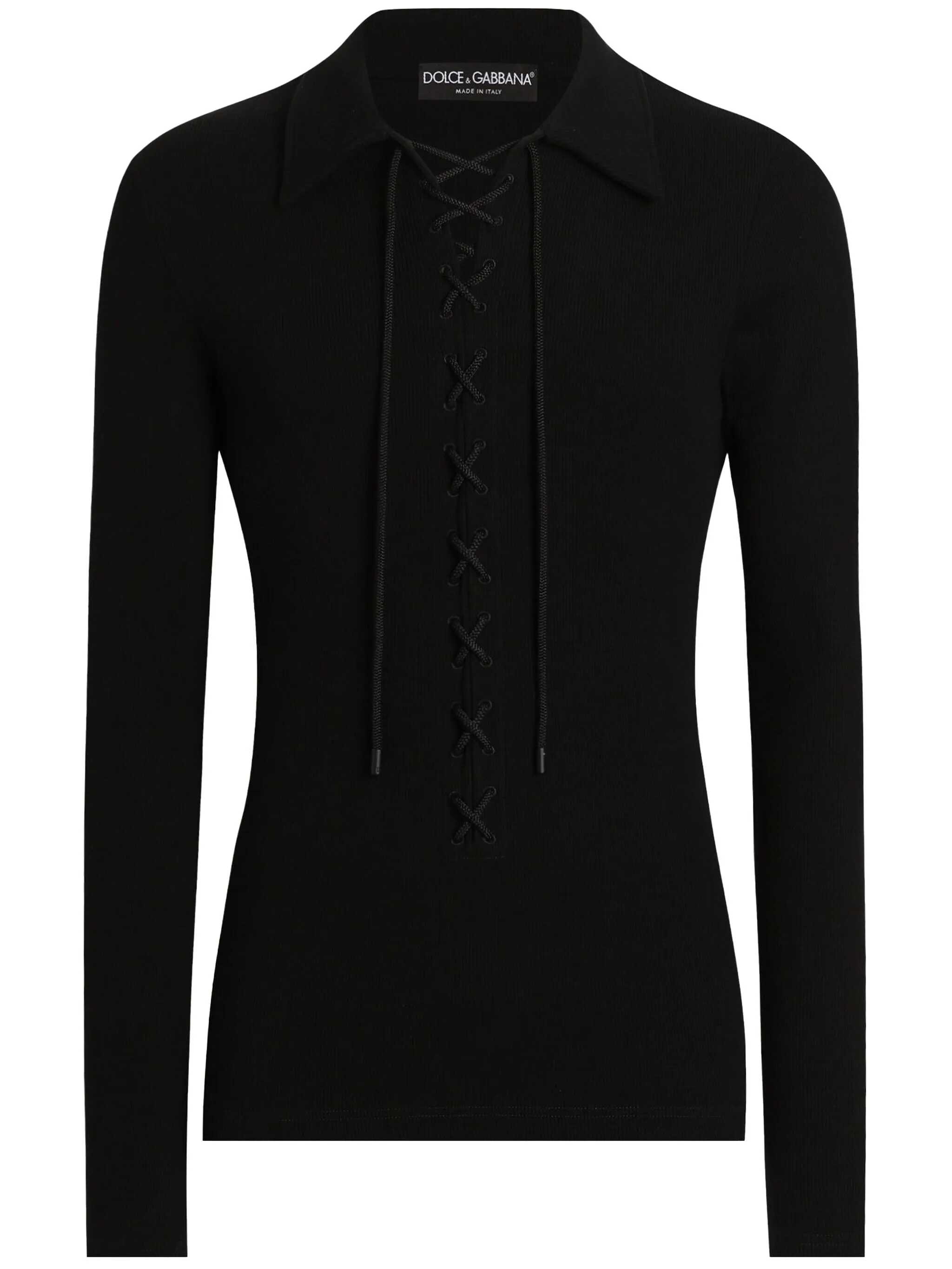 Long-sleeved polo shirt. Pointed collar. Lace-up closure.