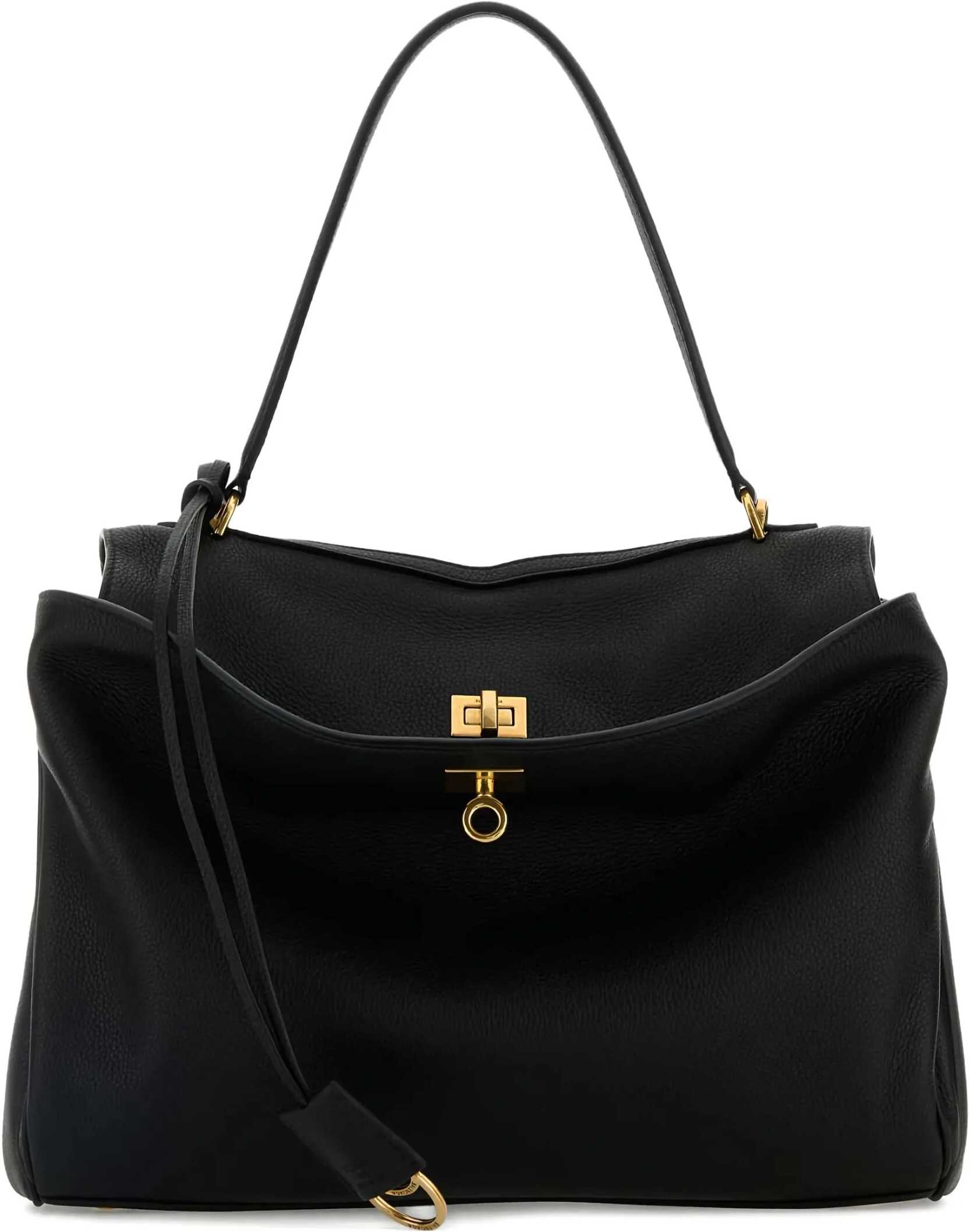 Balenciaga's Rodeo Leather Shoulder Bag features a top handle for a comfortable and stylish grip. The front closure features a flap and swivel, adding a distinctive and functional detail. Applied keychain detail on the top handle. The removable shoulder strap is attached by snap hooks, allowing it to be carried either on the shoulder or by hand. Inside, the bag offers single interior compartment, ideal for organizing essentials. In addition, there are metal feet at the base of the bag to protect it and keep it in place.