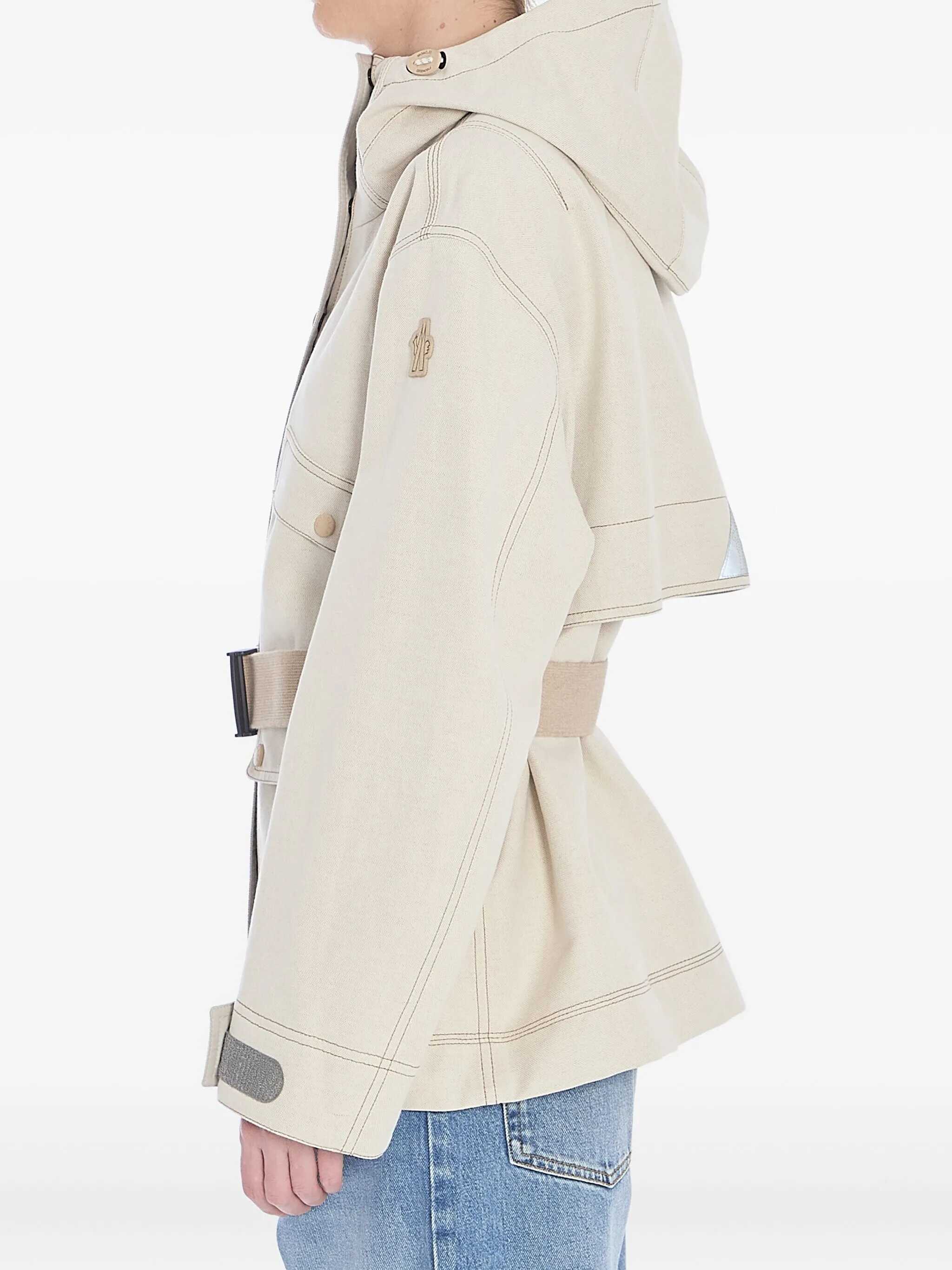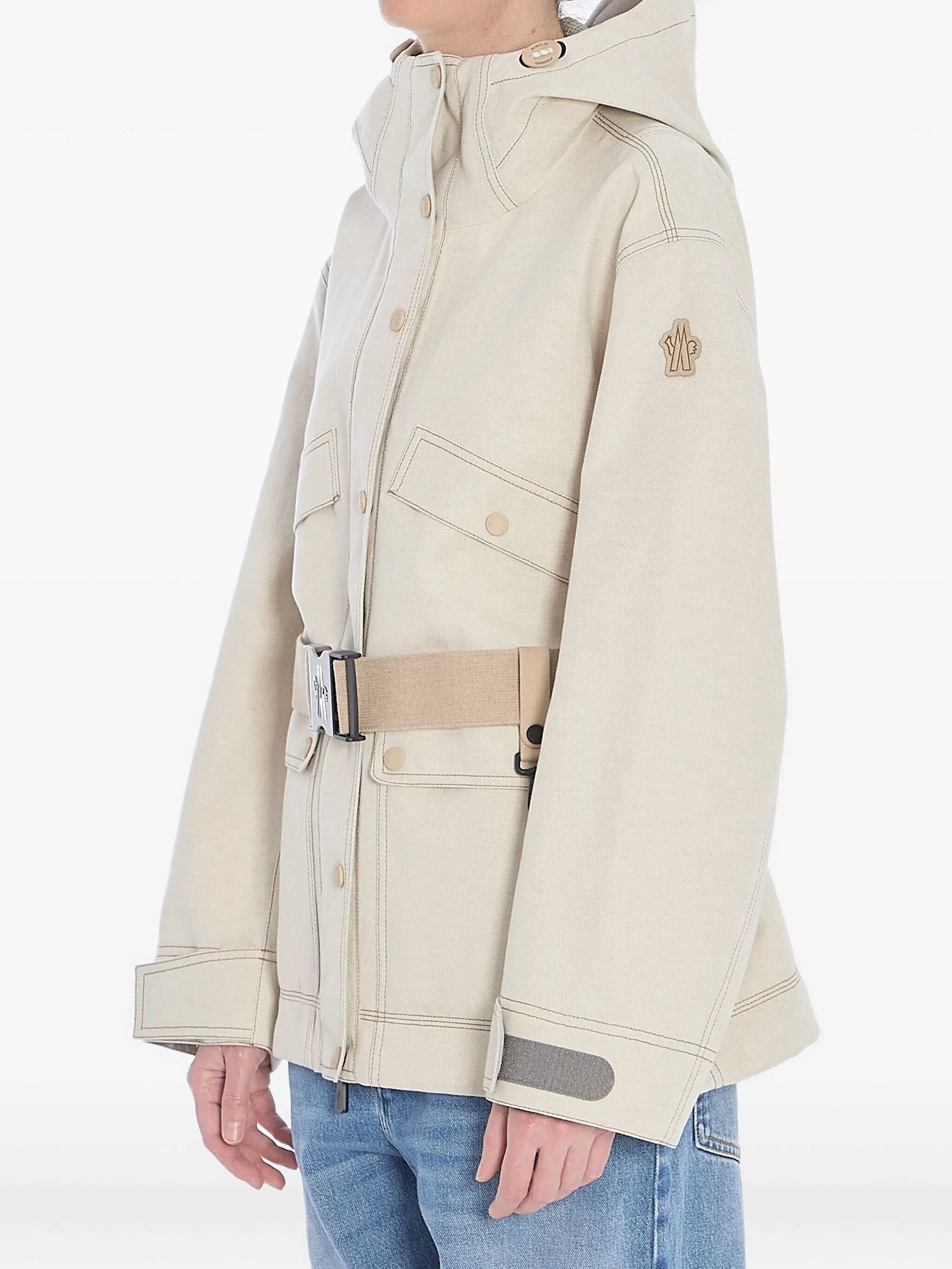 Tarkine field jacket with hood in light beige 3-layer cotton and linen. It features heat-sealed seams, an adjustable hood with visor, a front closure with snap buttons and zip, four front flap pockets with snap buttons, two side zip pockets, a removable and adjustable belt with carabiner, a Moncler Grenoble patch on the left sleeve, adjustable cuffs with Velcro, underarm vents, and a back yoke with reflective logo. Regular fit.