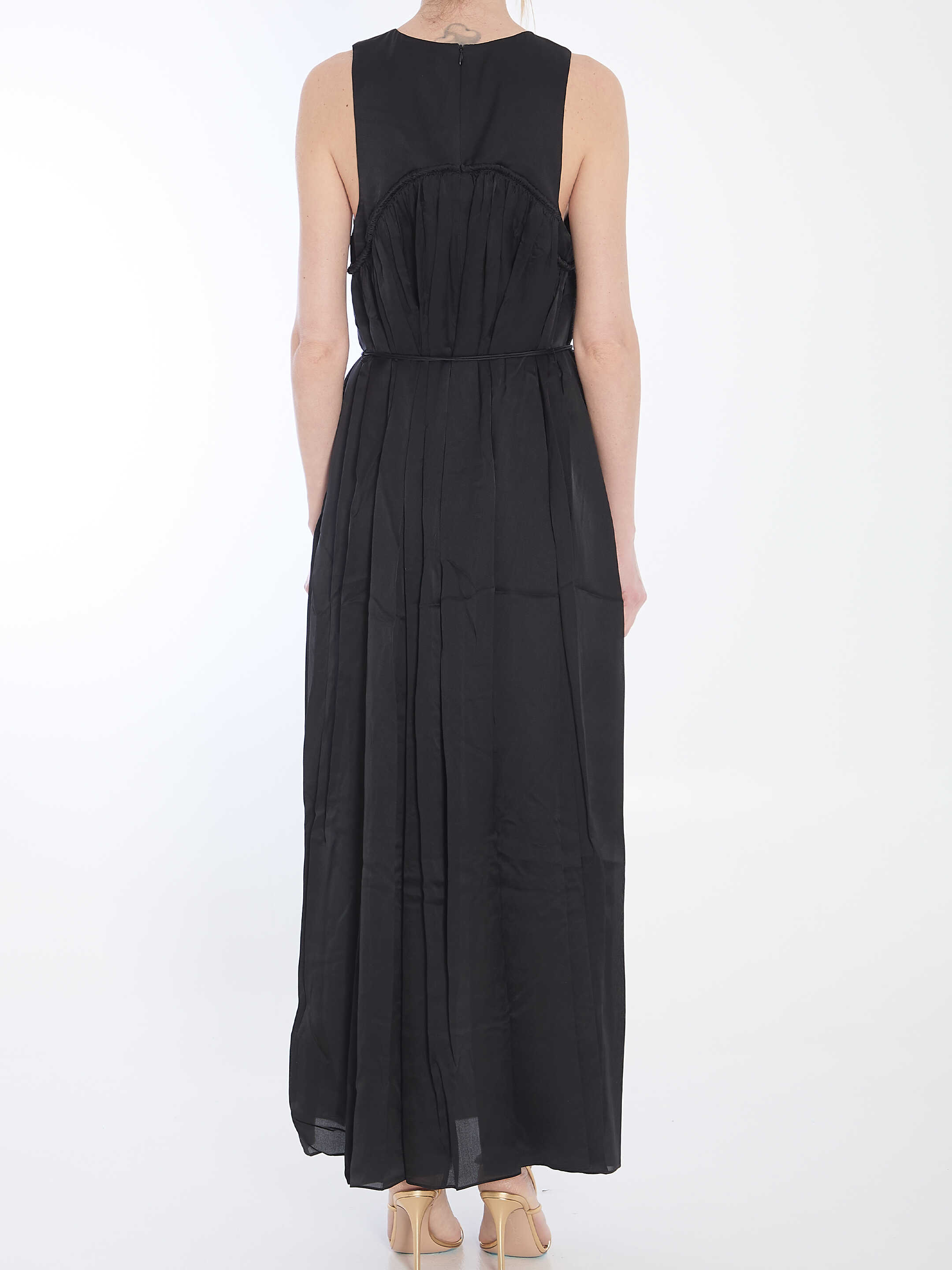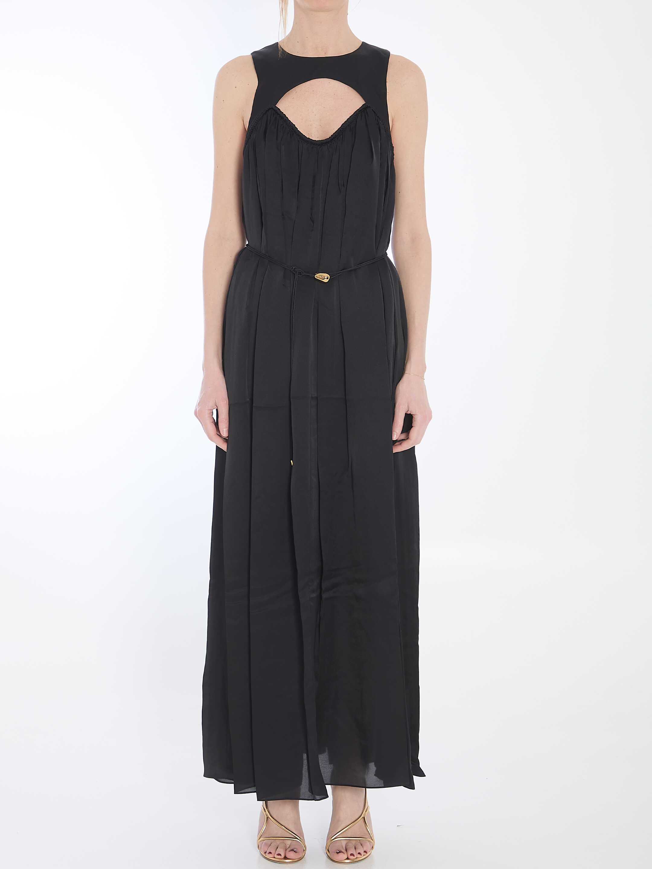 Balance flared maxi dress in black silk. It features a sweetheart neckline with a cut-out, all-over pleating, a removable and adjustable belt with a gold-tone metal detail, a halter-style open back, and an invisible back zip closure.
