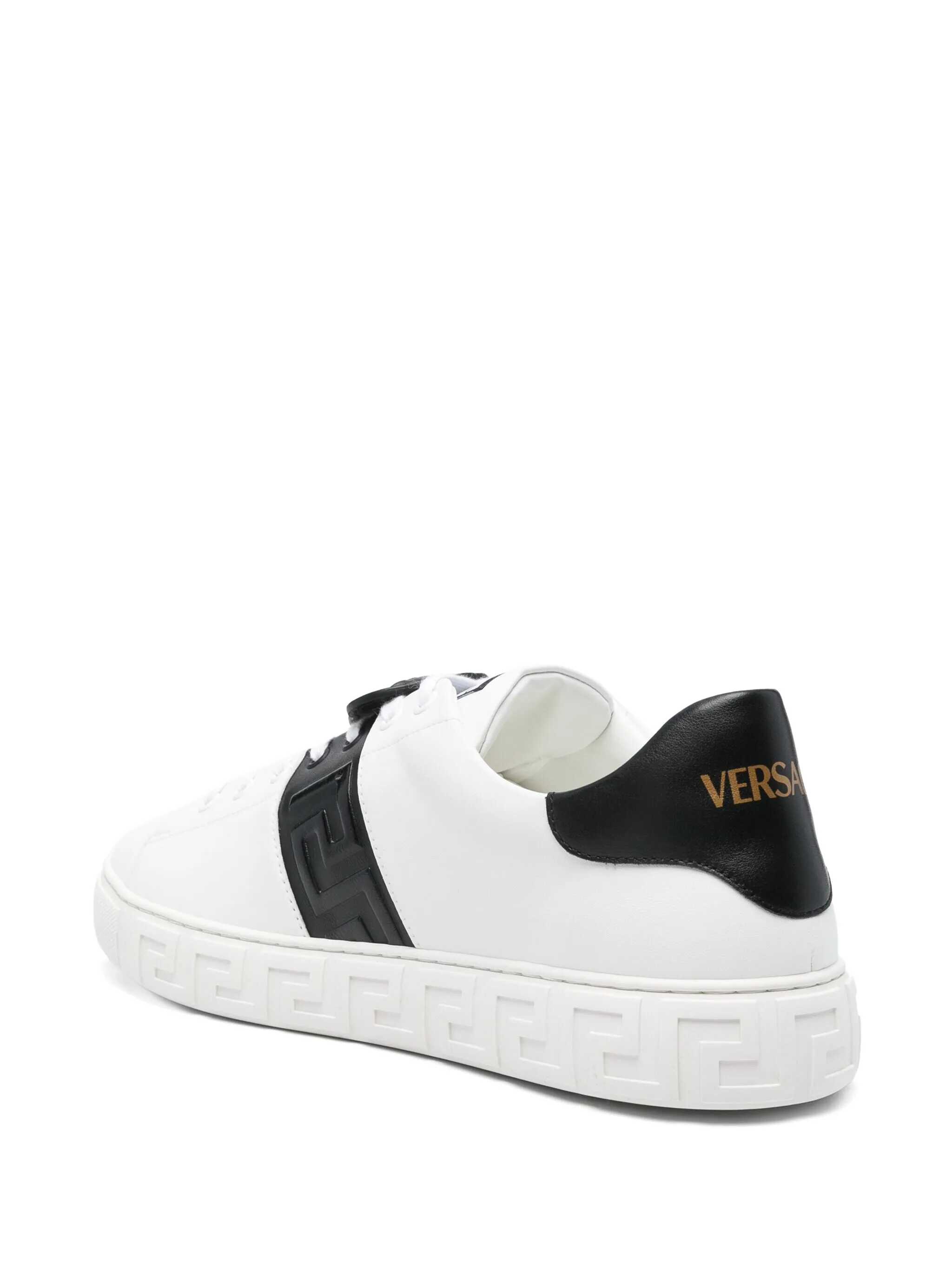 Features white front closure with laces flat rubber sole contrast heel reinforcement with Medusa head motif logo