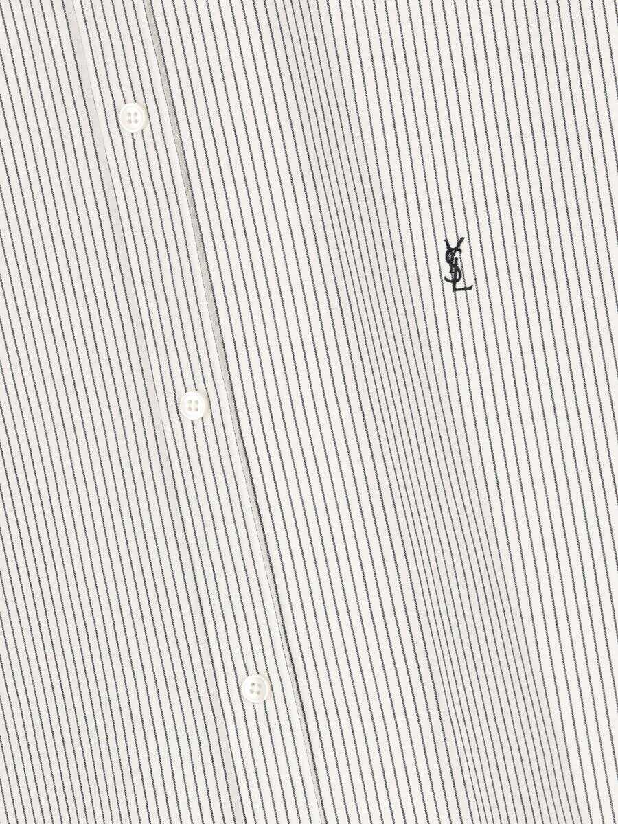 A classically cut thin-striped shirt finished with a pointed collar and tone-on-tone buttons. A timeless masculine essential, enhanced by the discreet YSL logo embroidered on the bottom. - Material: 100% cotton - Color: gray - Pointed collar - Two-button beveled cuffs and hidden one-button pleated felsino - Curved hem - Cassandre embroidery on hem - Front button closure - Made in Italy - Item number: 835517Y6K559787