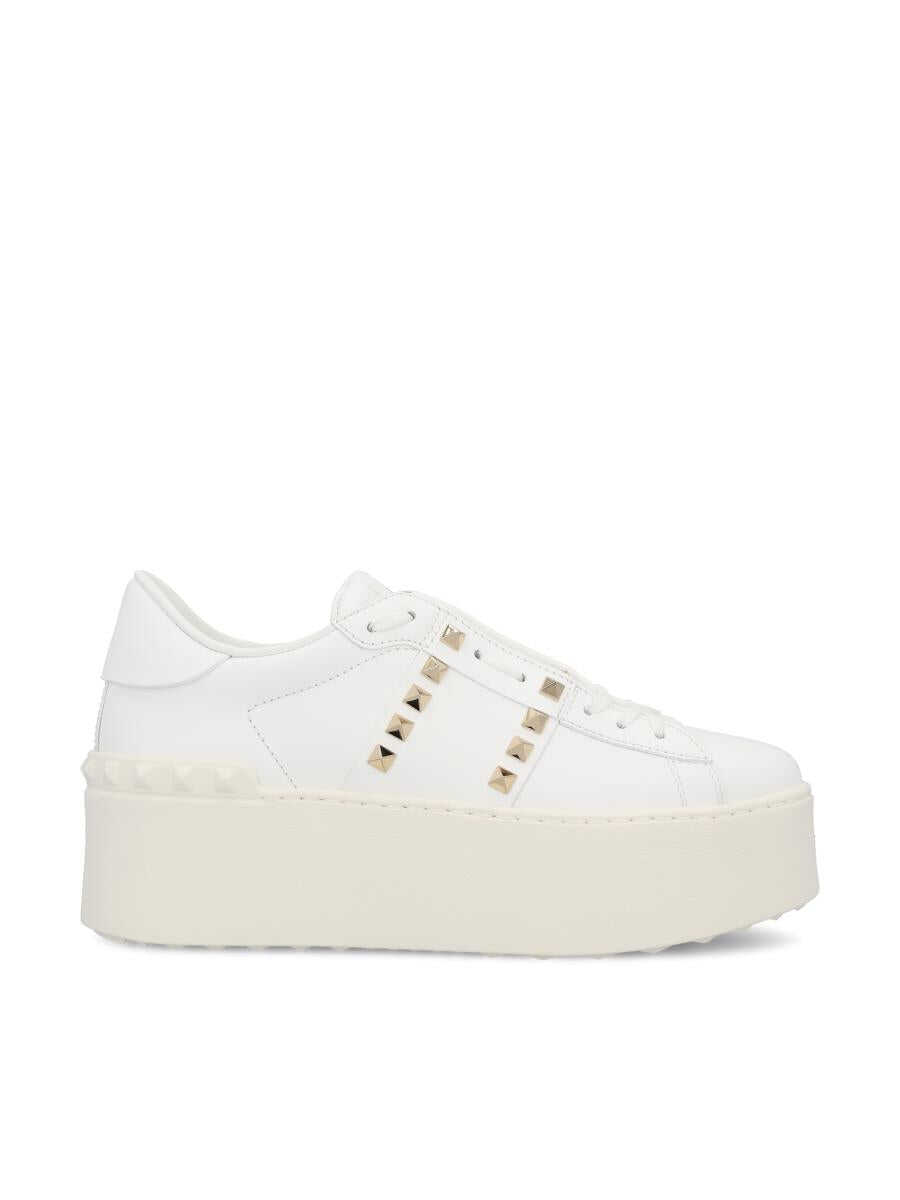 Leather sneaker with a bold profile, enriched with iconic details such as Rockstud studs and numbered label. A flatform model that combines contemporary design and Valentino archival codes. - Upper: calfskin leather - Color: white - Rubber sole with stud detail on back - Platinum finish studded appliqué band - Special numbered 11 label - Made in Italy - Box included - Item code: ZW2S0GG8BHS0BO