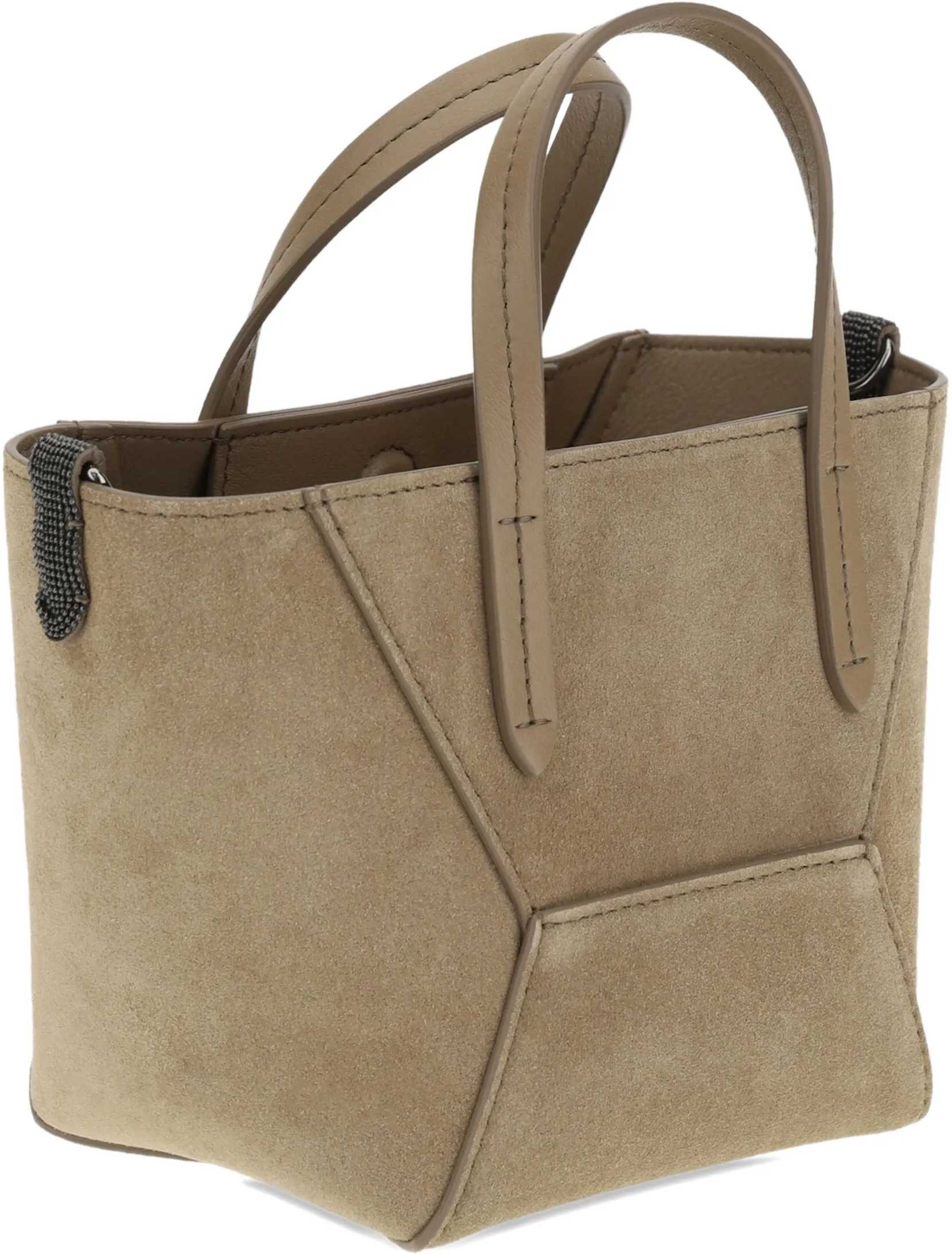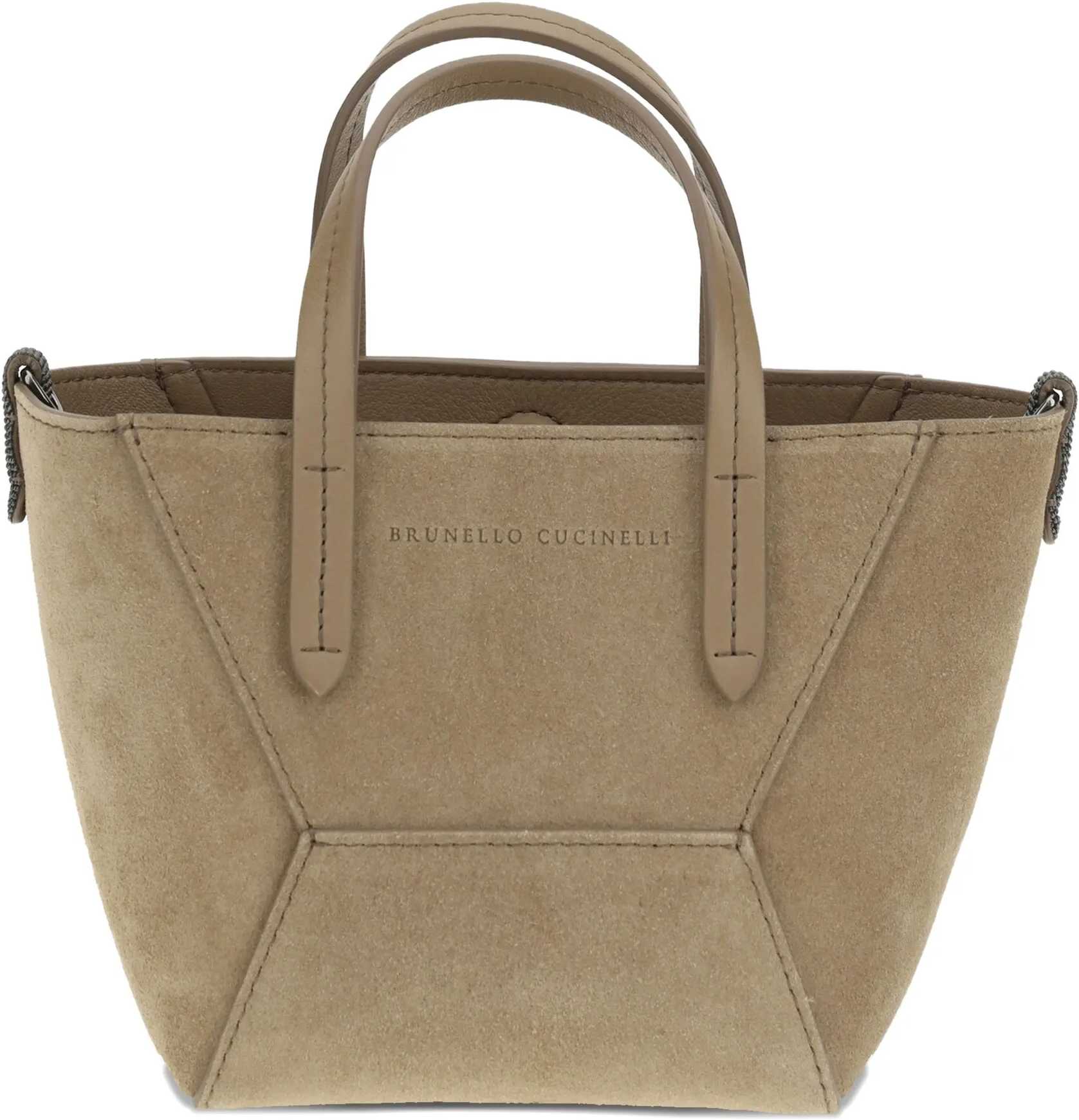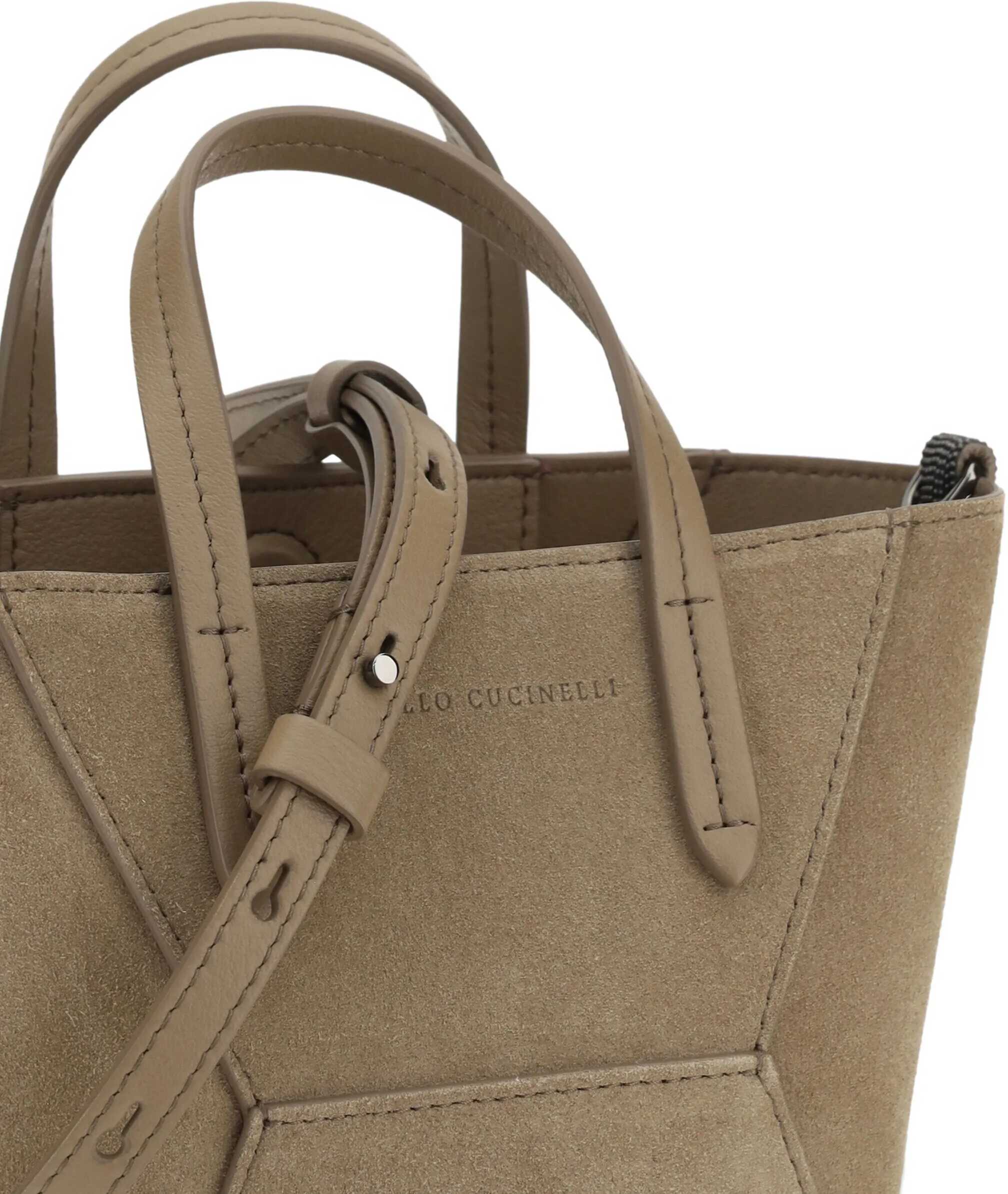 Brunello Cucinelli's suede leather Shoulder Bag combines craftsmanship and sophistication. Featuring two top handles and an adjustable and removable flat shoulder strap, it offers versatility and comfort. The paneled design enhances the elegant structure, while the iconic monogram on the front panel adds a distinctive touch. The interior magnetic button closure ensures practicality, and the iconic shiny jewels on the side panels lend brightness and sophistication. The single interior compartment ensures space and functionality, perfect for discreet and timeless elegance.