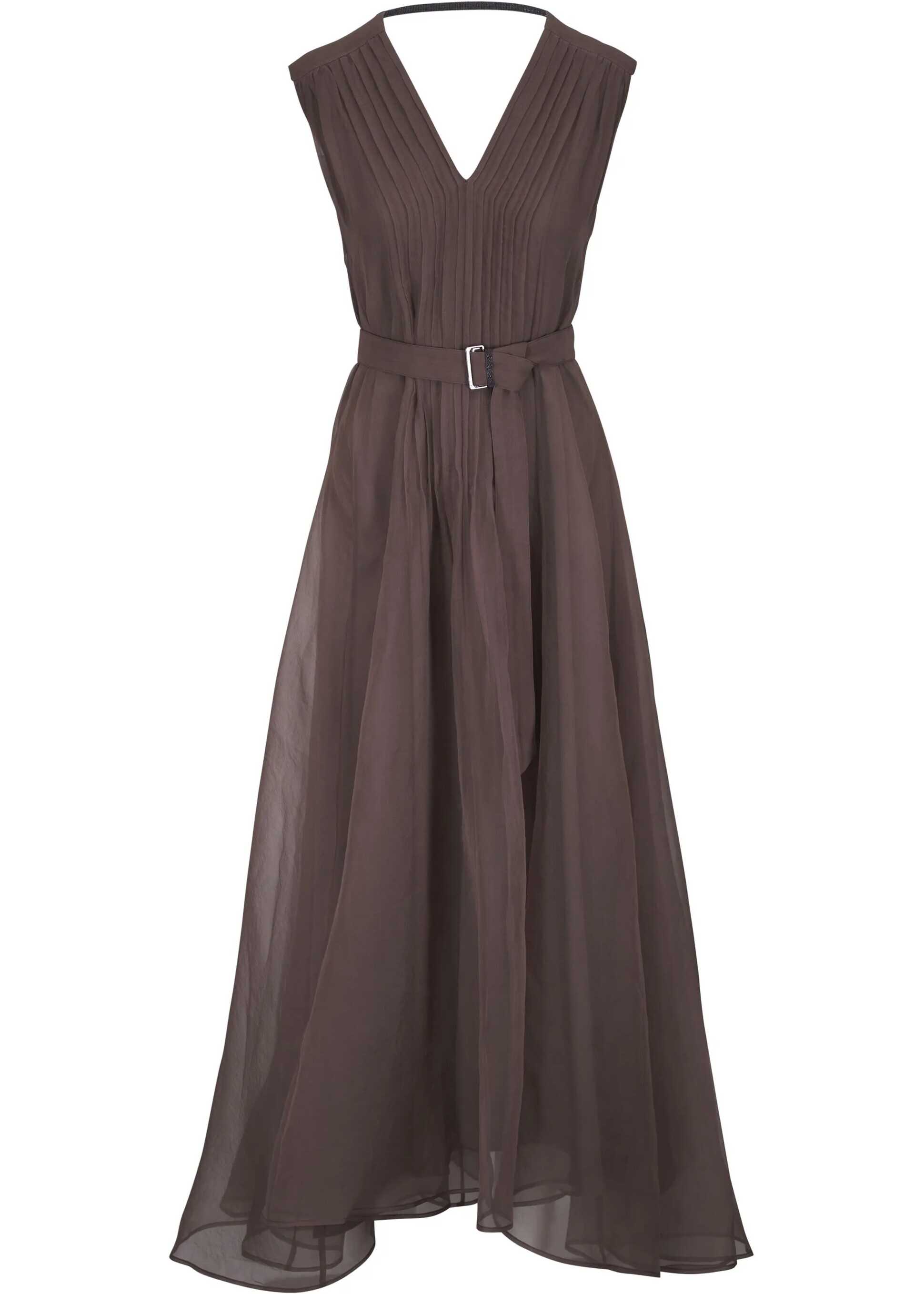 Brunello Cucinelli's silk long Dress combines the refinement of flowing volumes with sophisticated details that tell of the Maison's distinctive elegance. The sleeveless V-neck design on both front and back creates a feminine and harmonious line. The elegant pleating starts gently from the shoulders and opens along the skirt, giving movement and lightness to the garment. The adjustable waistband defines the silhouette with balance and introduces a delicate utility-inspired accent. At the back, a bright monile insert illuminates the neckline with a precious and discreet touch, the unmistakable signature of Brunello Cucinelli style.