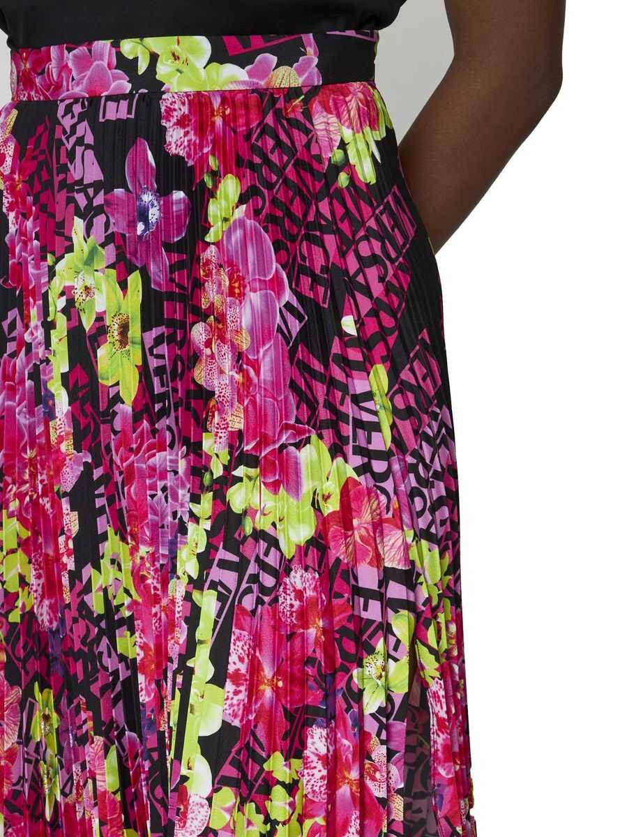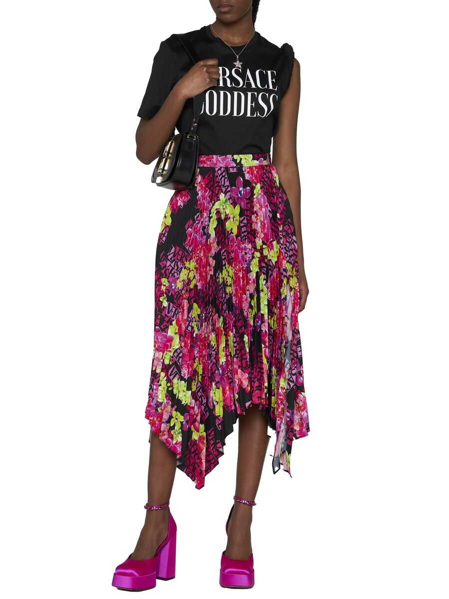 Black, pink and green skirt from Versace featuring abstract pattern print, plissé effect, high-waisted and handkerchief hem.