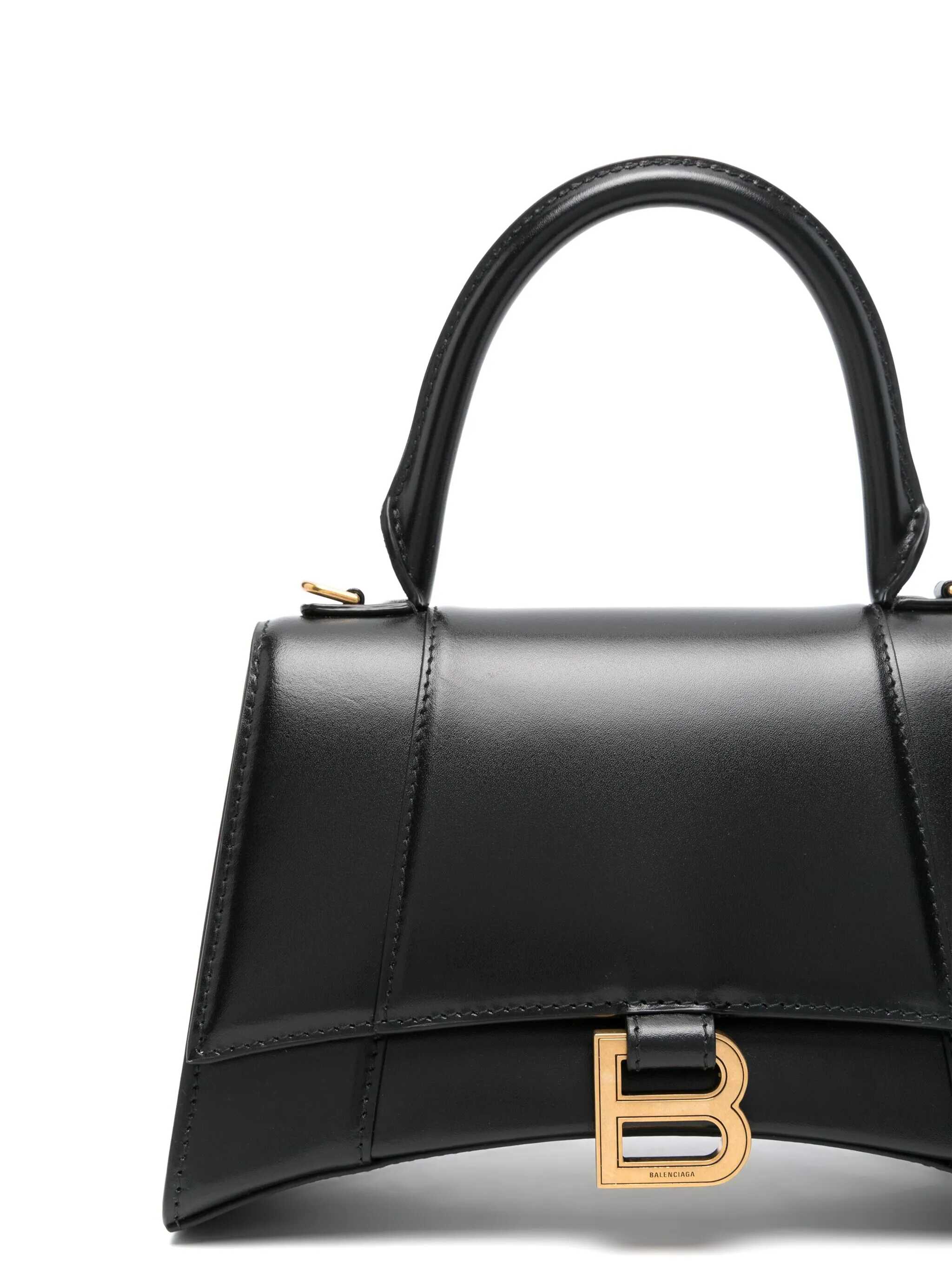 Blasck leather Hourglass S top handle bag from Balenciaga featuring top handle, frontal fastening, gold tone hardware and strap.