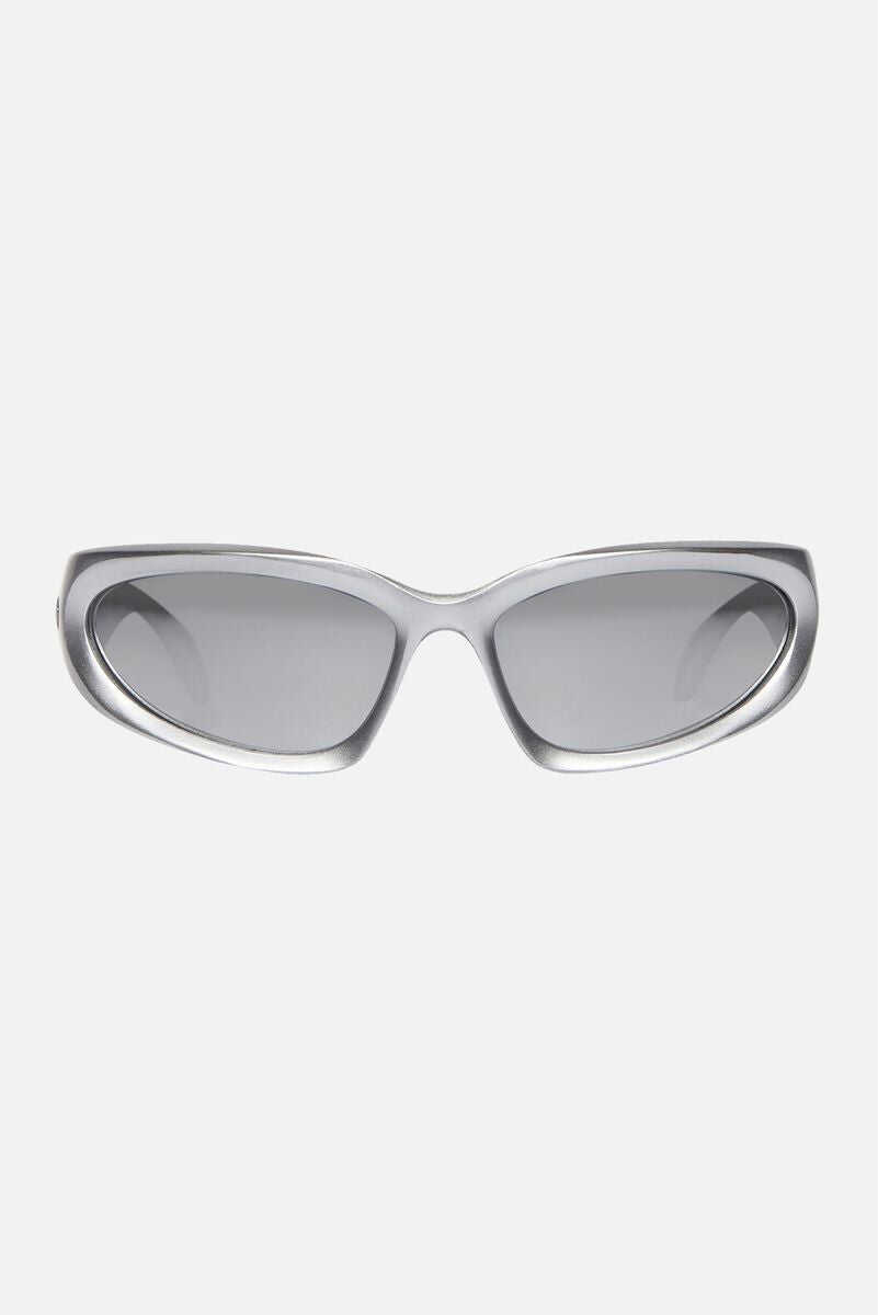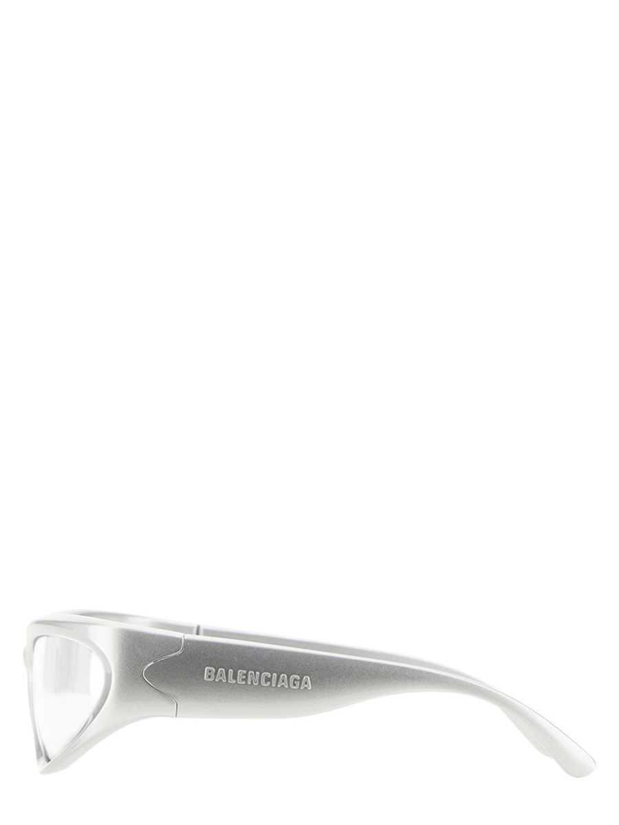 Balenciaga sunglasses crafted from silver-tone bio-based injected nylon with mirror silver lenses. Featuring a lasered logo on the right lens and a Balenciaga logo engraved and enameled on the left temple.