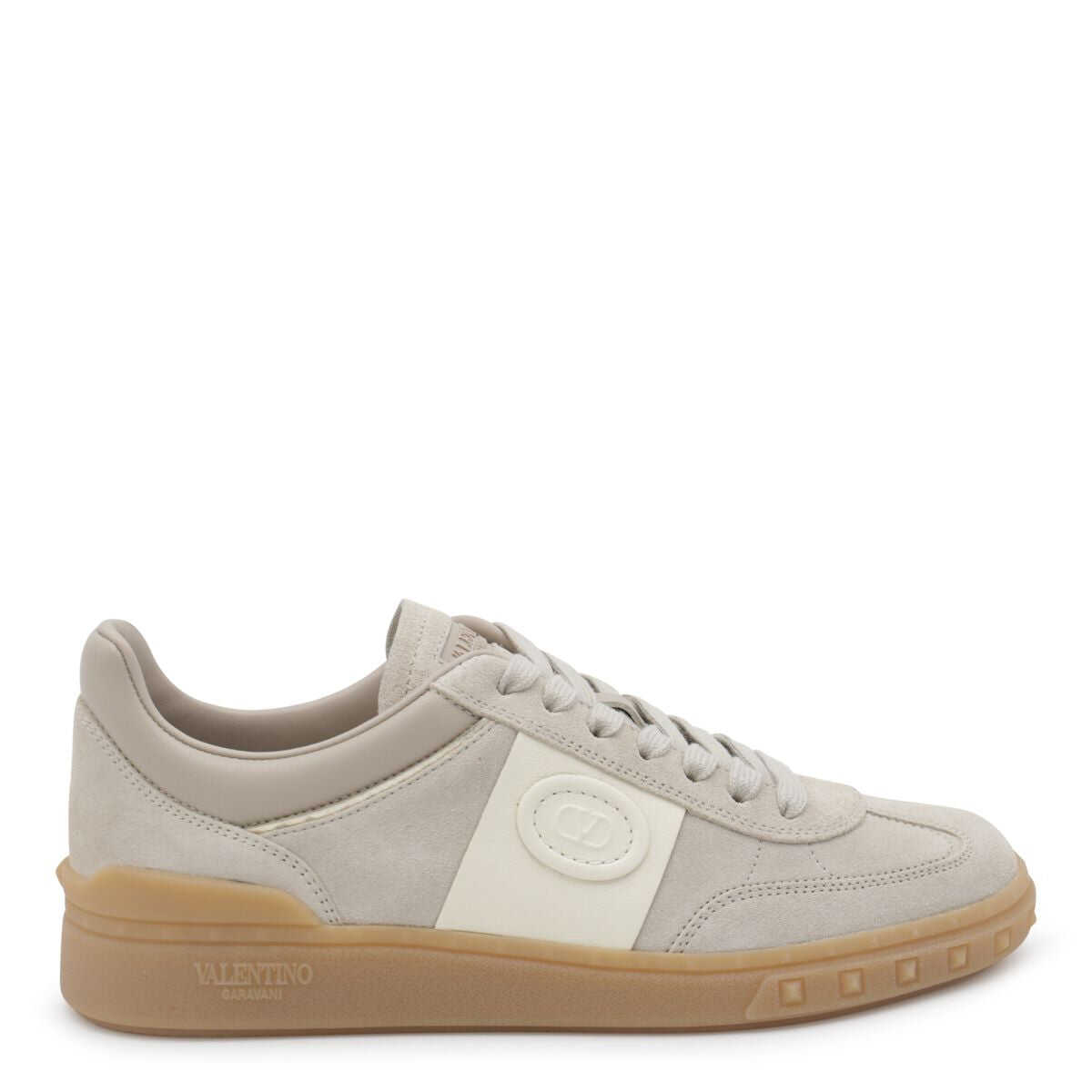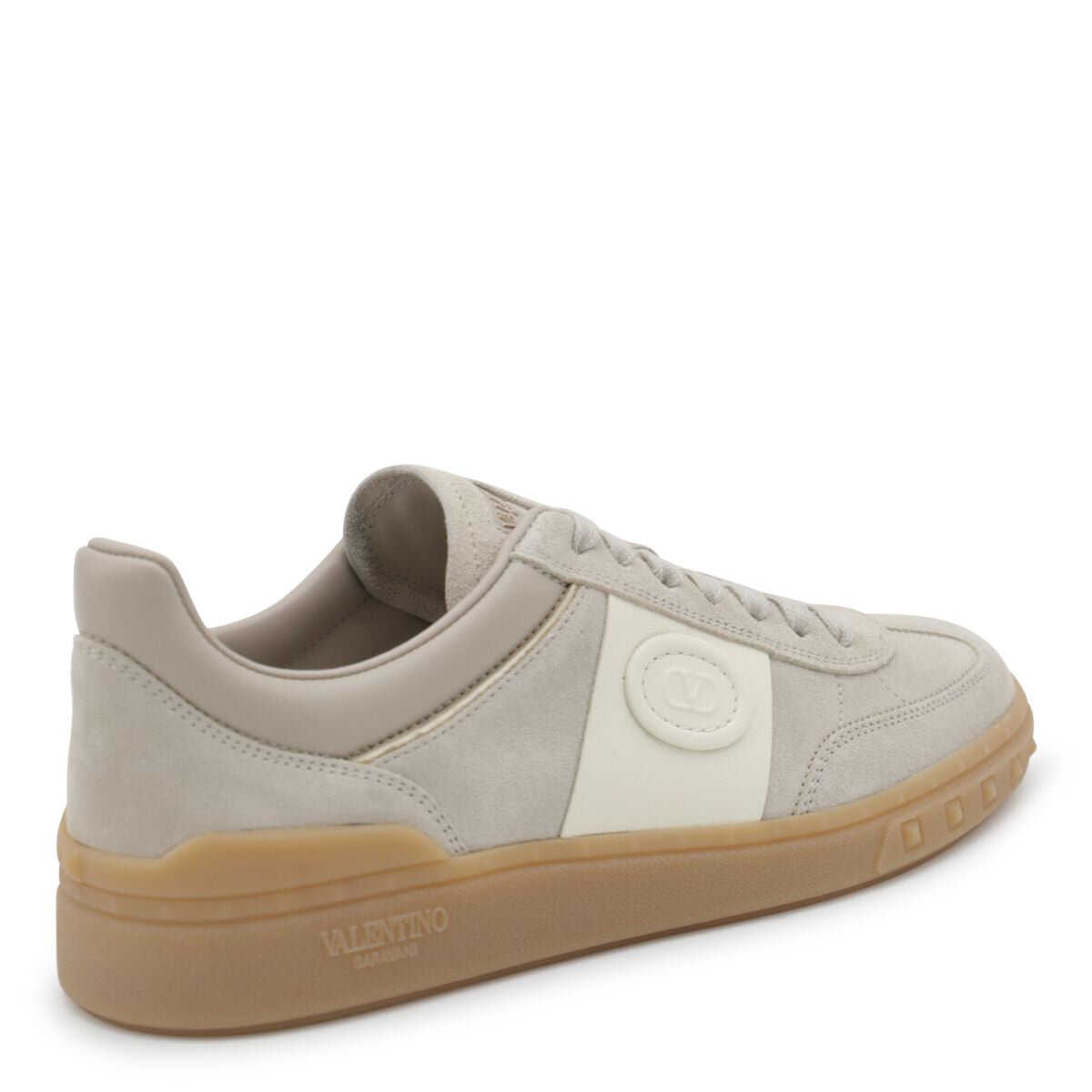 Valentino Garavani low-top sneakers crafted in grey beige suede, featuring a leather patch with VLogo Signature detail on the outer side. Designed with lace-up closure, round toe, leather/fabric lining and a rubber sole with stud details. The design is completed by a rubber logo patch on the tongue. Spare laces included.