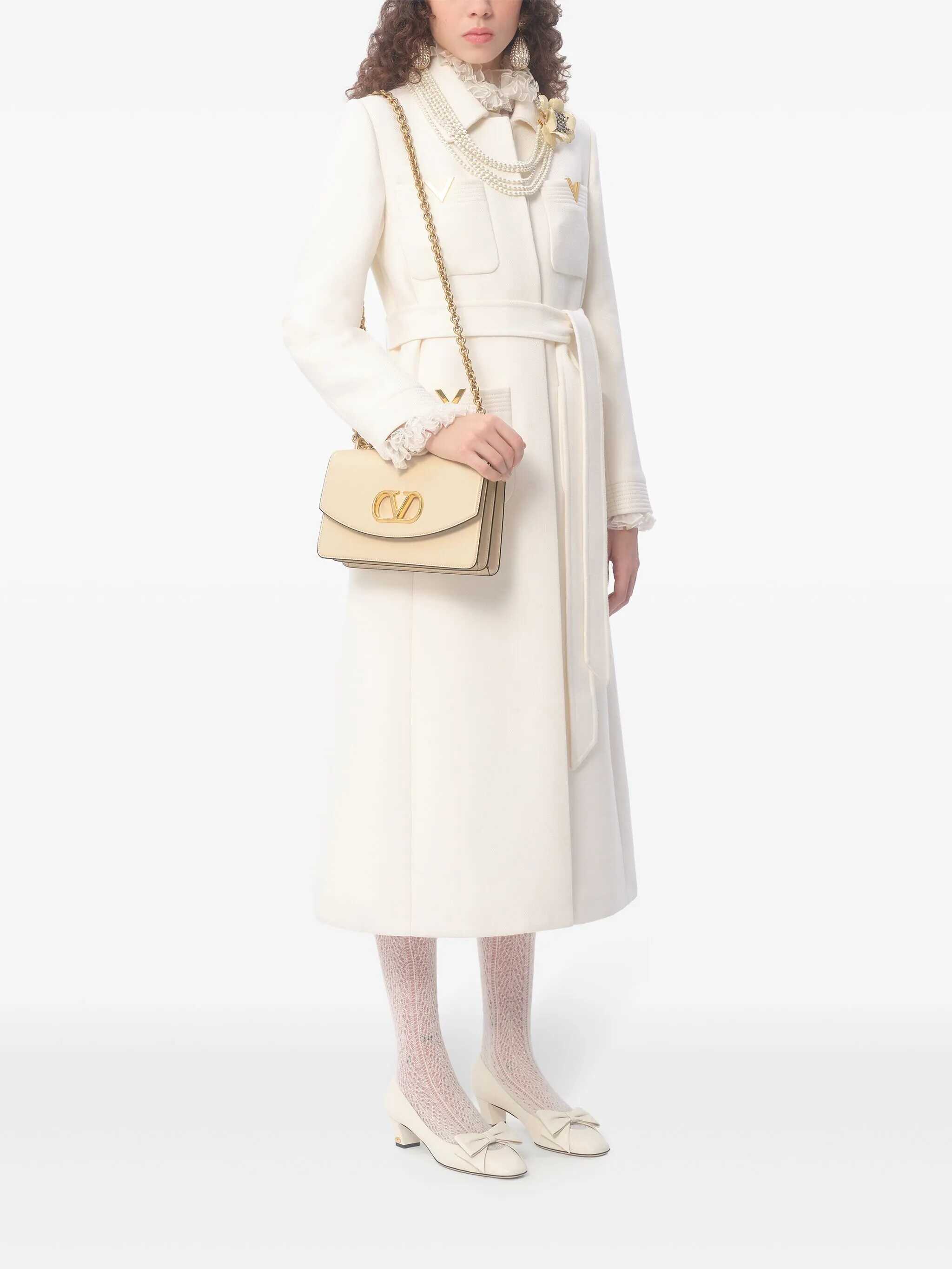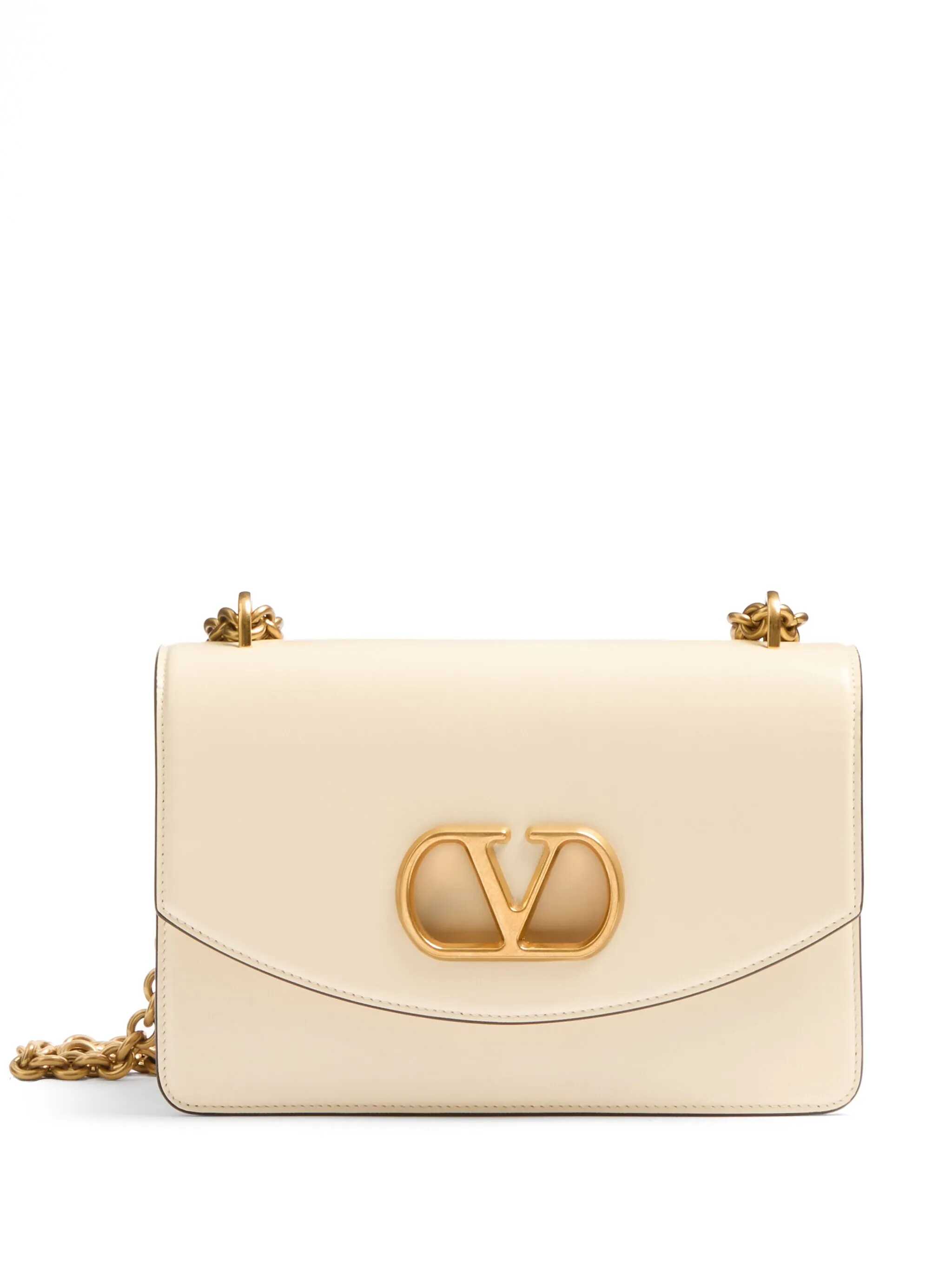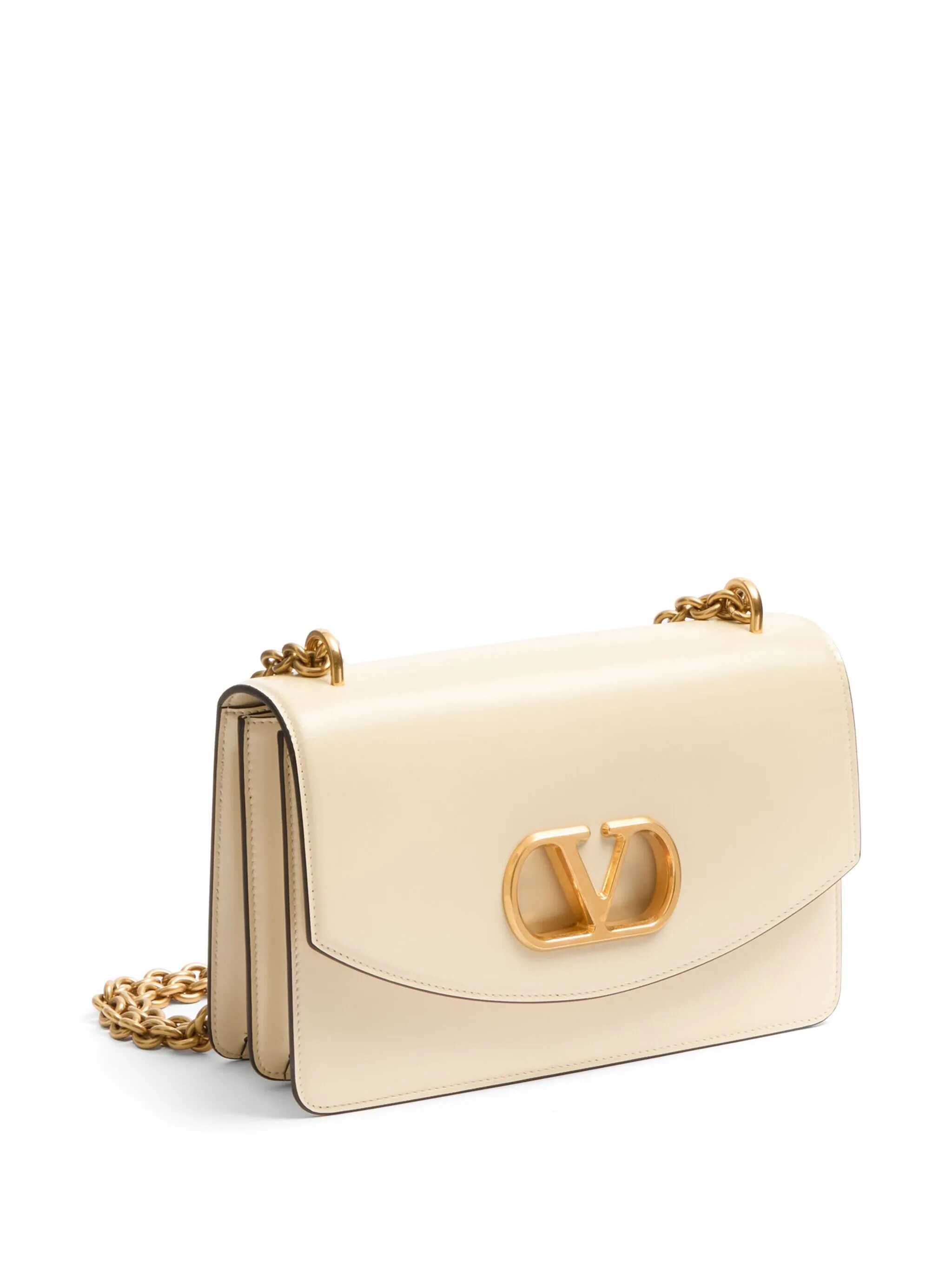 White leather Vain shoulder bag from Valentino Garavani featuring chain, gold tone hardware, frontal logo, magnetic fastening and pocket.
