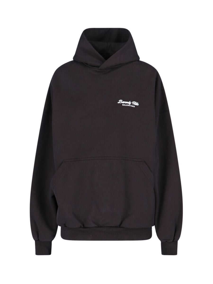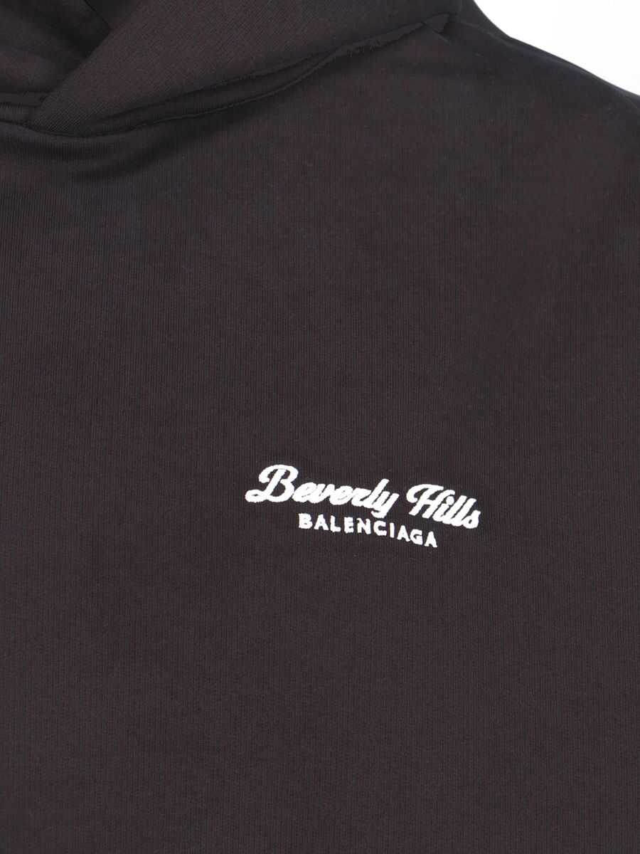 Balenciaga's oversized hoodie crafted in vintage black cotton jersey with Beverly Hills logo embroidery at chest. Featuring long sleeves, kangaroo pocket and ribbed edges.