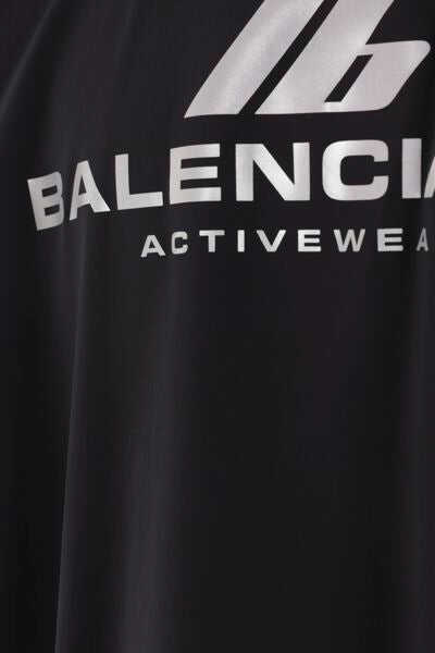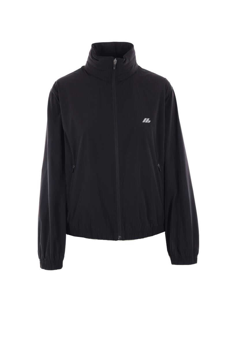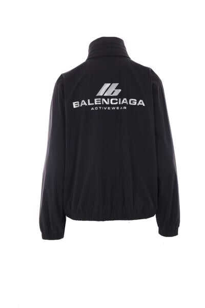 Balenciaga's windbreaker crafted in black stretch nylon with reflective logo print at chest / at back. It features high neck, extractable hood, zip closure, side pockets, long sleeves, elasticated edges and straight hem with drawstring.