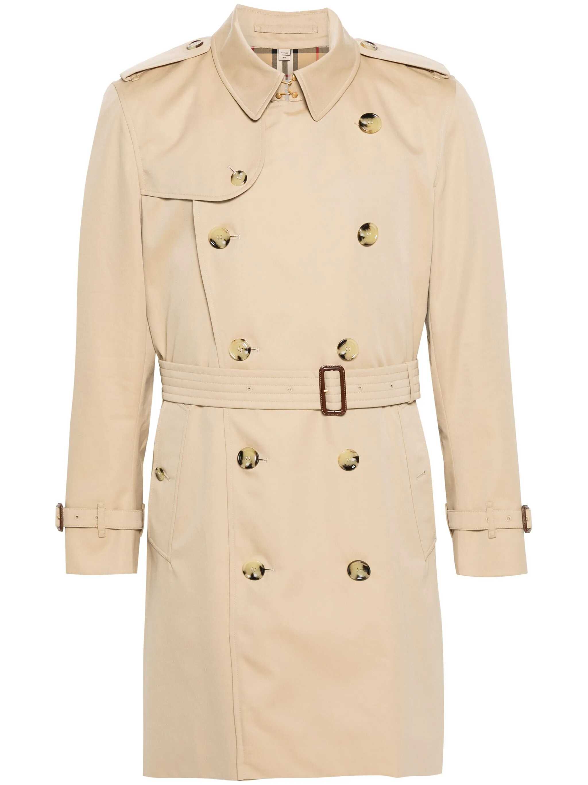Burberry's double-breasted trench coat crafted in beige cotton gabardine with removable belt. Featuring wide lapel, button closure, long sleeves with button-tabs at shoulders and belted cuffs, welt pockets, back storm shield and Burberry Check cotton lining.