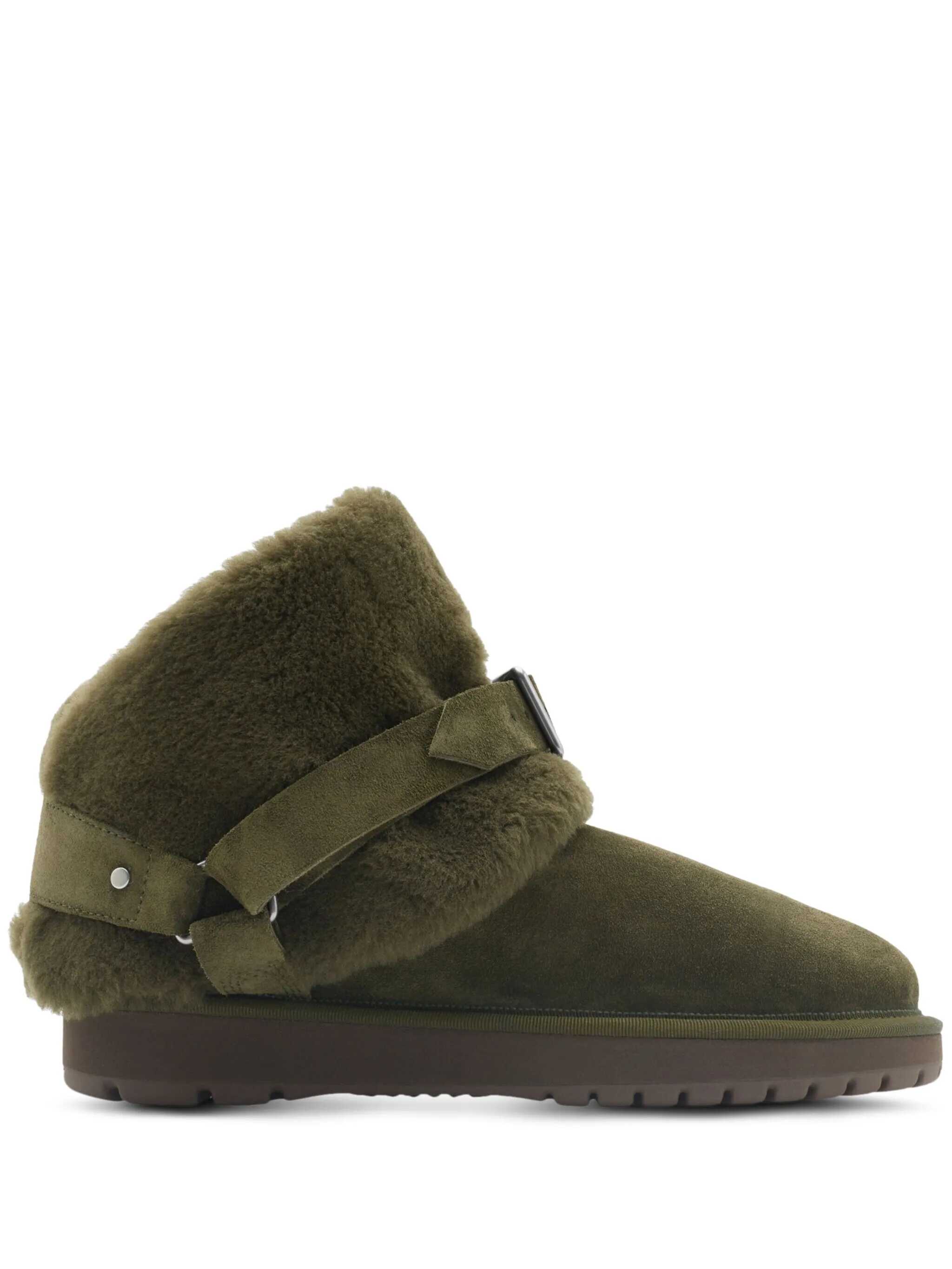 Brown sheep boots from Burberry featuring round toe, frontal buckle, sheep and leather sole.