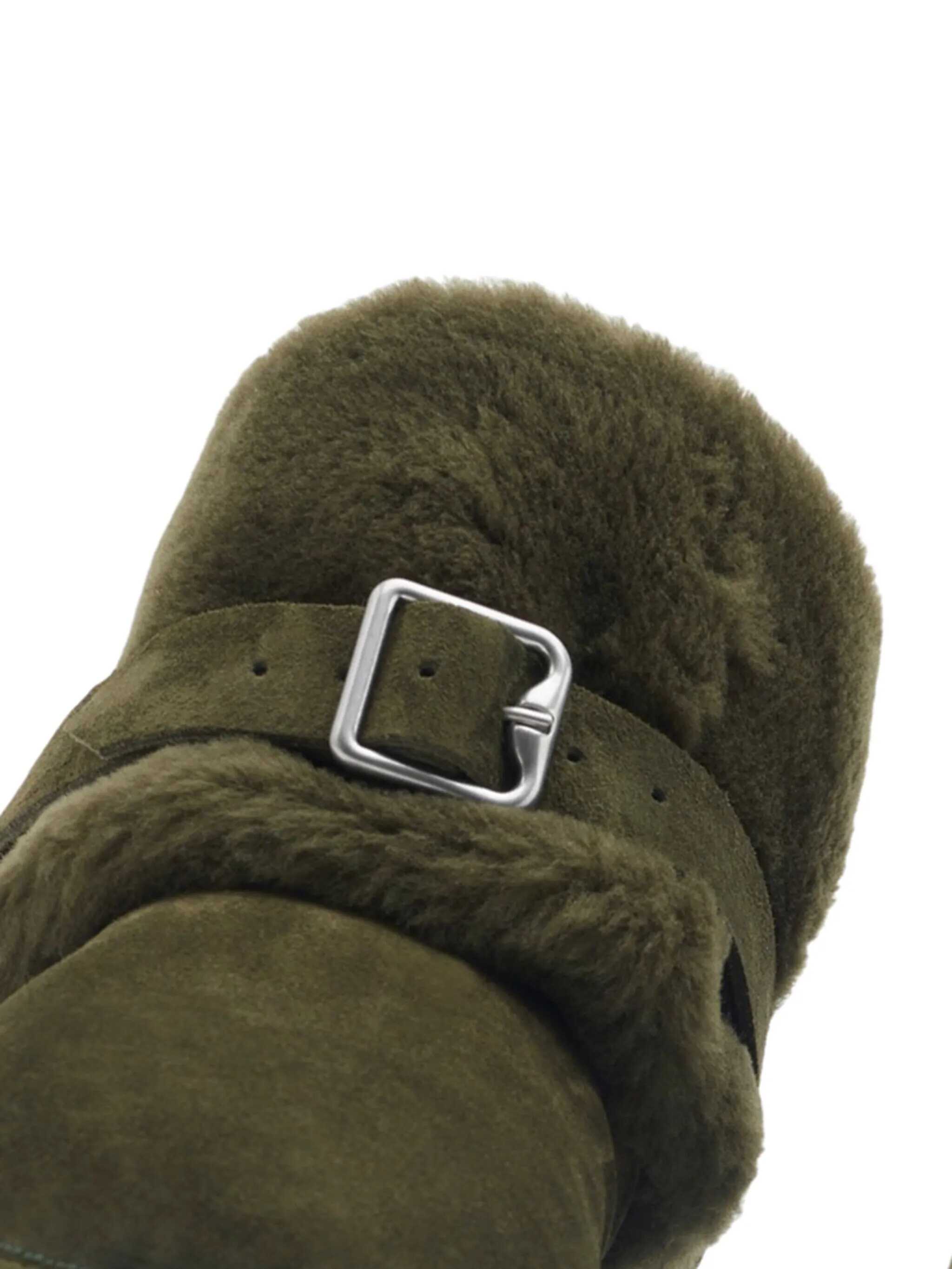 Brown sheep boots from Burberry featuring round toe, frontal buckle, sheep and leather sole.