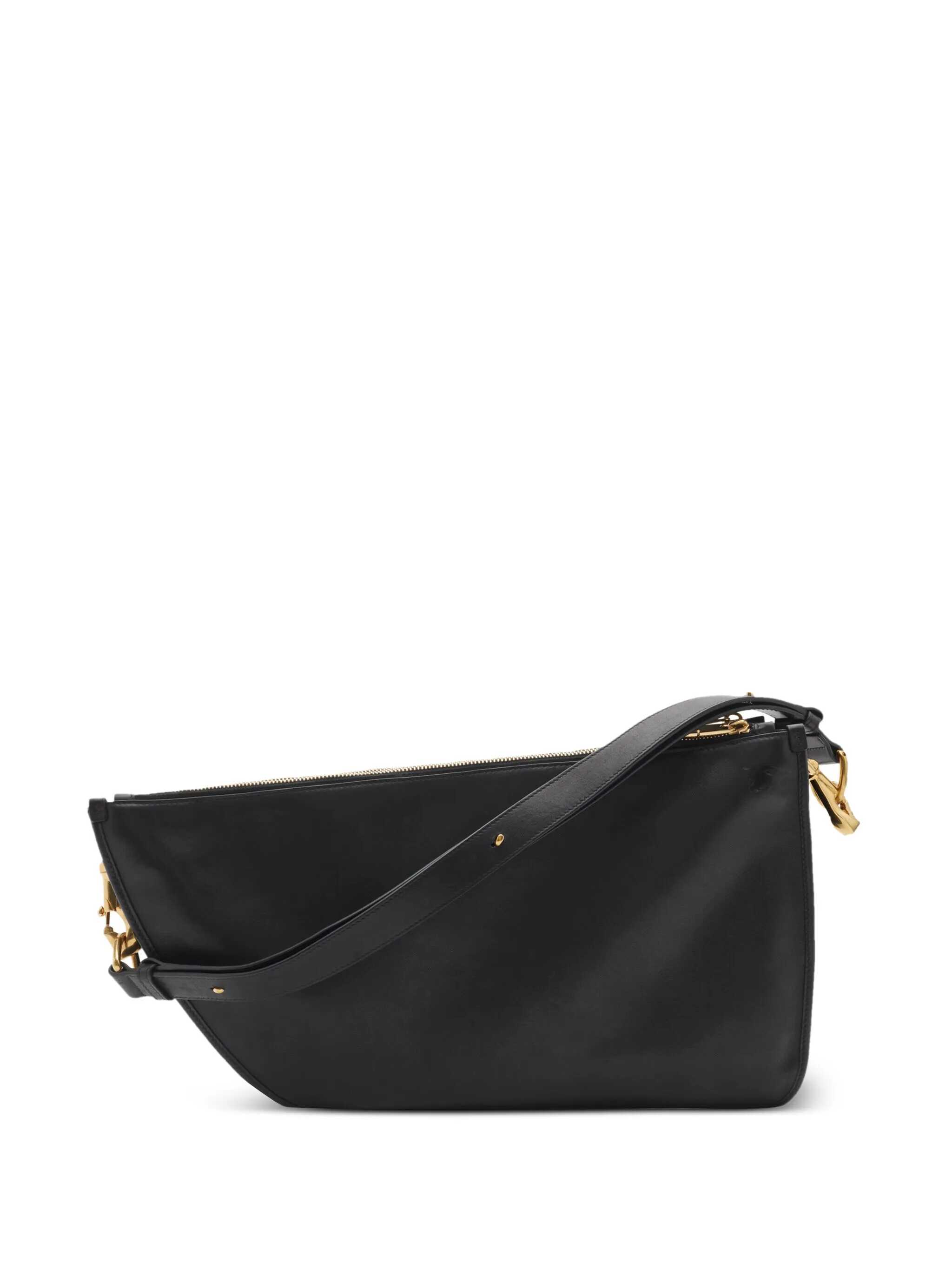 Black leather shoulder bag from Burberry featuring adjustable strap, gold tone hardware, frontal pockets, zip fastening and logo.