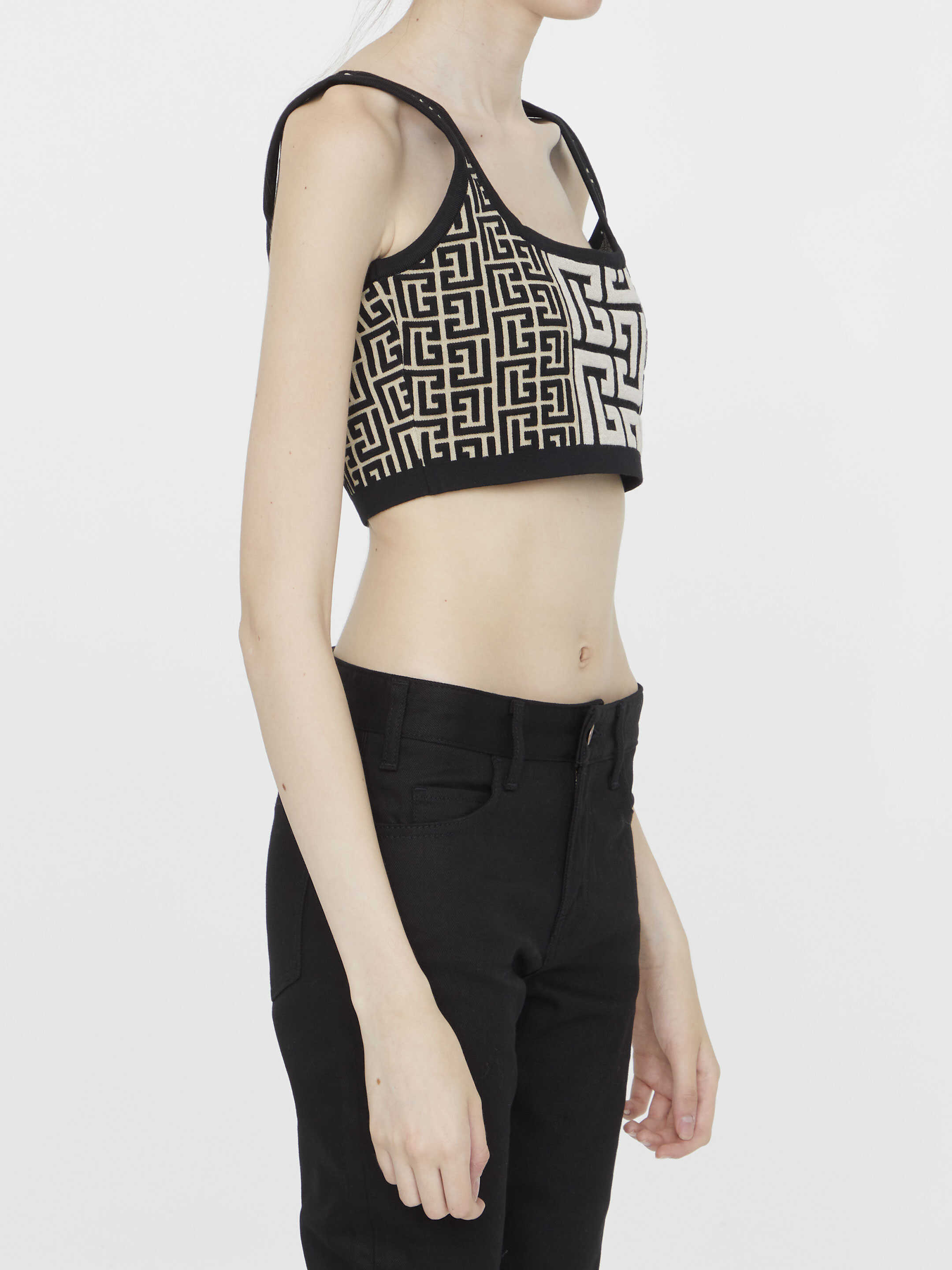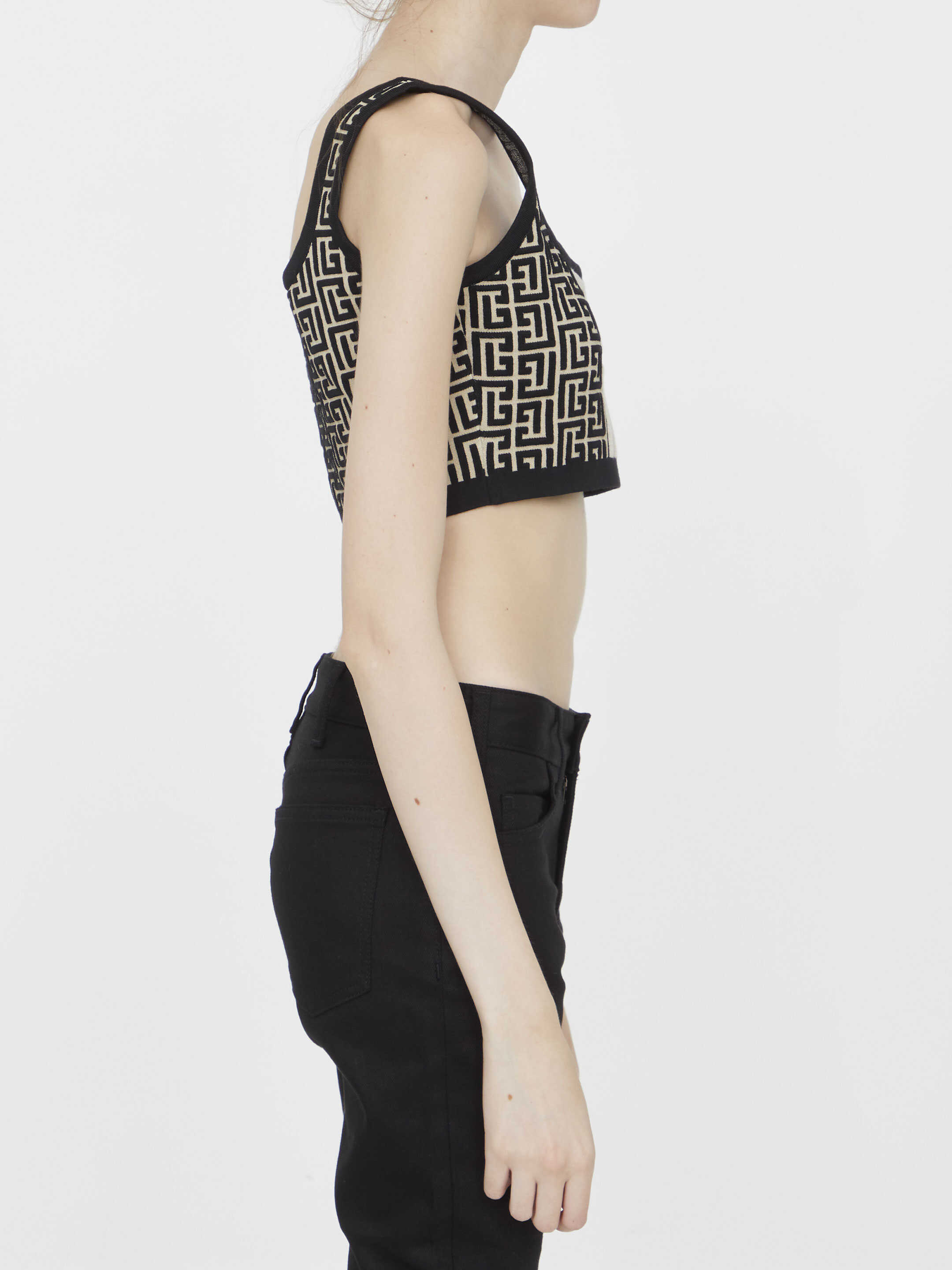 Crop top in wool blend knit in the shades of black and ivory with all-over Monogram motif. Slim fit.