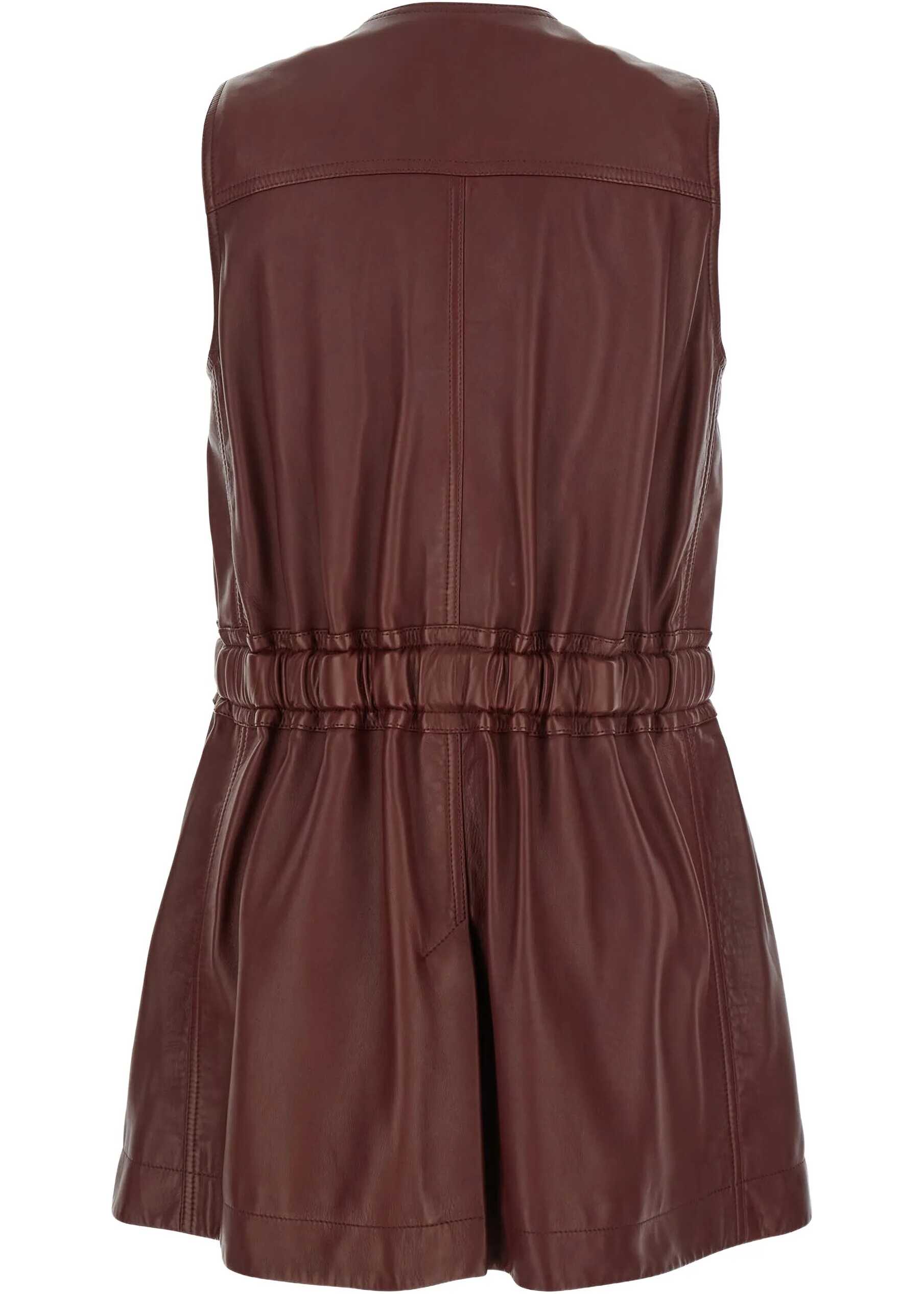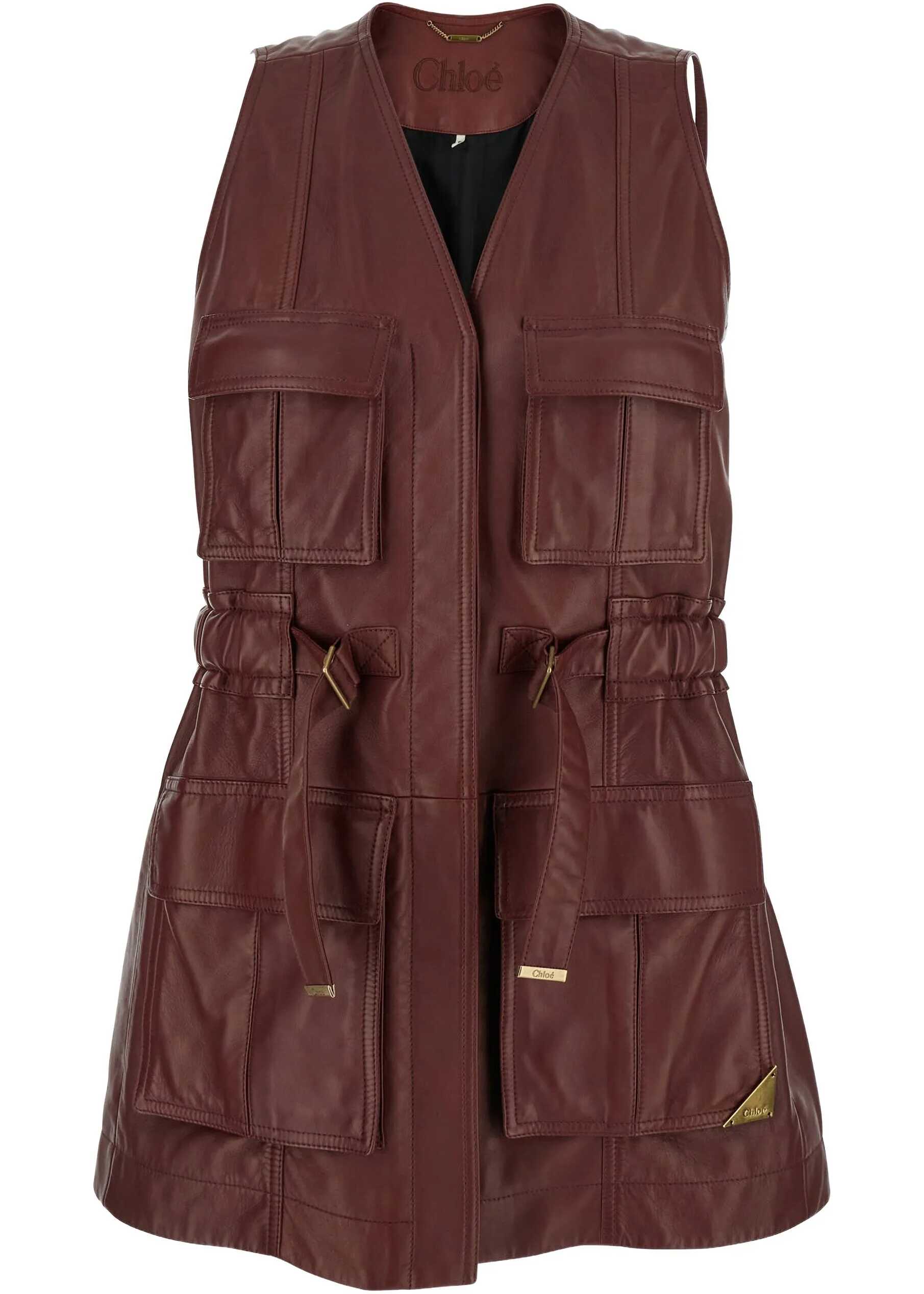 Chloé's leather Vest is a garment with a bold and sophisticated style, combining tailored details with a contemporary aesthetic. Made of soft leather, it features an elegant V-neckline and a concealed front buttoning that enhances the clean lines. Four flap pockets stand out on the front, one of which is enriched with a refined metal logo triangle, a distinctive detail of the maison. The integrated belt, finished with metal ends, emphasizes the waist and adds a structured touch, while the back slit ensures freedom of movement and an impeccable fit. A perfect garment to complete urban looks with a gritty, modern elegance.