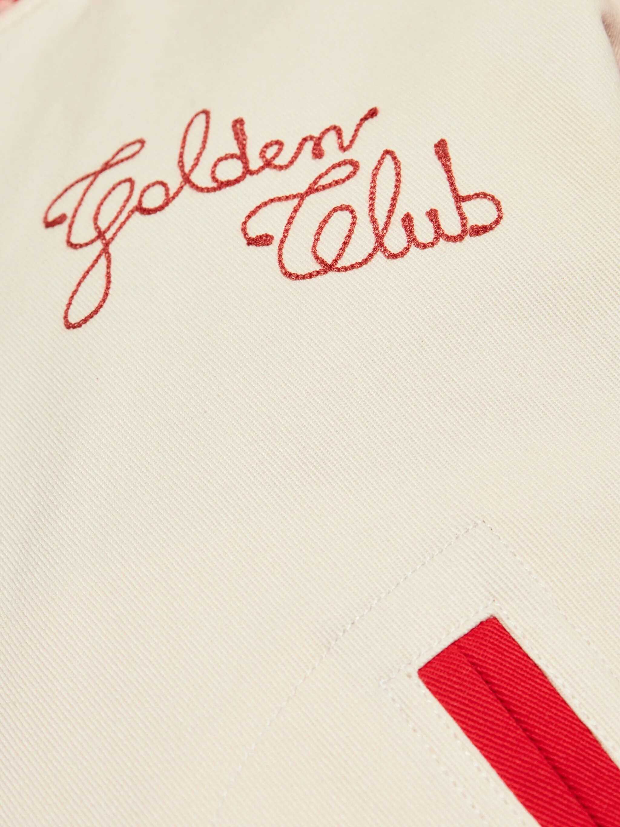 Golden Goose's Embroidered bomber Jacket is a sporty and stylish piece that combines comfort with distinctive details. With a ribbed plush collar, hem and cuffs, it provides a comfortable and casual fit. The front snap button closure and two side welt pockets add functionality to the design. The iconic embroidered logo on the front and back lends an exclusive and recognizable touch, making this jacket perfect for an urban, edgy look.
