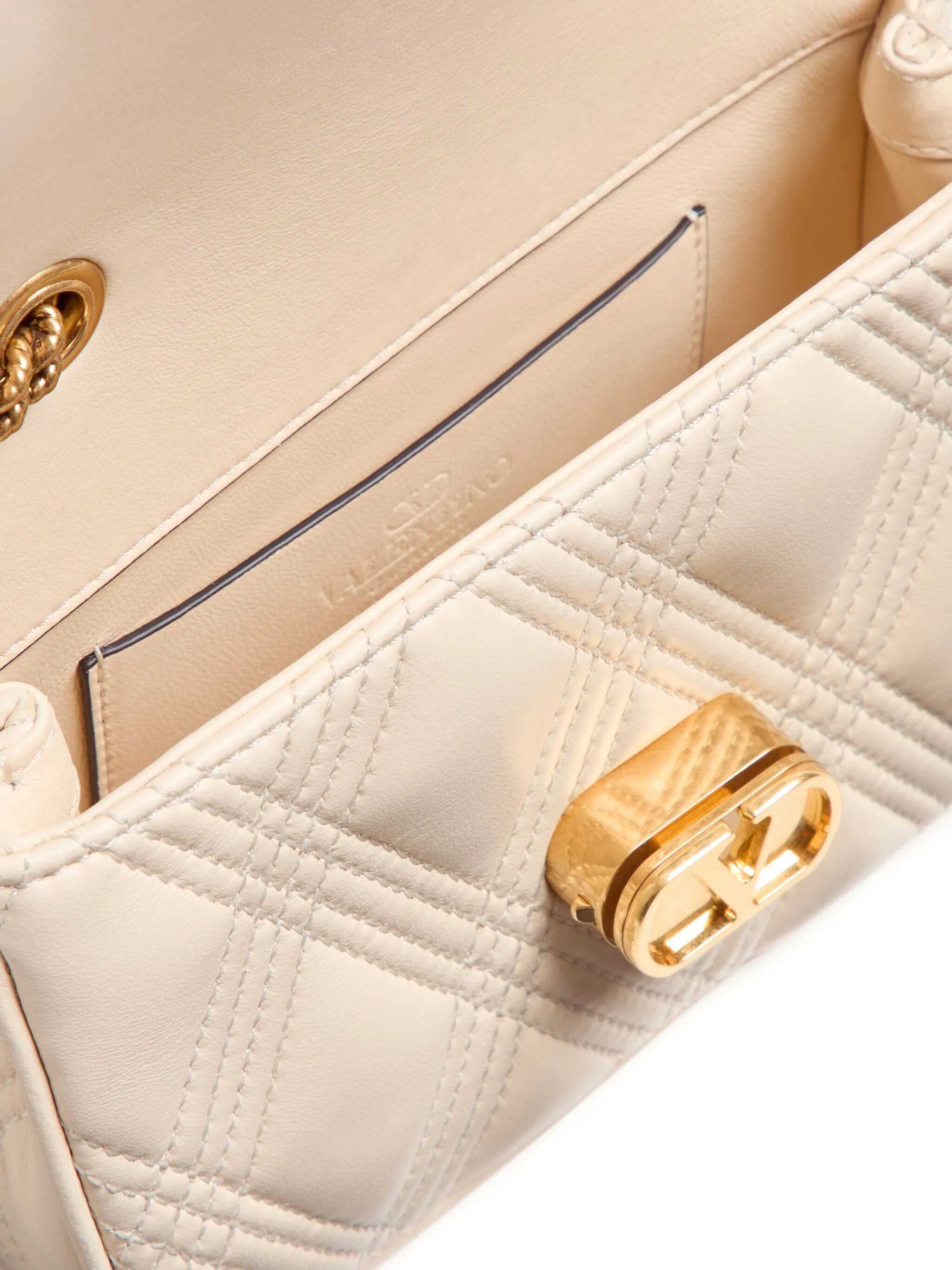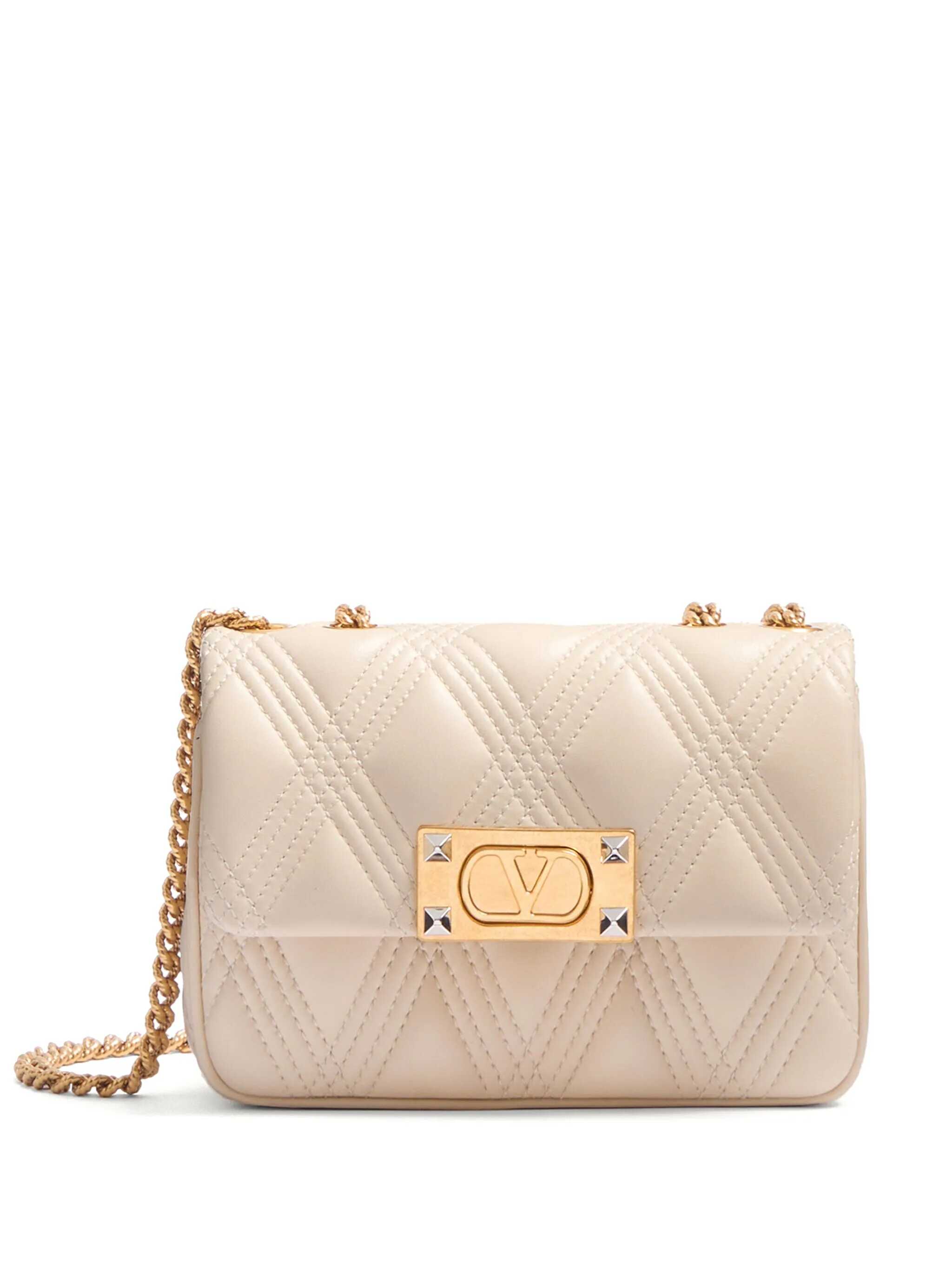 White leather Quiltie 67 shoulder bag from Valentinp Garavani featuring frontal fastening, chain, gold tone hardware, logo and pocket.