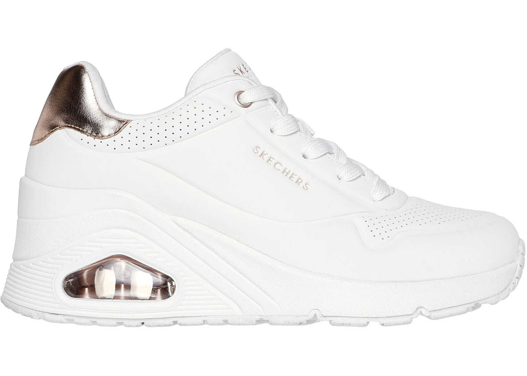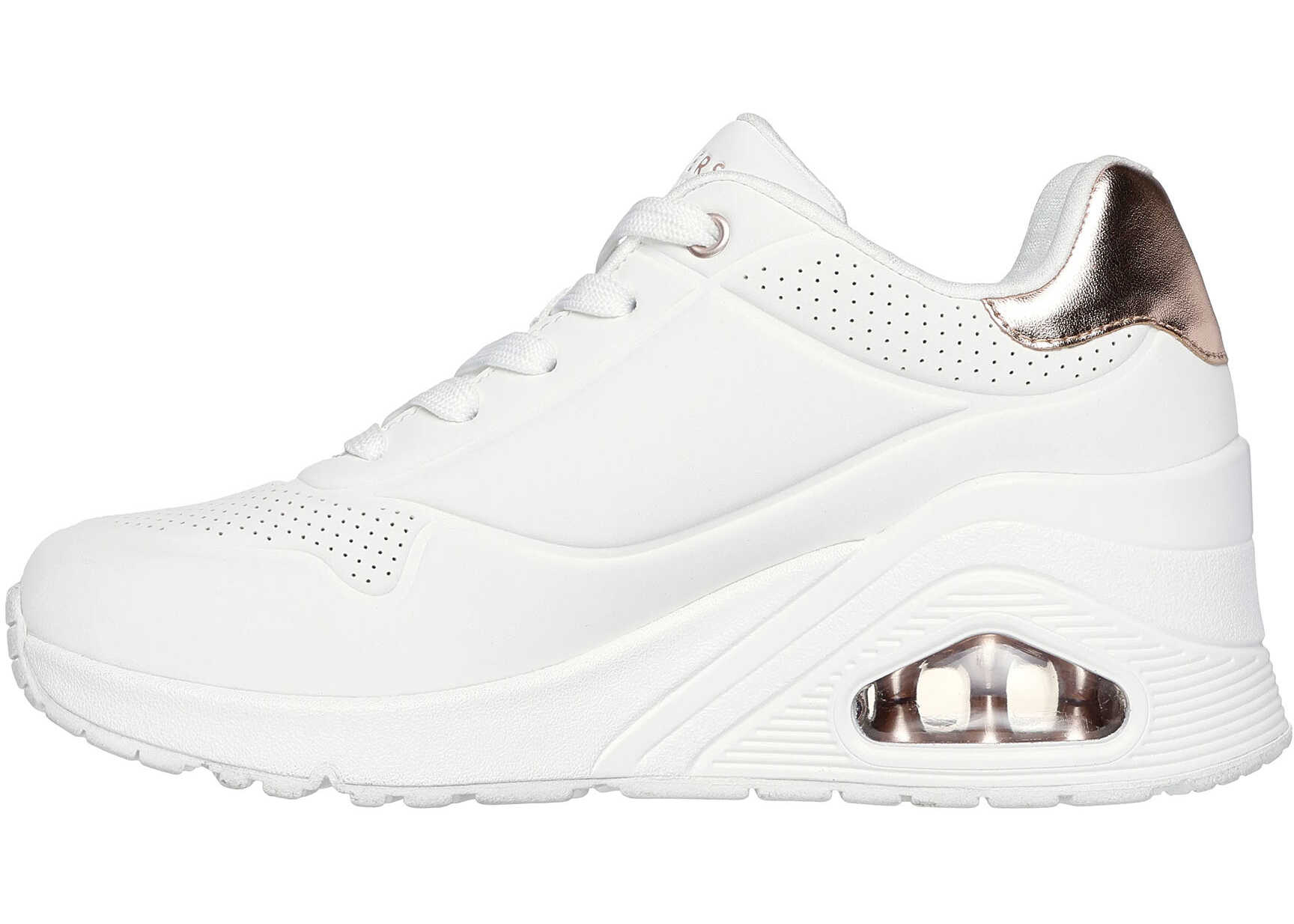 The Skechers Uno Wedge – Hi Steps 177520-WHT model offers a sleek design with exceptional comfort. Featuring a synthetic Durabuck upper with metallic accents, these sneakers ensure a modern look. The Air-Cooled Memory Foam® insole adapts to your foot's shape, providing all-day comfort and breathability. A visible Skech-Air® air cushion in the midsole absorbs impact, while the flexible rubber outsole delivers reliable traction.