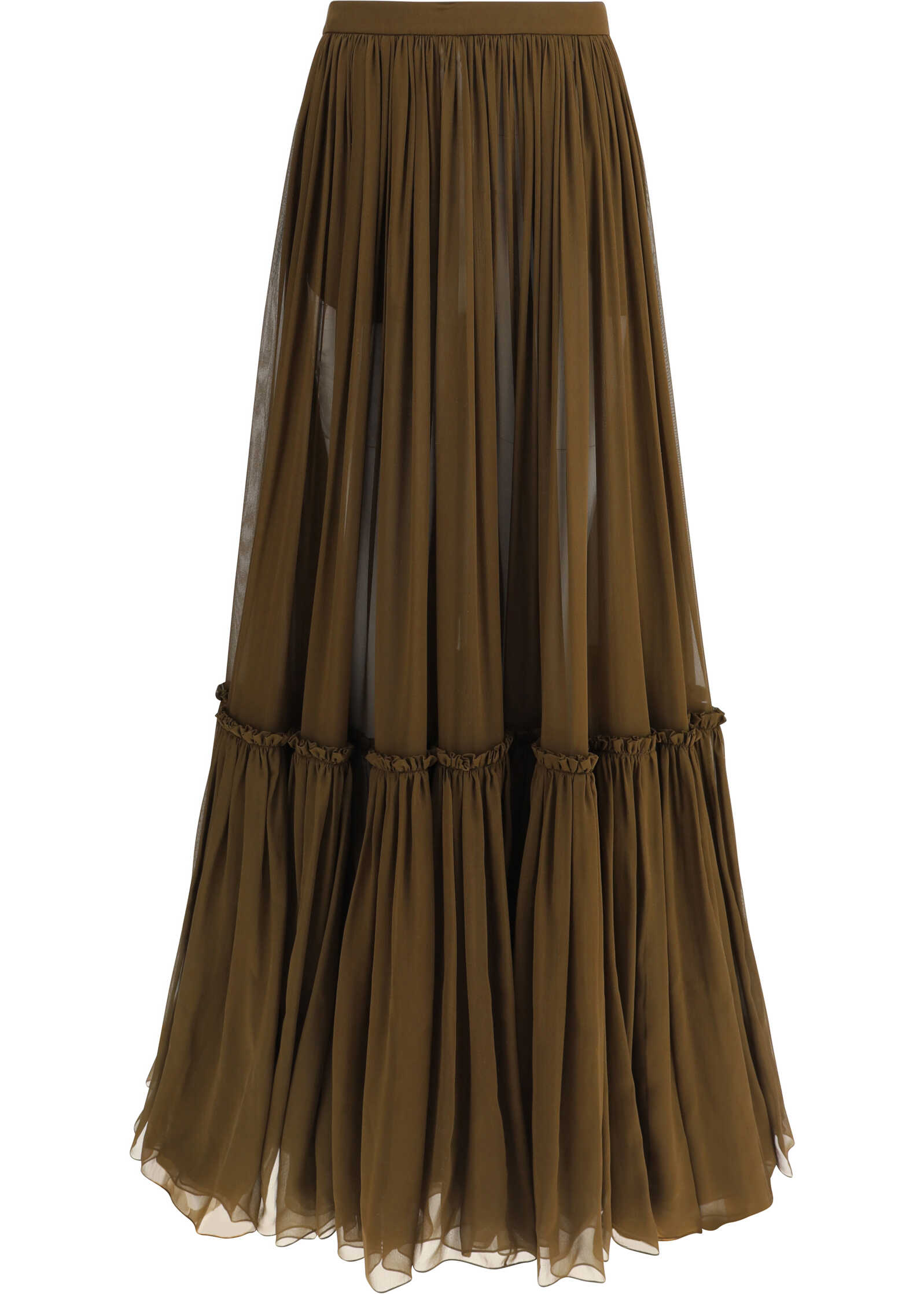 The Silk Crepe Muslin Long Skirt is an elegant and delicate garment with a flounced pattern that creates movement and lightness. The semi-transparency adds a touch of refined sensuality, while the hidden side zipper closure and two invisible side pockets combine functionality and style. A great choice for a sophisticated and flowing look, perfect for special occasions or elegant evenings.