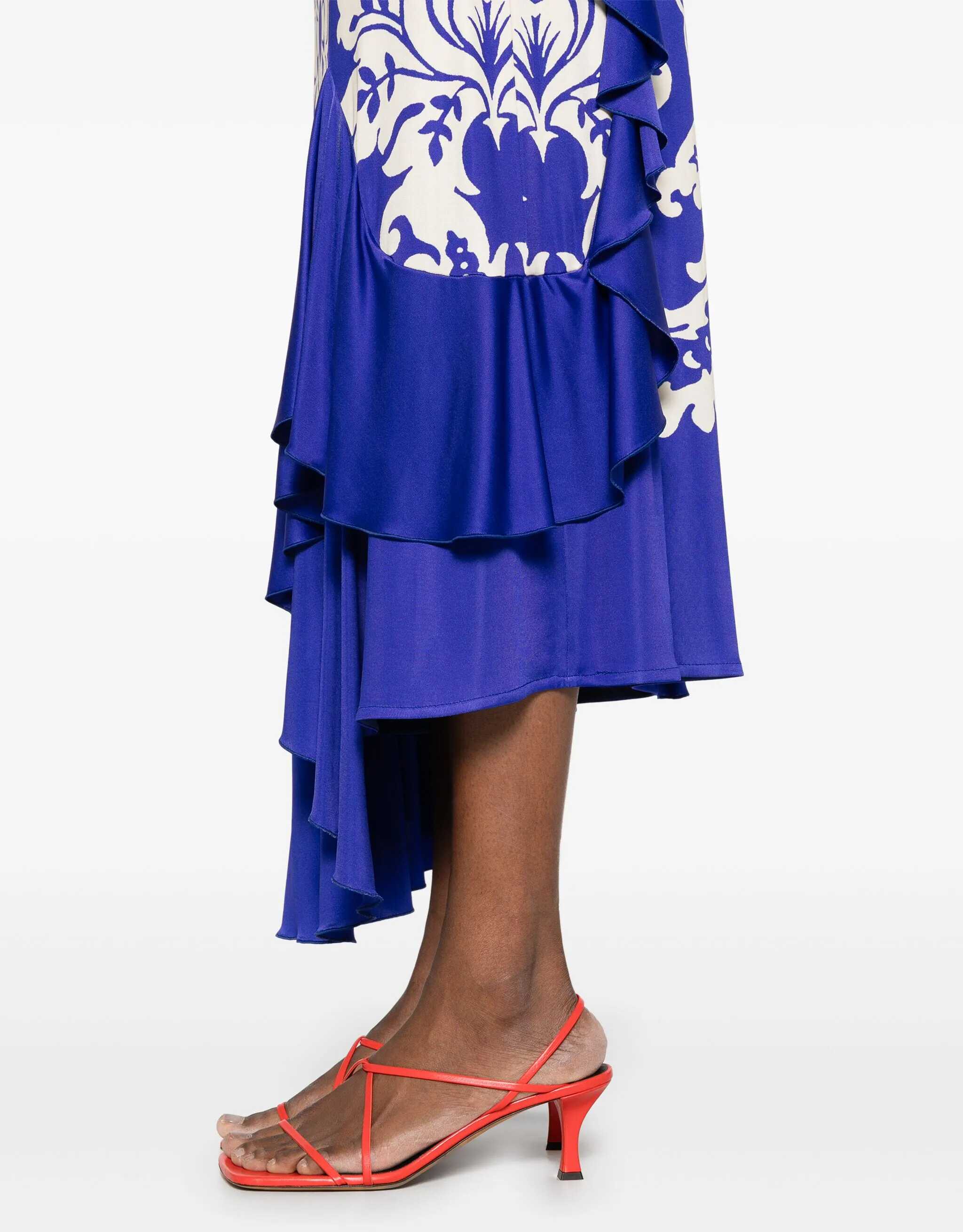 Long Dress by Etro with a modern and feminine design. Sleeveless model with U-neckline on the front, made of shiny jersey that enhances the silhouette with elegance. The skirt is finished with a soft draped flounce for a fluid and refined effect. Featuring a double print and cut-out back that leaves the lower back exposed, adding an unexpected sensual touch. Ideal for special occasions and elegant evenings.