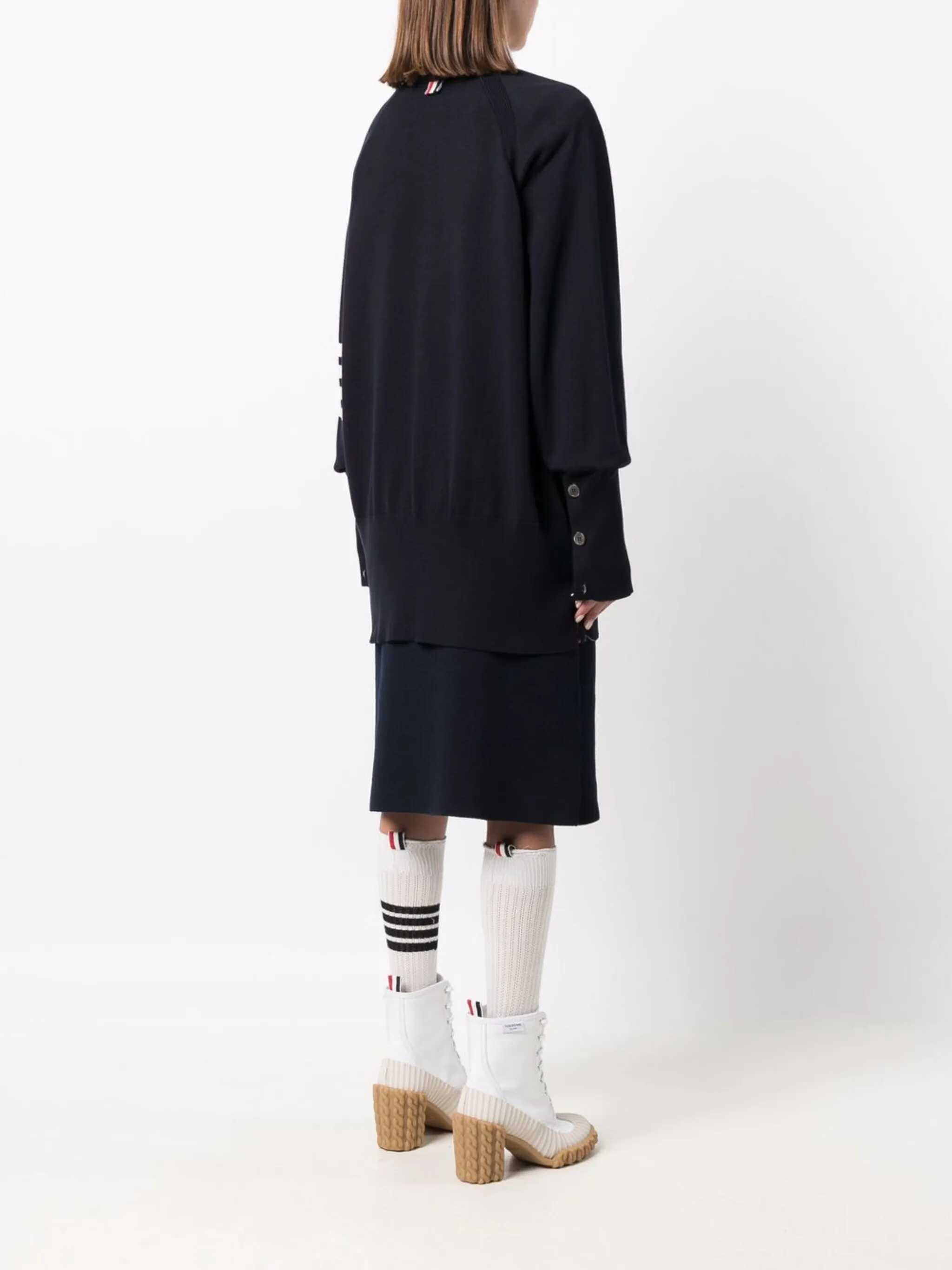 Thom Browne's oversized Cardigan features an elegant V-neck and front button closure. The garment is embellished with a striped grosgrain detail under the placket and raglan shoulders, enhancing its contemporary design. The distinctive white 4-Bar detail on the left sleeve and striped grosgrain tab behind the collar add a distinctive touch. With two patch pockets on the front and ribbed trim, this cardigan combines style and comfort in a refined way.