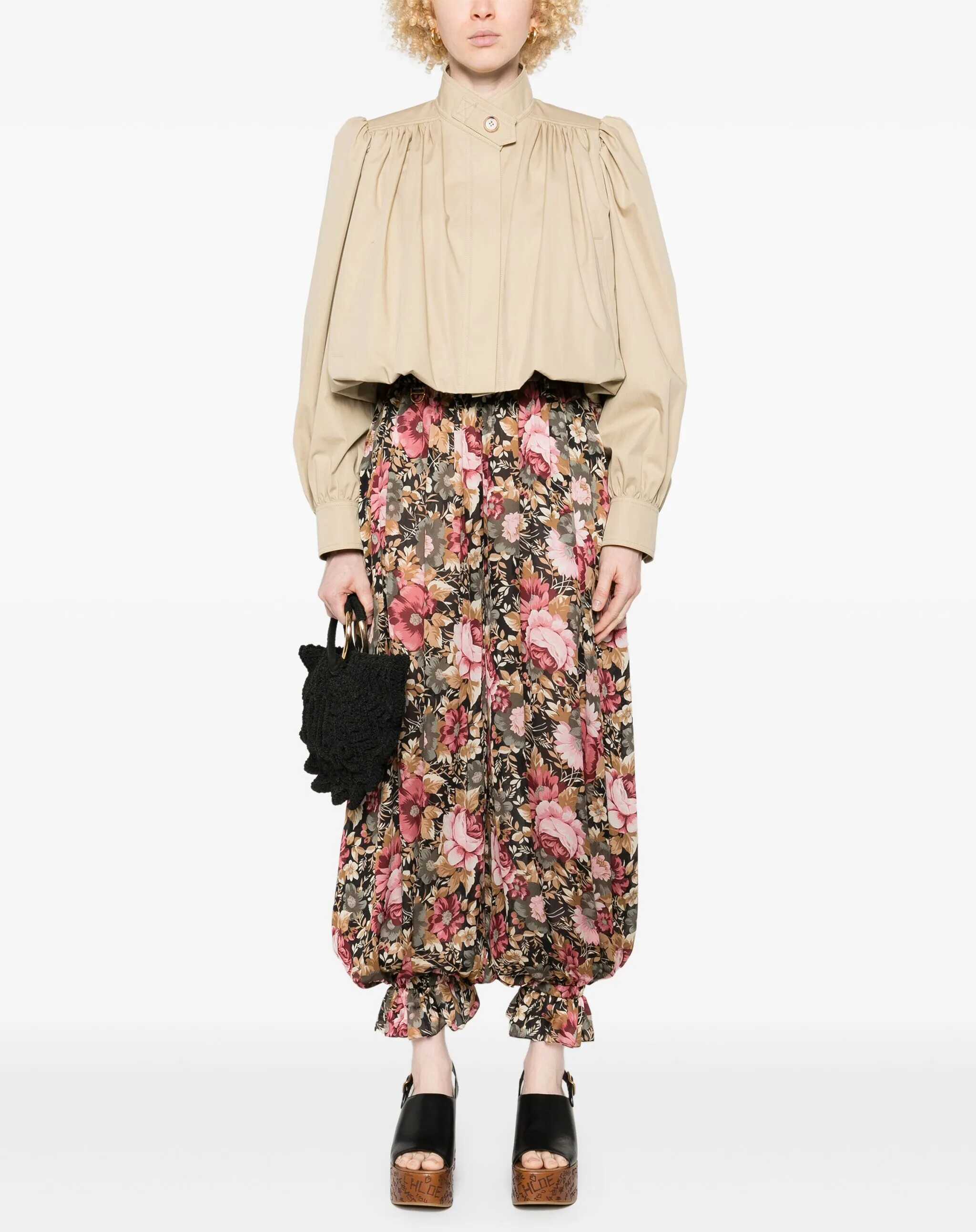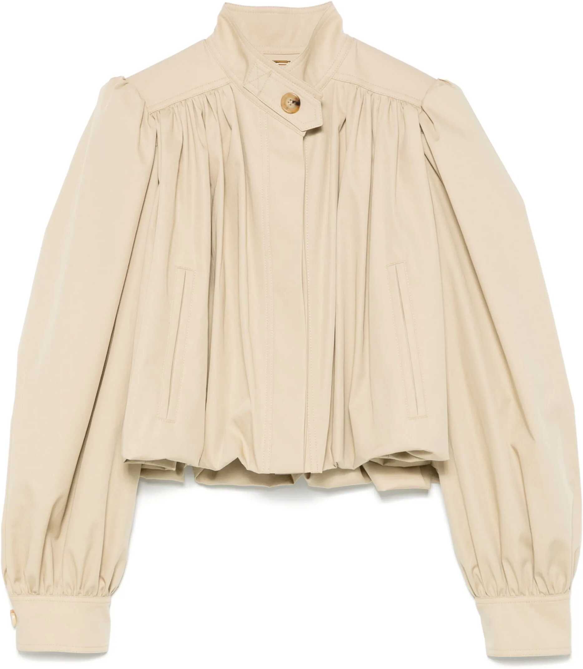 Cotton Jacket by Chloé features a cropped, oversized design that gives a bold, modern look. The mandarin collar adds a touch of minimal elegance, while the front closure with hidden flap buttons keeps the garment clean and sophisticated. Ruffle details on the sleeves and shoulders lend a feminine and original touch. The two side welt pockets complete the design, offering functionality and style.