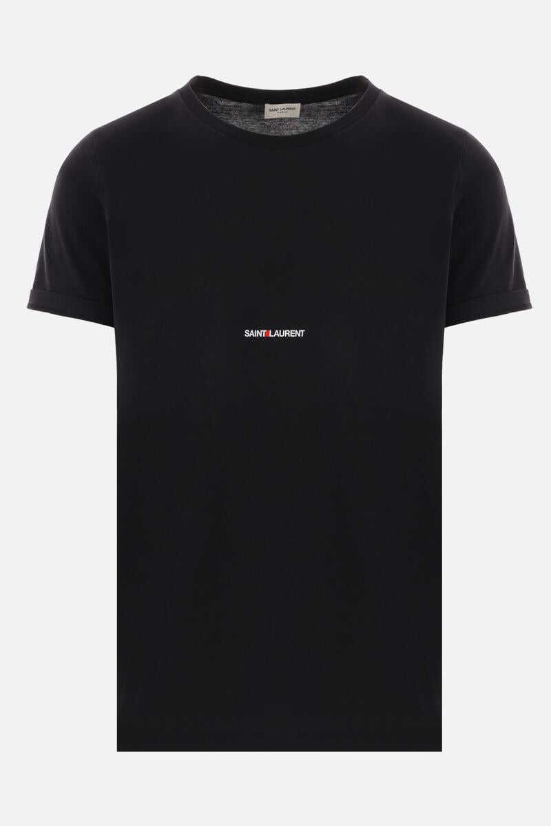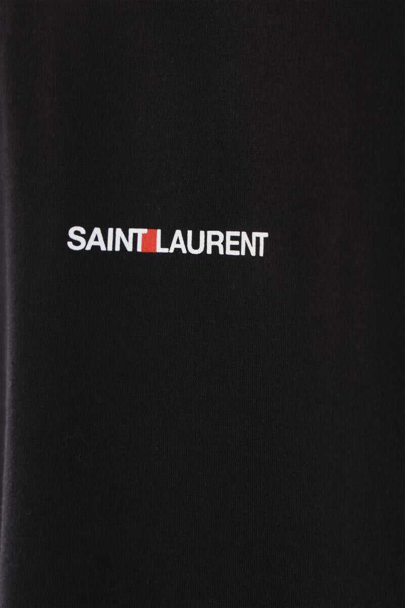 Saint Laurent's t-shirt crafted in black cotton jersey with "Saint Laurent" print at chest. It features crew neck, short sleeves and back shorter hem with raw edge.
