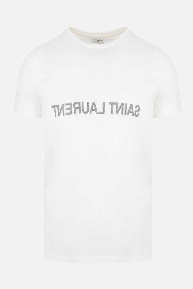 Saint Laurent's t-shirt crafted in ivory cotton jersey with logo print on the inside. It features crew neck, short sleeves and straight hem with raw-cut edge at back.