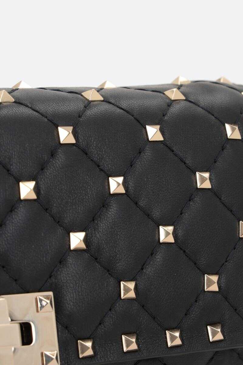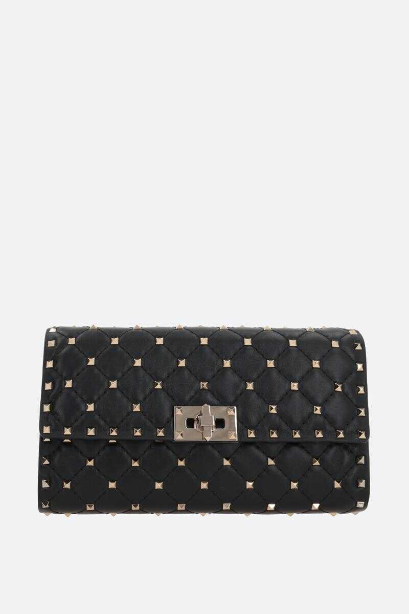 Valentino Garavani's chain clutch crafted in black quilted nappa adorned with signature platinum-tone metal studs. Featuring twist-lock closure on flap and removable chain strap. Black leather-lined interior with zip / slip pockets and eight card slots.