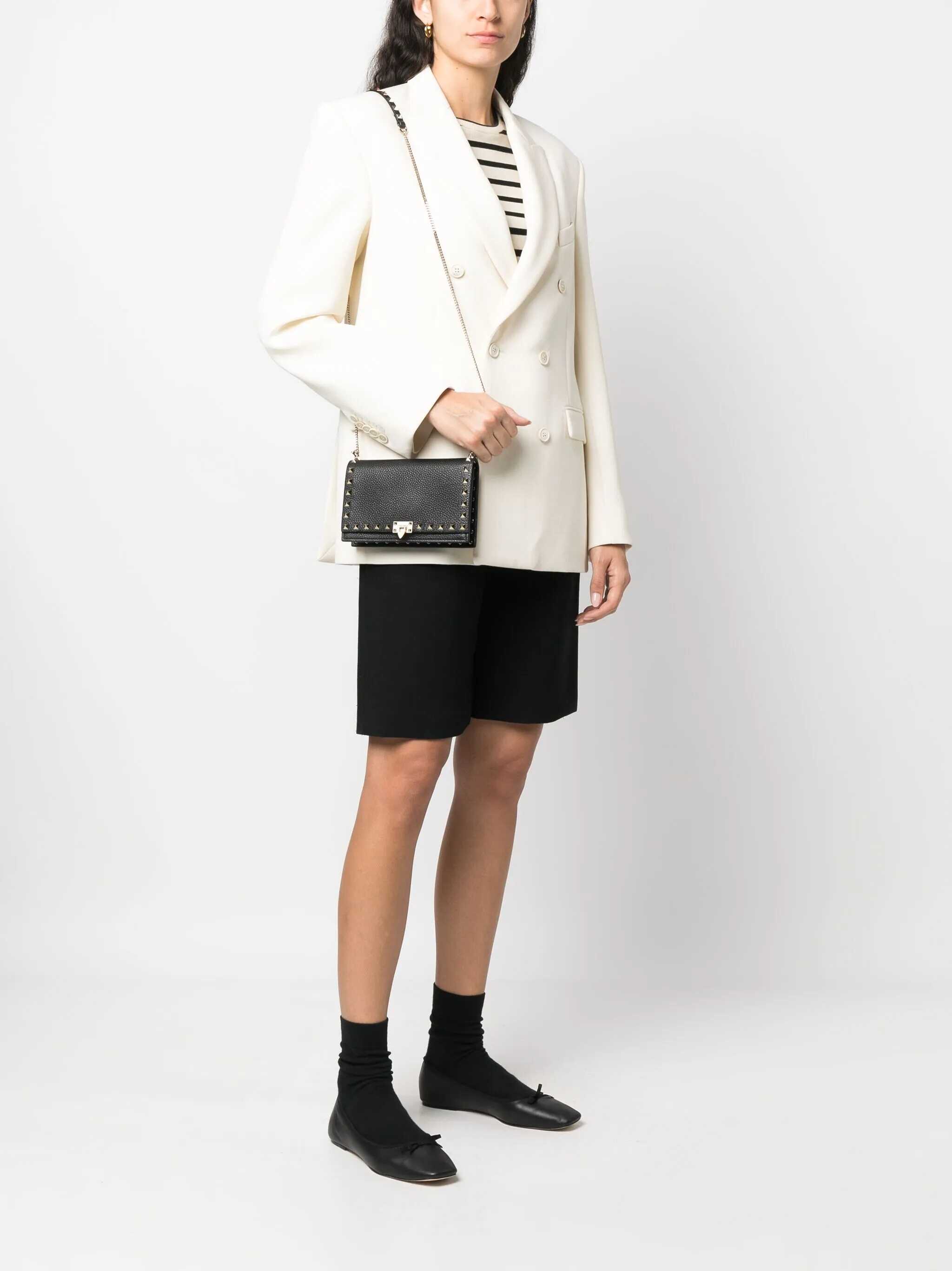 Valentino Garavani crossbody bag crafted in black grainy leather, embellished with signature platinum-tone metal studs. Features a flap closure with hook and a removable chain shoulder strap. The tone-on-tone leather-lined interior includes a zip pocket and three card slots. The design is completed with the iconic embossed logo lettering on the back.