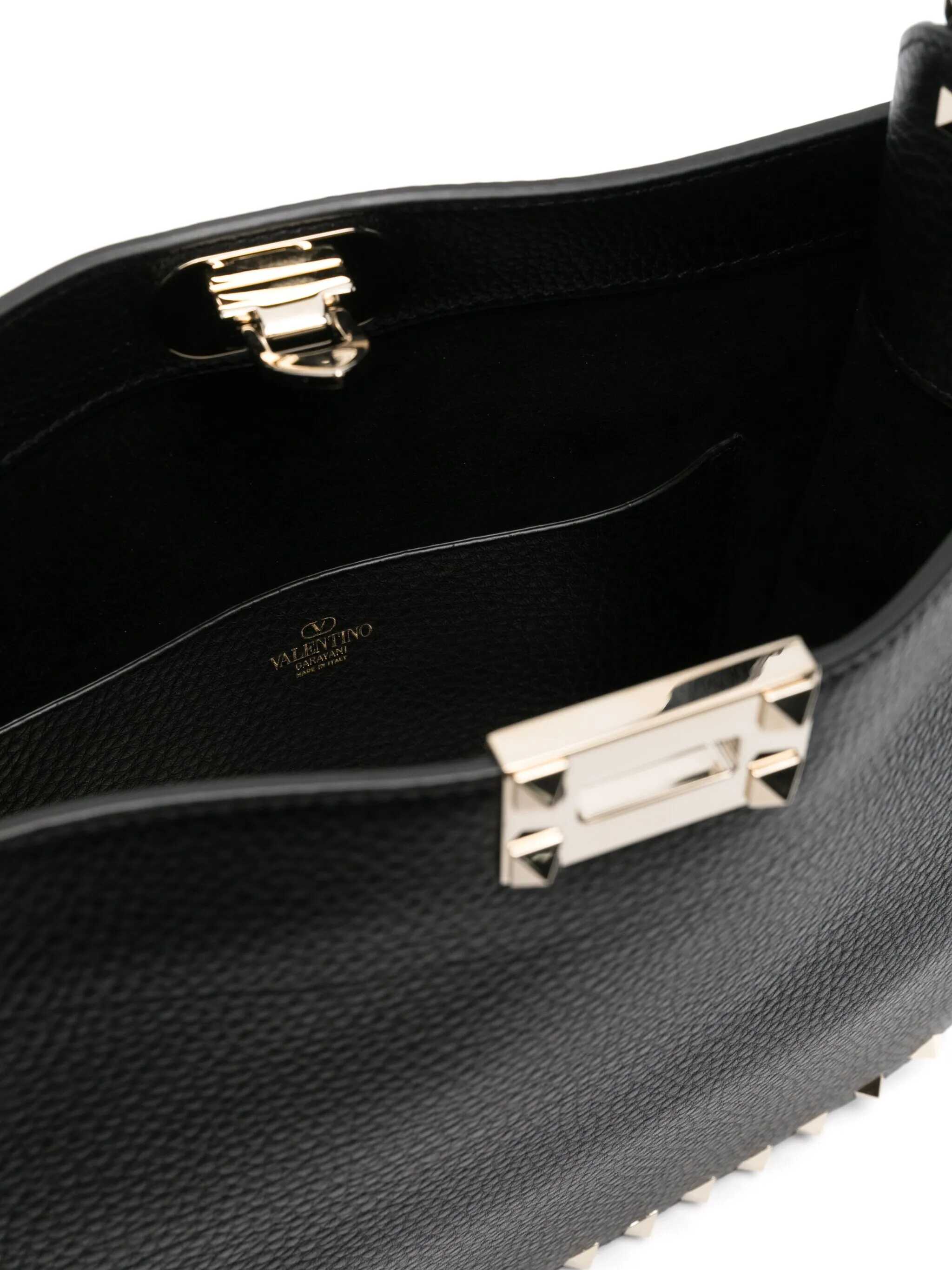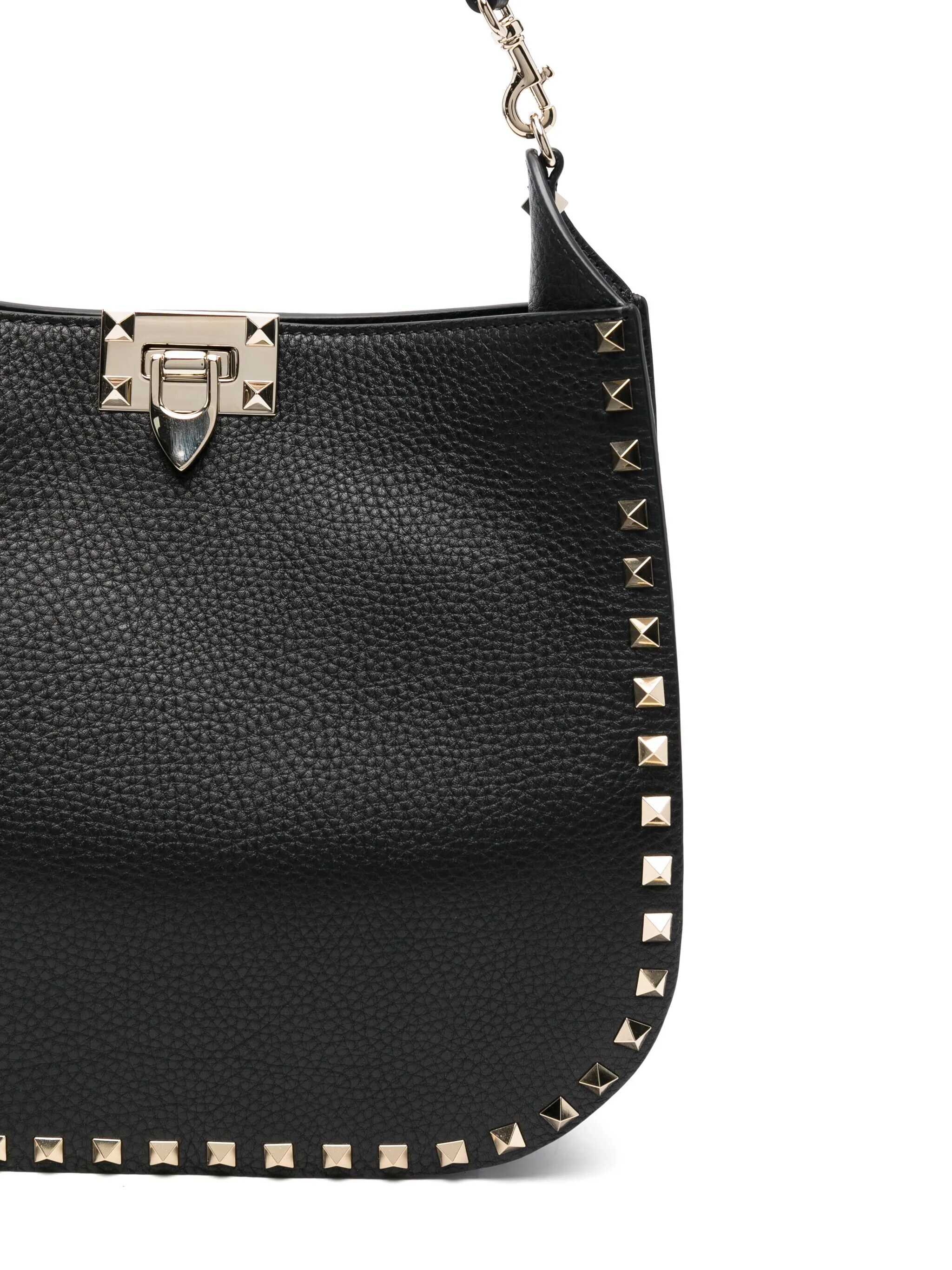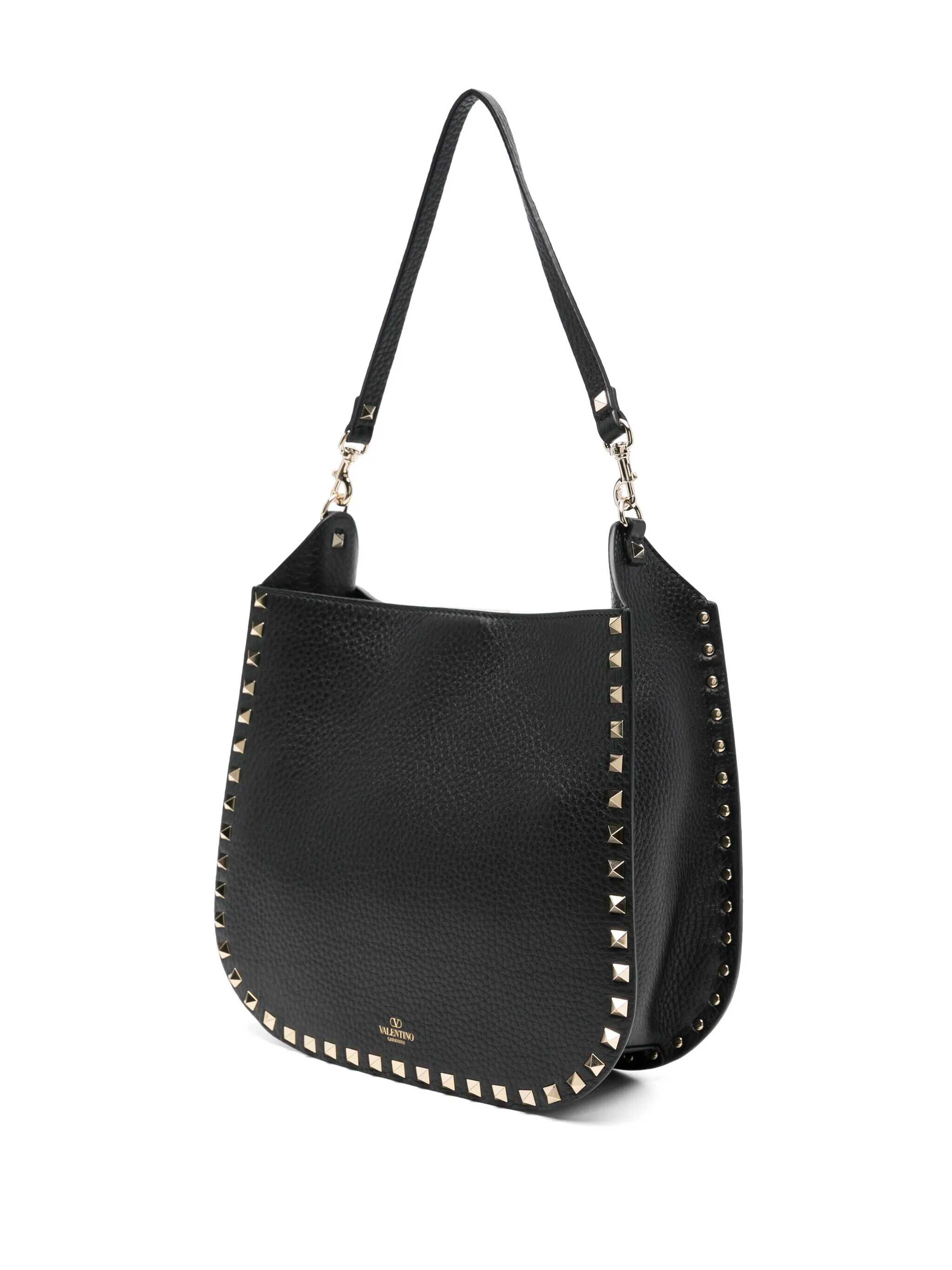 Valentino Garavani's hobo bag crafted in black grained leather adorned with signature ruthenium-tone metal studs. Featuring hook fastening, removable handle and adjustable / removable fabric strap. Tone-on-tone suede-lined interior with slip pocket. The design is completed by the unmistakable logo embossed at back.