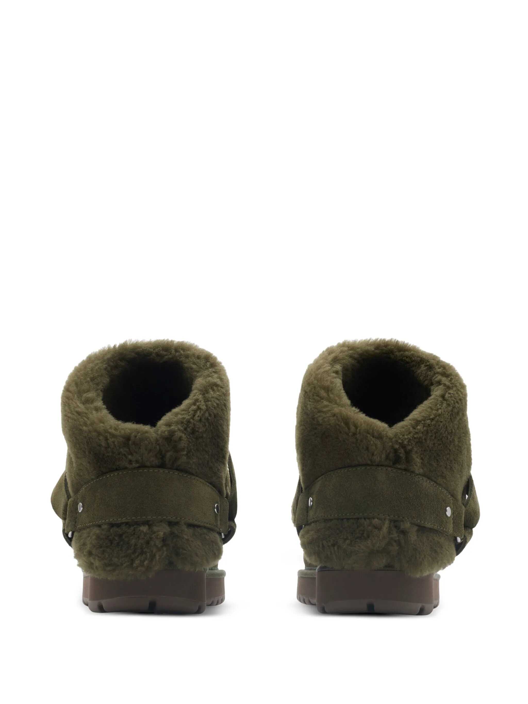 Burberry's ankle boots crafted in dark green suede with a shearling collar. Featuring a round-toe silhouette, front adjustable strap with metal buckle, shearling lining and rubber sole.