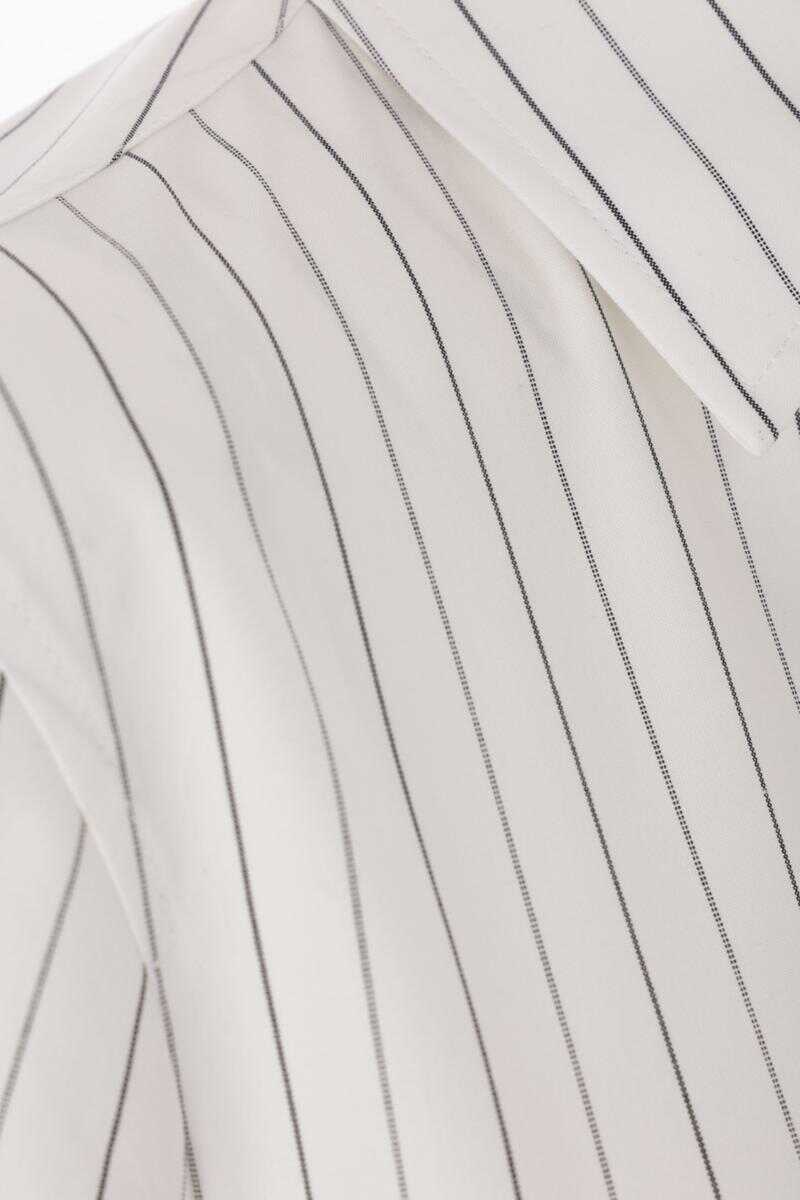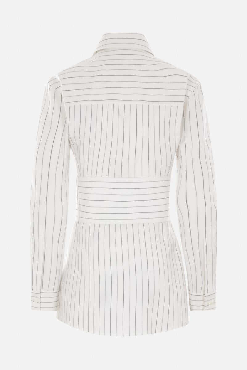 Burberry shirt crafted from white cotton with a striped pattern. Featuring a classic collar, front button closure, chest patch pocket, long sleeves with buttoned cuffs, a rounded hem and a wide belt with an oversized B-shaped buckle.