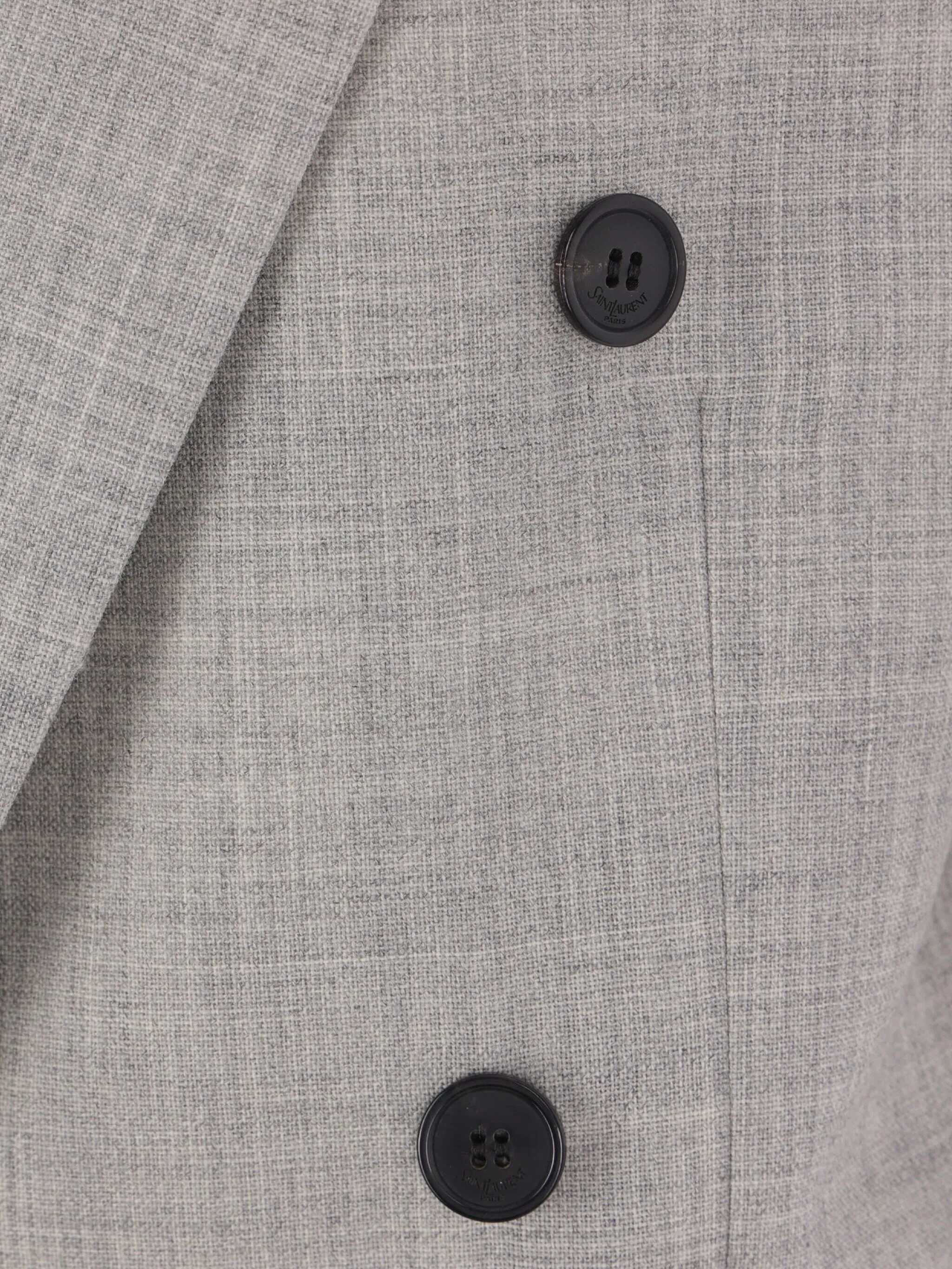 Saint Laurent double-breasted jacket crafted from grey wool chiné. Featuring peaked lapels, front button closure, padded shoulders, multiple pockets, long sleeves with buttoned cuffs, and side slits. Fully lined in silk.