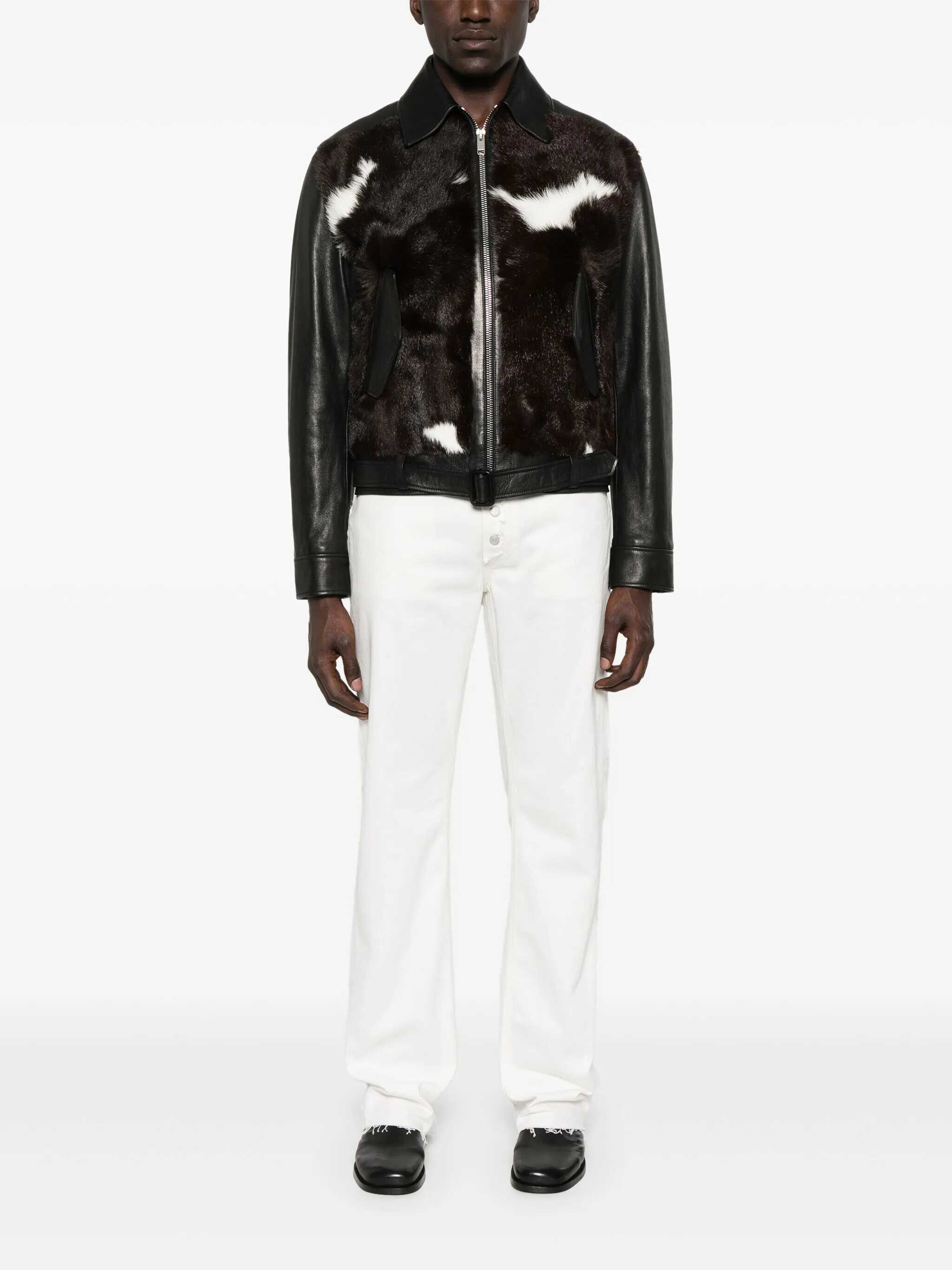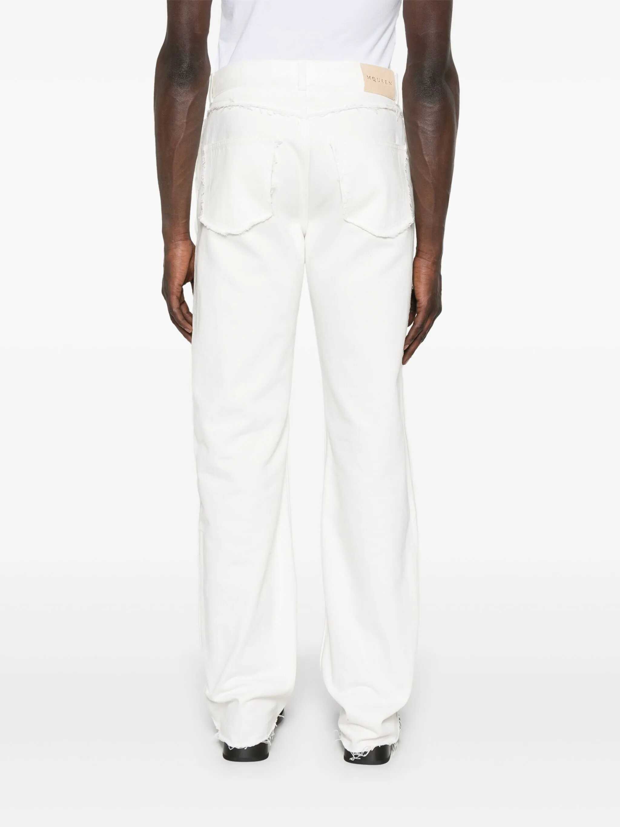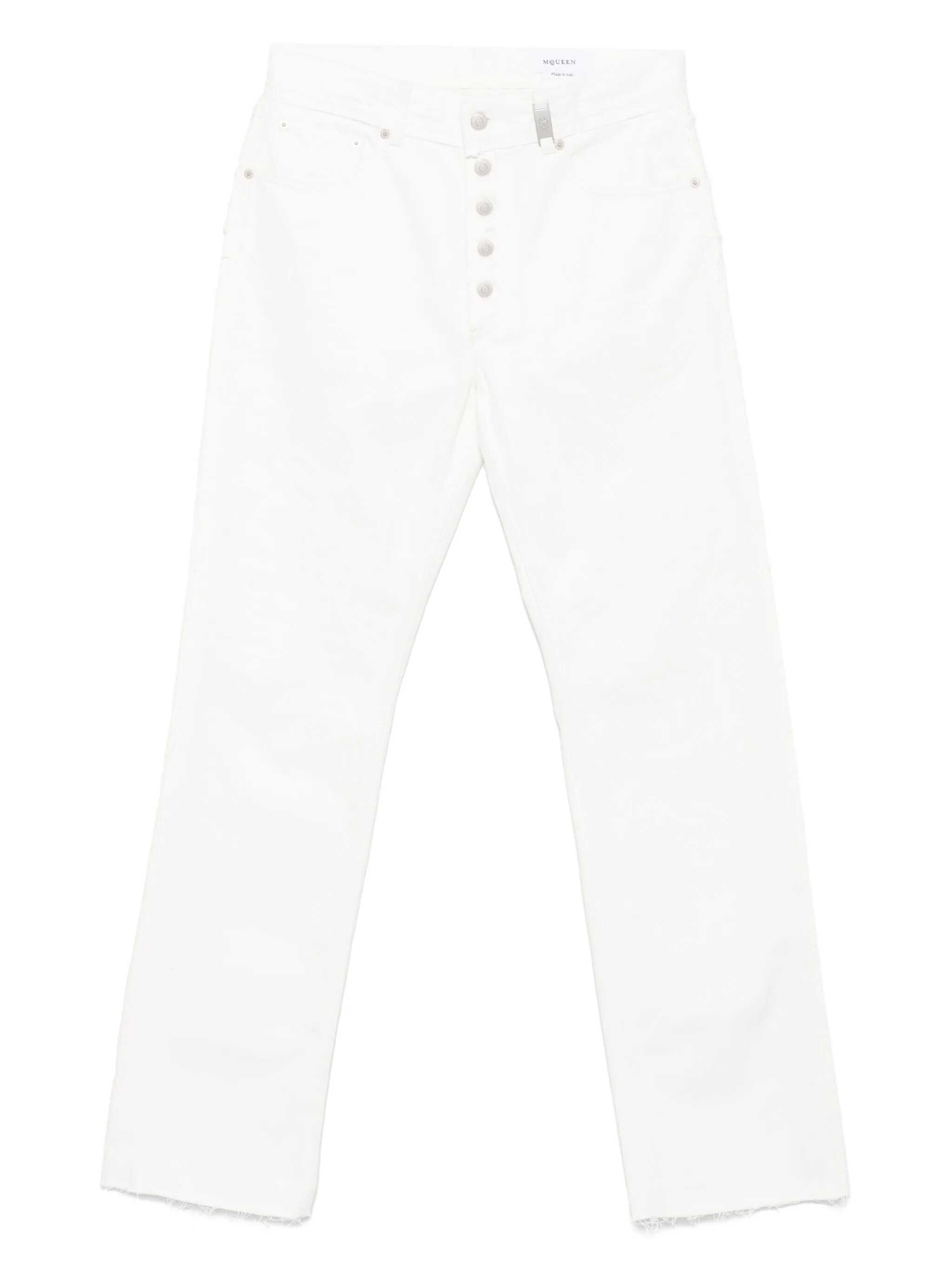 Alexander McQueen straight-leg jeans crafted from white cotton denim with raw-cut edges. Featuring a front closure with metal buttons, belt loops, and a leather logo patch on the back. The design is completed by a metal plate with an engraved Skull detail on the front belt loop.