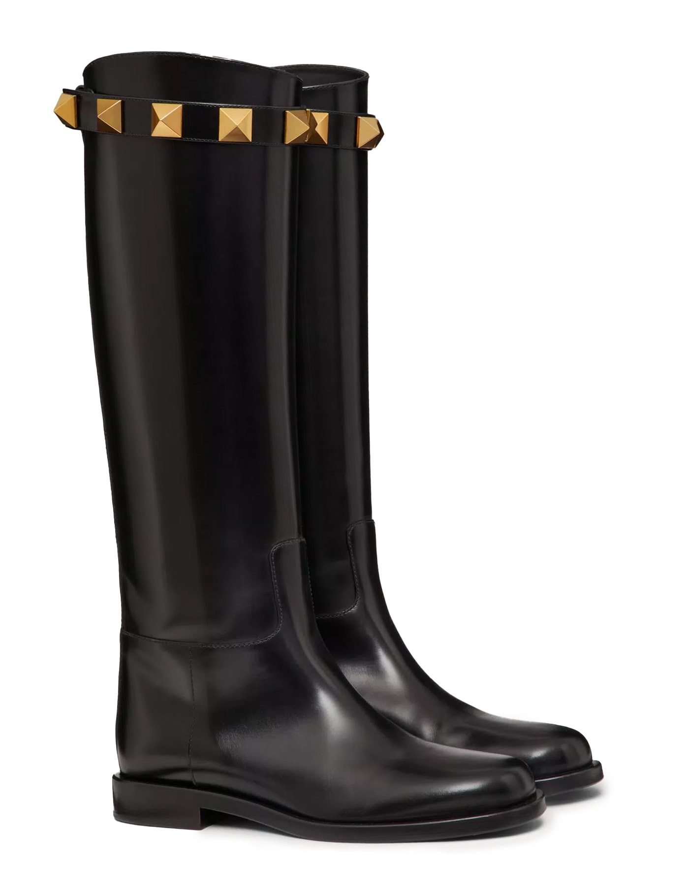 Leather Roman Stud knee-boots by Valentino Garavani with removable strap with iconic Roman Studs in antique brass-finish. Leather interior and leather sole with non-slip rubber insets.