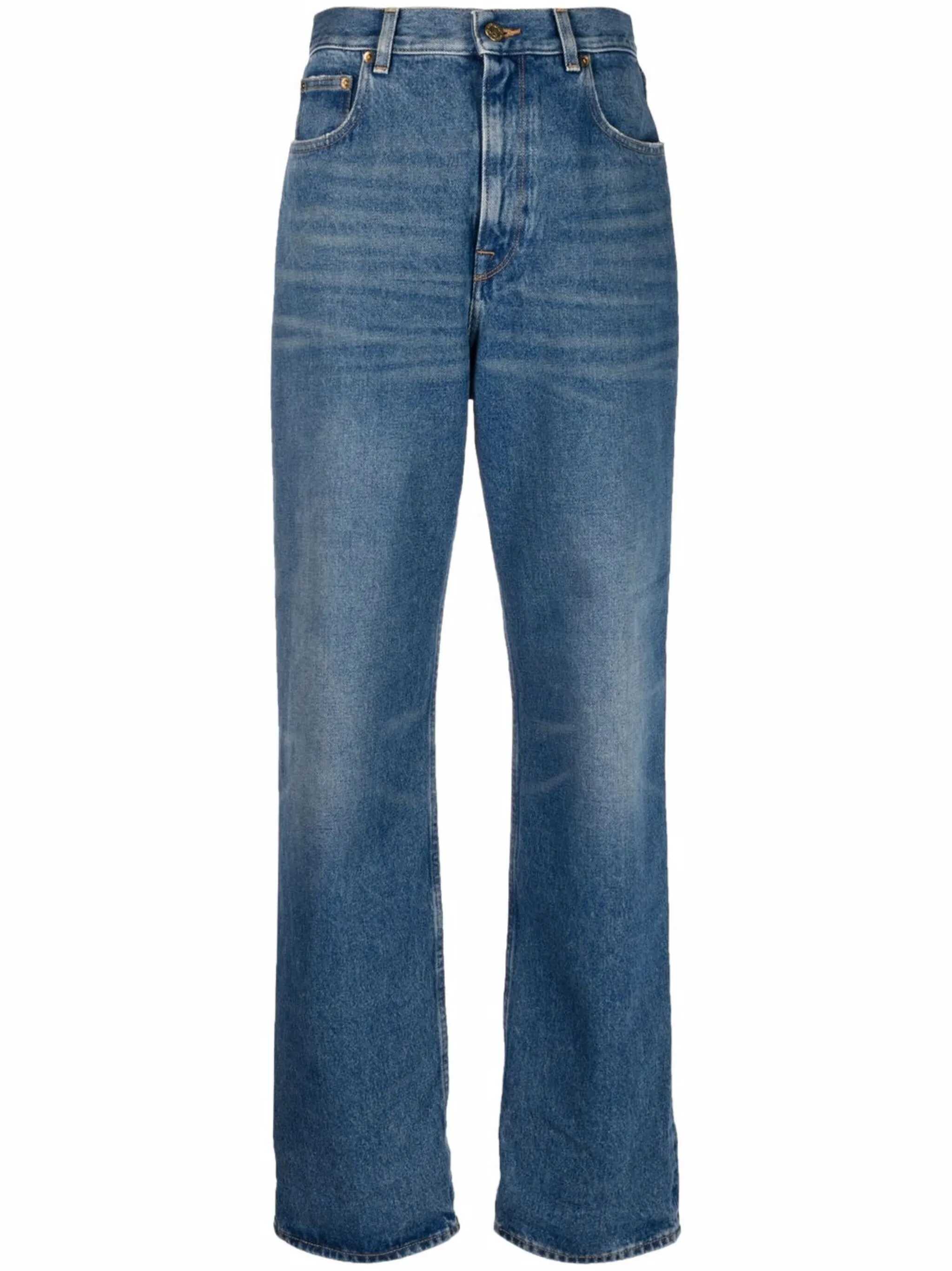 Removable logo application, bronze stud detail, high waist, wide leg fit, belt loops, front button and zipper closure and classic five pocket design. Material: Cotton.