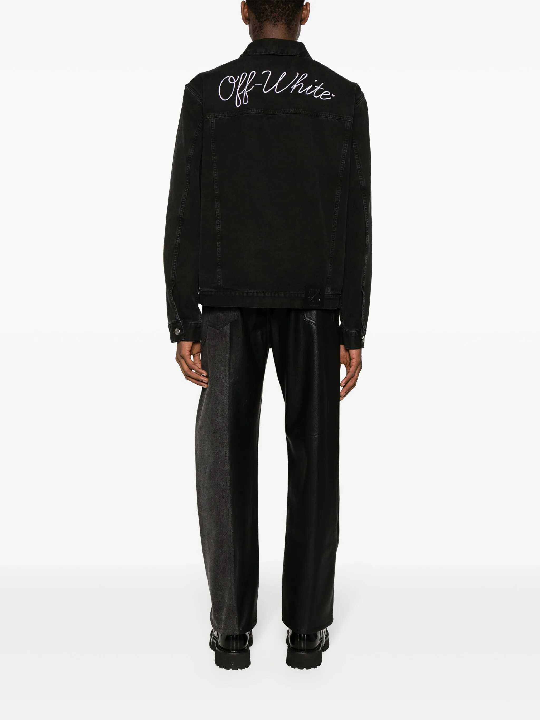 Off-White jacket made from black cotton canvas with an embroidered logo on the back. Featuring a shirt collar, front metallic button closure, front pockets, long sleeves with buttoned cuffs, and a straight hem with a logo patch on the back.